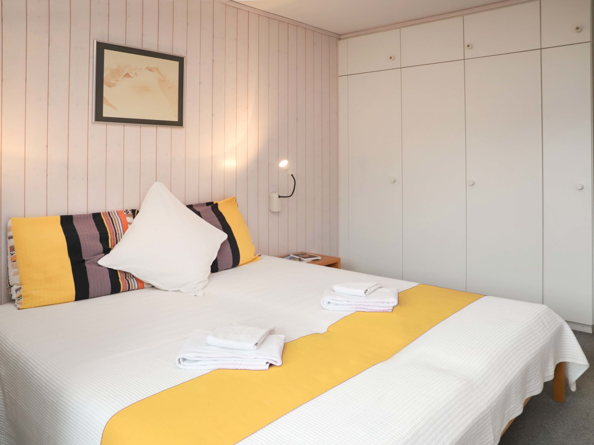 "Arlette Nr. 34", 2-Zimmer-Wohnung 36 m2 im 1. Stock, Südlage. Hell, zweckmässig und komfortabel eingerichtet: Wohn-/Esszimmer mit Esstisch, Kabel-TV, Flachbildschirm und Stereoanlage. Ausgang zum Balkon. 1 Zimmer mit 1 Doppelbett (2 x 90 cm, Länge 200 cm). Ausgang zum Balkon. Kleine, offene Küche (Backofen, 4 Glaskeramikplatten, elektrische Kaffeemaschine, Fondue Set (Chinoise, Käse)). Dusche/WC. Balkon, Südlage. Balkonmöbel, Liegestühle. Sehr schöne Panoramasicht auf die Berge, die Landschaft und die Ortschaft. Zur Verfügung: Internet (Wireless LAN, gratis). Parkplatz Nr. 34. Bitte beachten: Nichtraucher-Unterkunft.