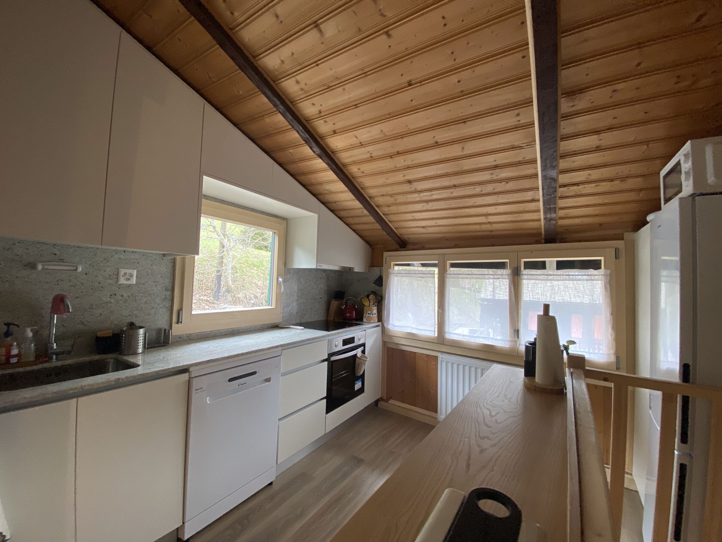 Séjour avec cheminée - WIFI - TV - Coin cuisine avec lave vaisselle- Salle à manger - espace ouvert avec place assise - WC séparé - Douche - WC - 2 place de parking extérieur (bord de route au dessus du chalet) - 1 chambre à 1 lit pour 2 personnes = 2 - 1 chambre à 1 lit à étage (140x190) pour 4 personnes = 4 - 1 canapé lit pour 2 personnes