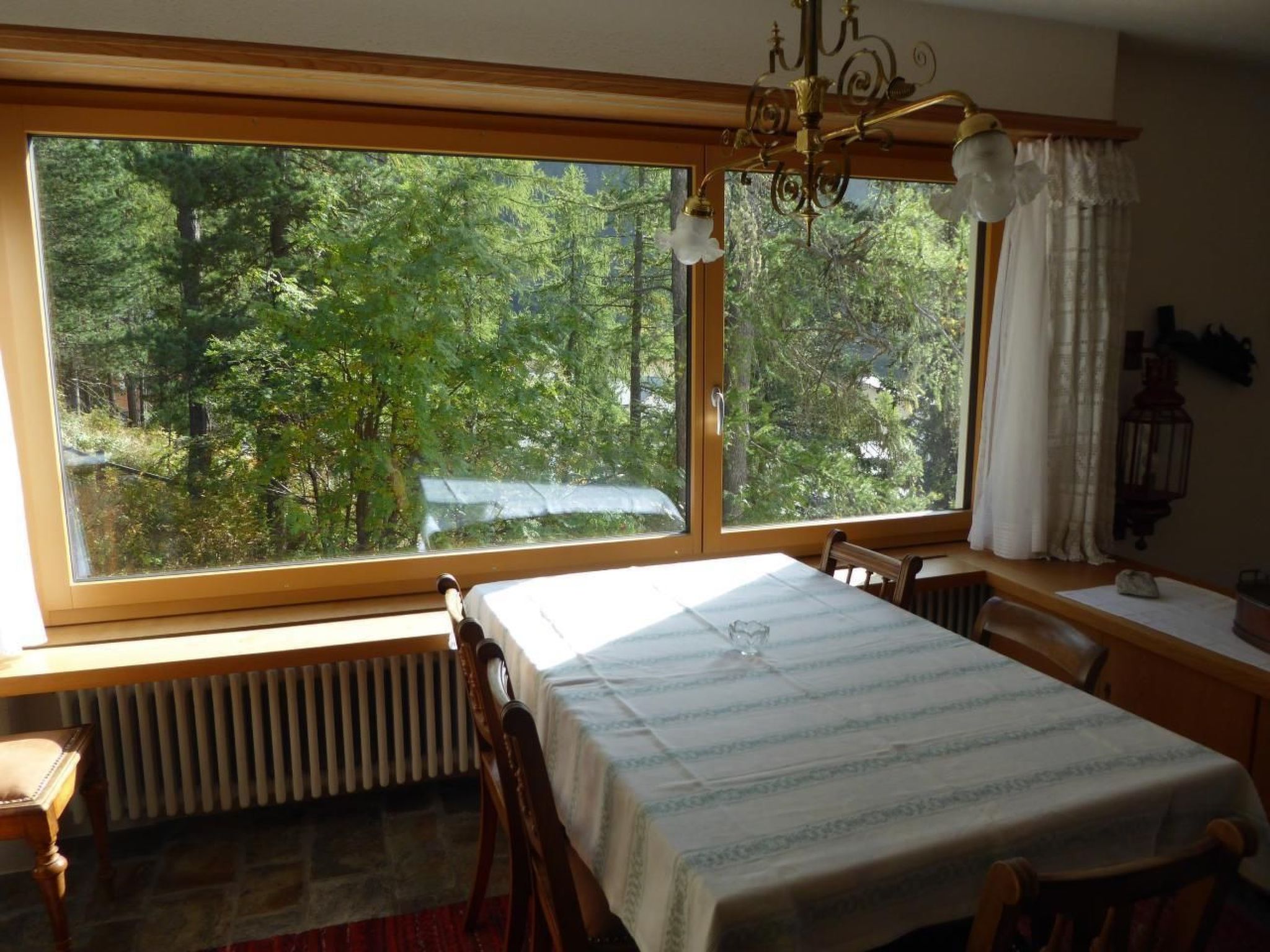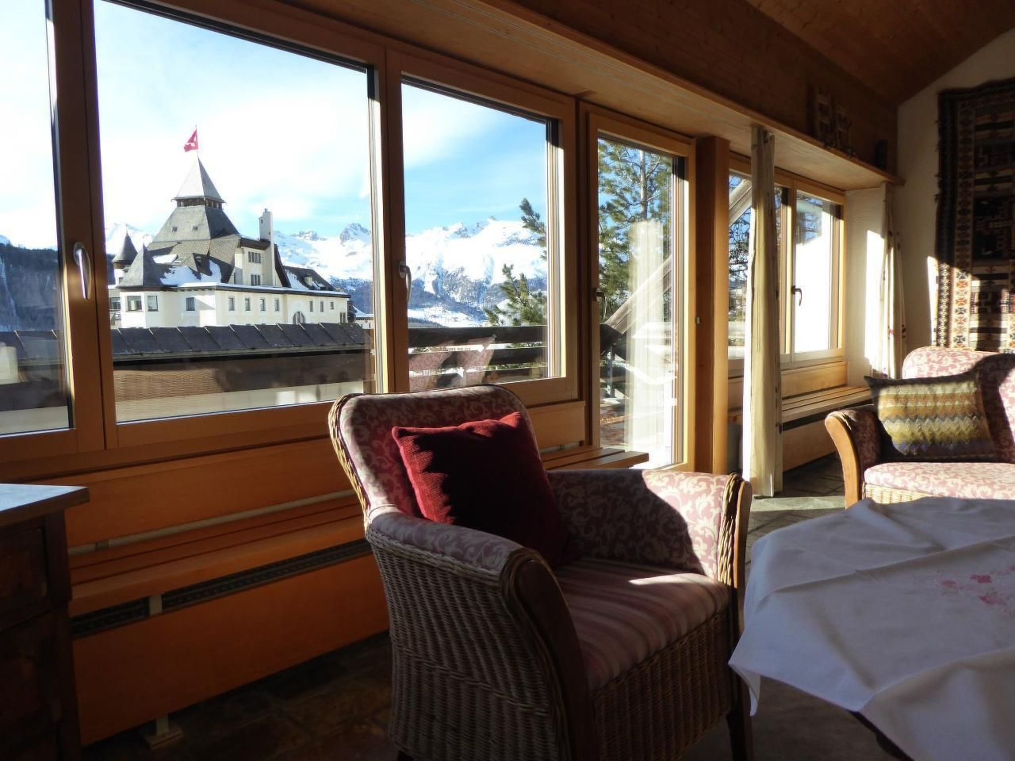 Die 150 m² grosse Wohnung befindet sich im obersten von drei Terrassenhäusern und bietet wunderbare Ausblicke: der Blick vom Wohnbereich aus über die ganze Julierkette ist zu jeder Tageszeit fantastisch. Vom Essplatz aus sieht man in den Wald – hier kommen einem die Eichhörnchen manchmal schon zum Frühstück besuchen. Auch die Abendsonne auf der Segantinihütte hat man im Blick.