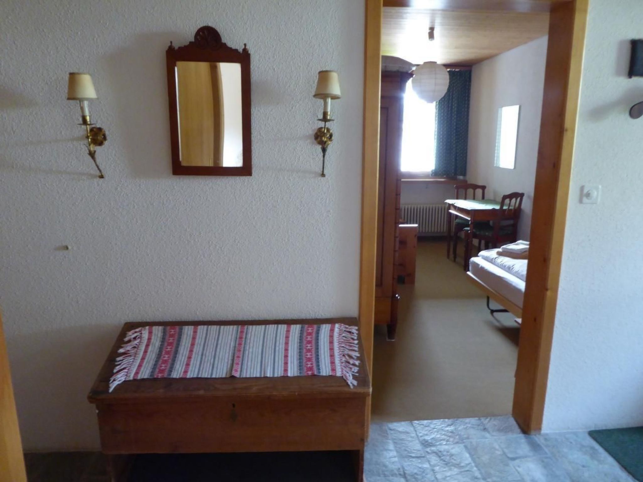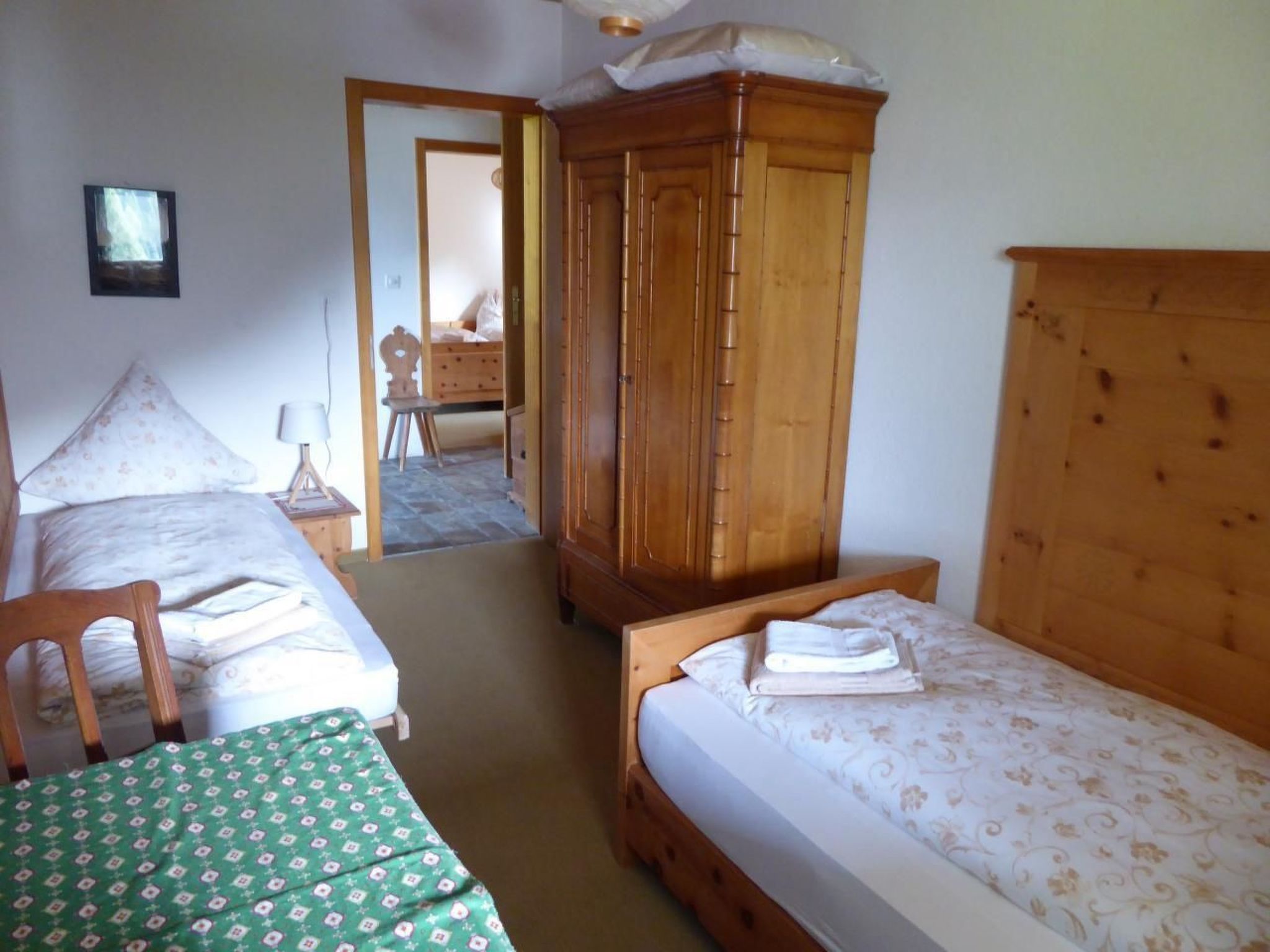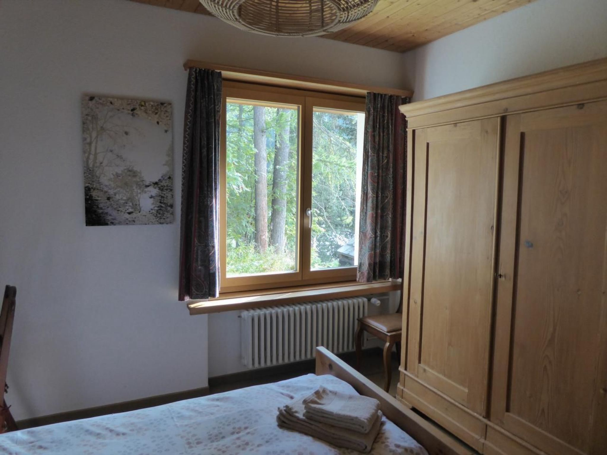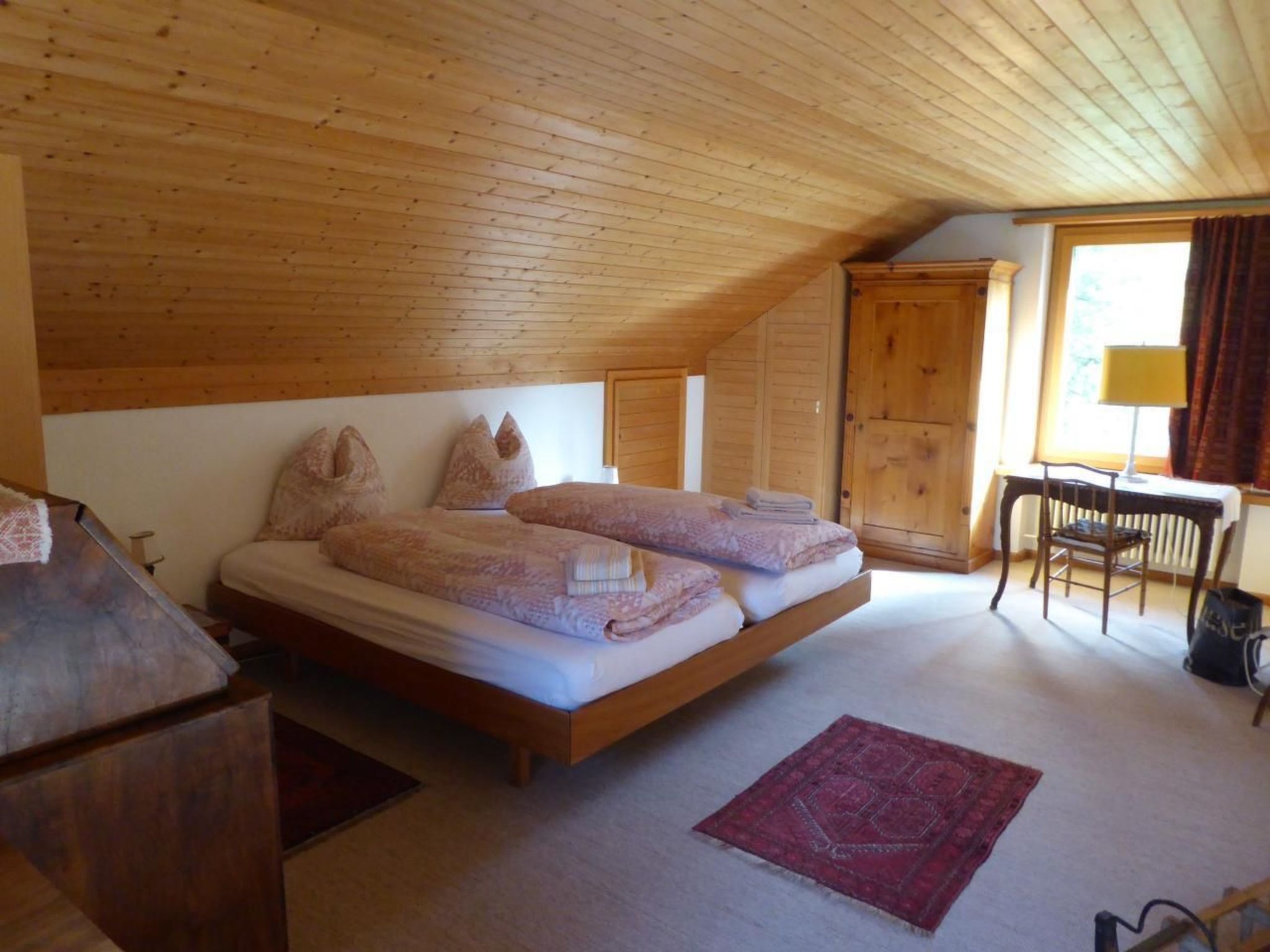 Über dem Wohnbereich befindet sich eine geräumige Galerie mit zwei Fenstern. Hier steht ein Doppelbett mit Nachttischchen. Genügend Platz zum Versorgen von Ausrüstung und Kleidern bieten ein Schrank, eine Kommode sowie ein Wandkästchen. Zwei Arbeitsplätze mit Ausblick in den Wald oder übers Dorf laden zum Schreiben oder Lesen ein. Im unteren Stock (Eingangsebene) befinden sich zwei Schlafzimmer: ein Doppelzimmer mit grossem Schrank und ein Zimmer mit zwei getrennten Betten, Schrank, Tisch und Stühlen (Arventäfer). Daneben liegt ein geräumiges Badezimmer mit Bad, Dusche, WC und Waschmaschine. Auf der Terrasse und dem lauschigen Plätzchen am hintern Ausgang stehen Tische, Stühle und zwei Liegestühle zur Verfügung. In der eigenen Garage (mit Abstellplatz) besteht die Möglichkeit, die Skis zu deponieren.