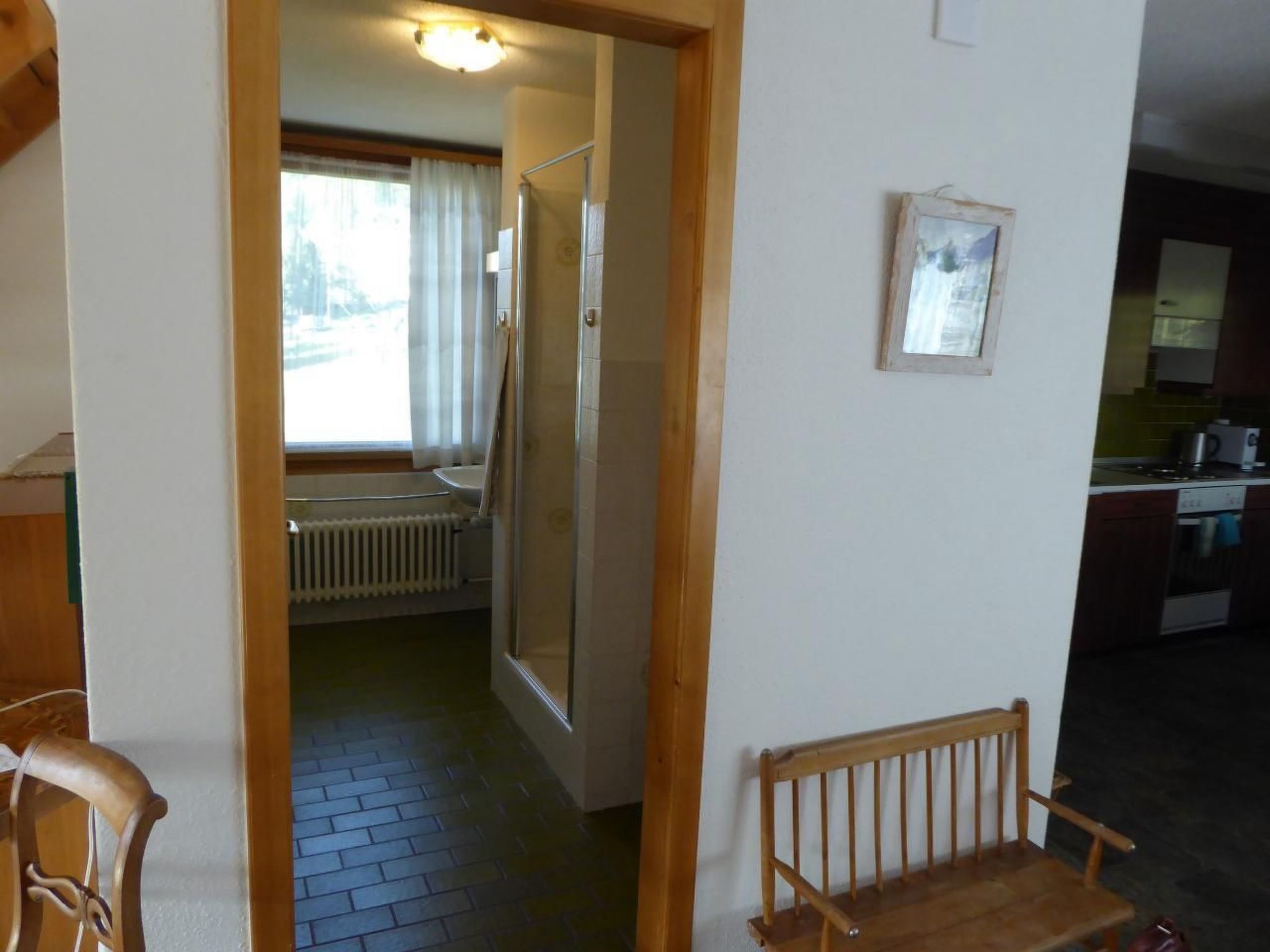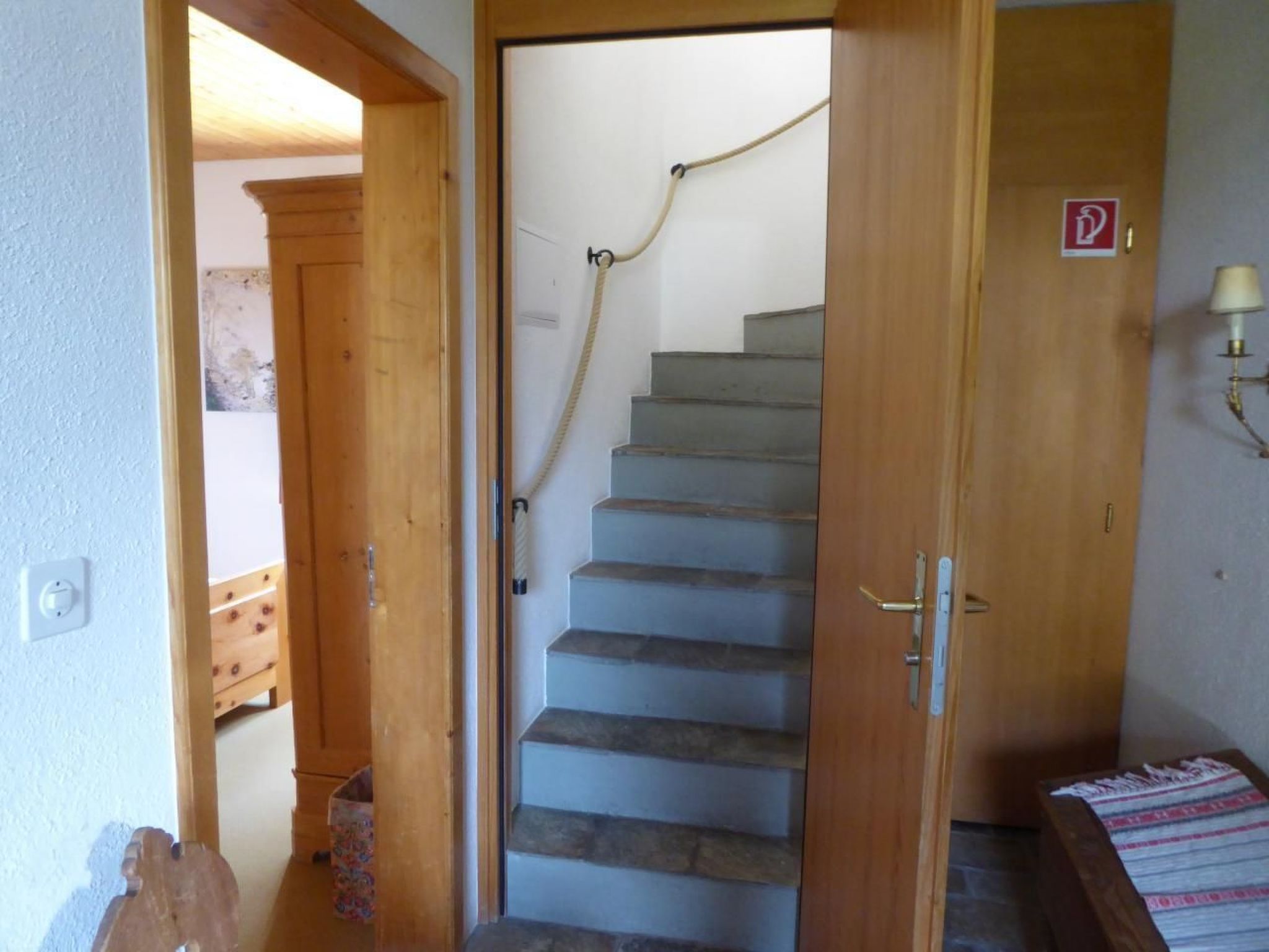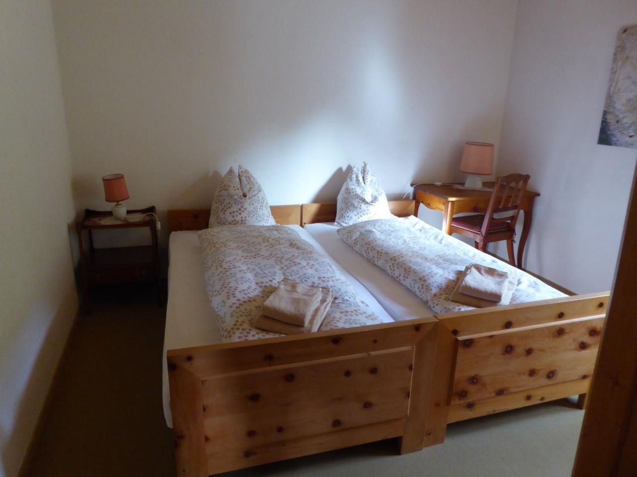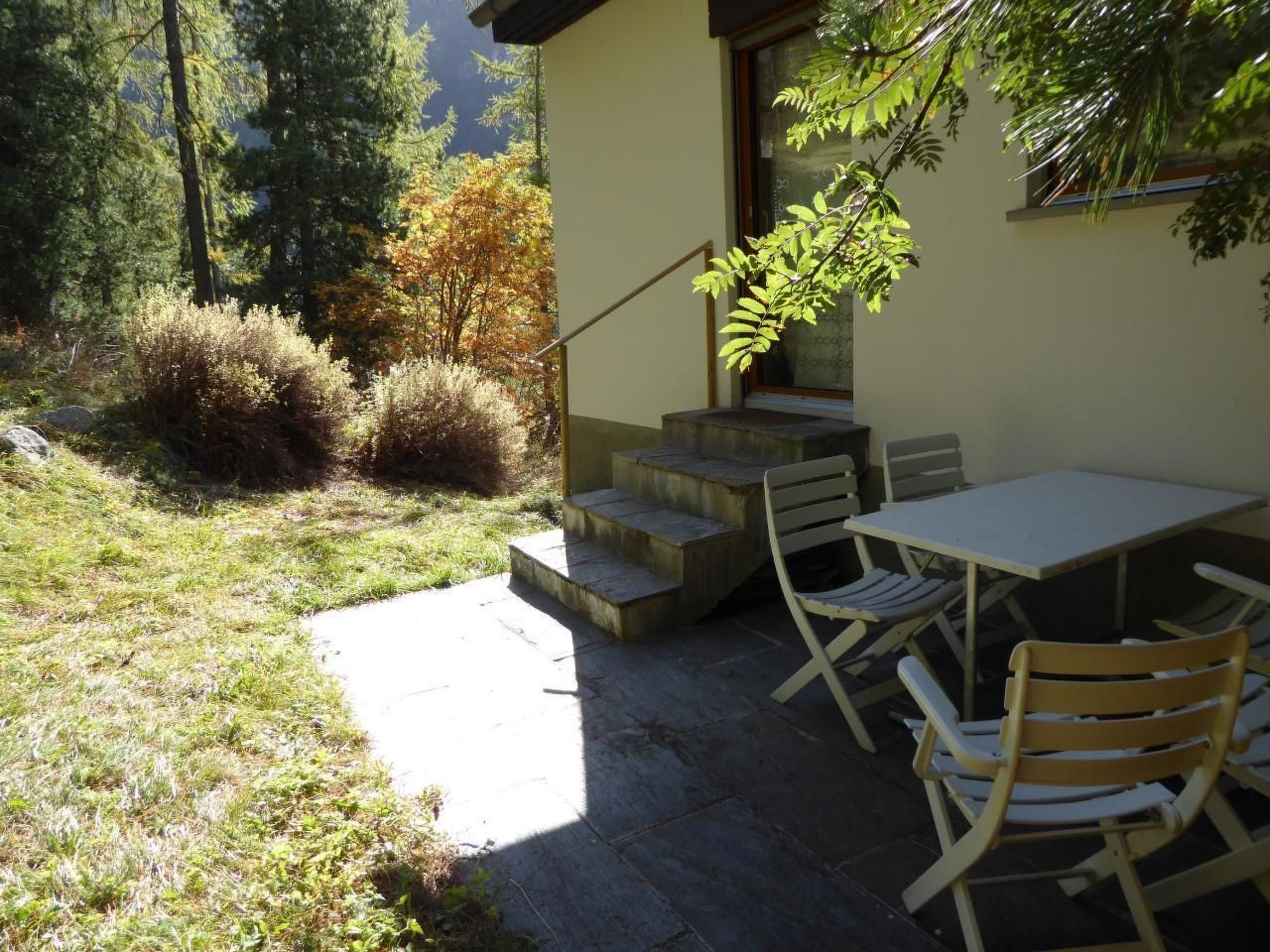Über dem Wohnbereich befindet sich eine geräumige Galerie mit zwei Fenstern. Hier steht ein Doppelbett mit Nachttischchen. Genügend Platz zum Versorgen von Ausrüstung und Kleidern bieten ein Schrank, eine Kommode sowie ein Wandkästchen. Zwei Arbeitsplätze mit Ausblick in den Wald oder übers Dorf laden zum Schreiben oder Lesen ein. Im unteren Stock (Eingangsebene) befinden sich zwei Schlafzimmer: ein Doppelzimmer mit grossem Schrank und ein Zimmer mit zwei getrennten Betten, Schrank, Tisch und Stühlen (Arventäfer). Daneben liegt ein geräumiges Badezimmer mit Bad, Dusche, WC und Waschmaschine. Auf der Terrasse und dem lauschigen Plätzchen am hintern Ausgang stehen Tische, Stühle und zwei Liegestühle zur Verfügung. In der eigenen Garage (mit Abstellplatz) besteht die Möglichkeit, die Skis zu deponieren.