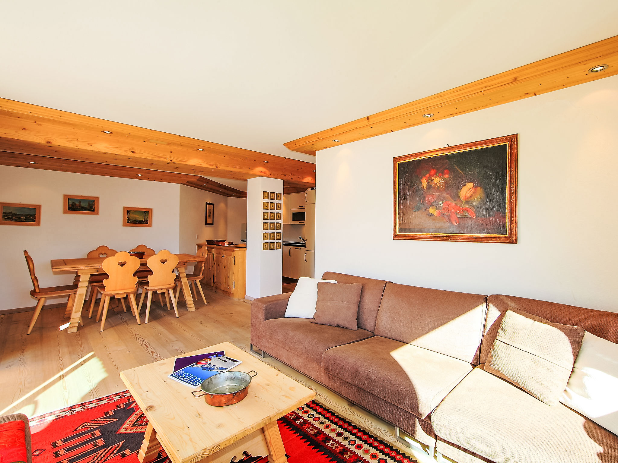 "Chesa Sül Muot", 4-Zimmer-Wohnung 100 m2, im Erdgeschoss, Südlage. Sehr luxuriös und gemütlich eingerichtet: Wohn-/Esszimmer mit Kabel-TV (Flachbildschirm), Radio und DVD. Ausgang zum Garten, zur Terrasse, Richtung Süden. 2 Doppelzimmer, jedes Zimmer mit 1 franz. Bett (1 x 160 cm, Länge 190 cm). 1 Kinderzimmer mit 1 Bett (90 cm, Länge 195 cm), 1 x 2 Etagenbetten (90 cm, Länge 195 cm). Offene Küche (Backofen, Geschirrspüler, 4 Glaskeramikplatten, Toaster, Wasserkocher, elektrische Kaffeemaschine, Kapseln für die Kaffeemaschine (Nespresso) extra, Racletteofen, Fondue Set (Chinoise, Käse)). Bad/WC, Dusche/WC, Hydromassage-Dusche. Bodenheizung. Holzdielenboden. Gartensitzplatz, Südlage. Liegestühle (4). Schöne Sicht auf den See, die Berge, das Tal und die Ortschaft. Zur Verfügung: Bügeleisen, Haartrockner. Internet (Wireless LAN, gratis). Garage (1 Auto), Höhe 190 cm, Breite 220 cm. Bitte beachten: geeignet für Familien. Nichtraucher-Unterkunft, Nichtraucher-Haus. Eigener Eingang.
