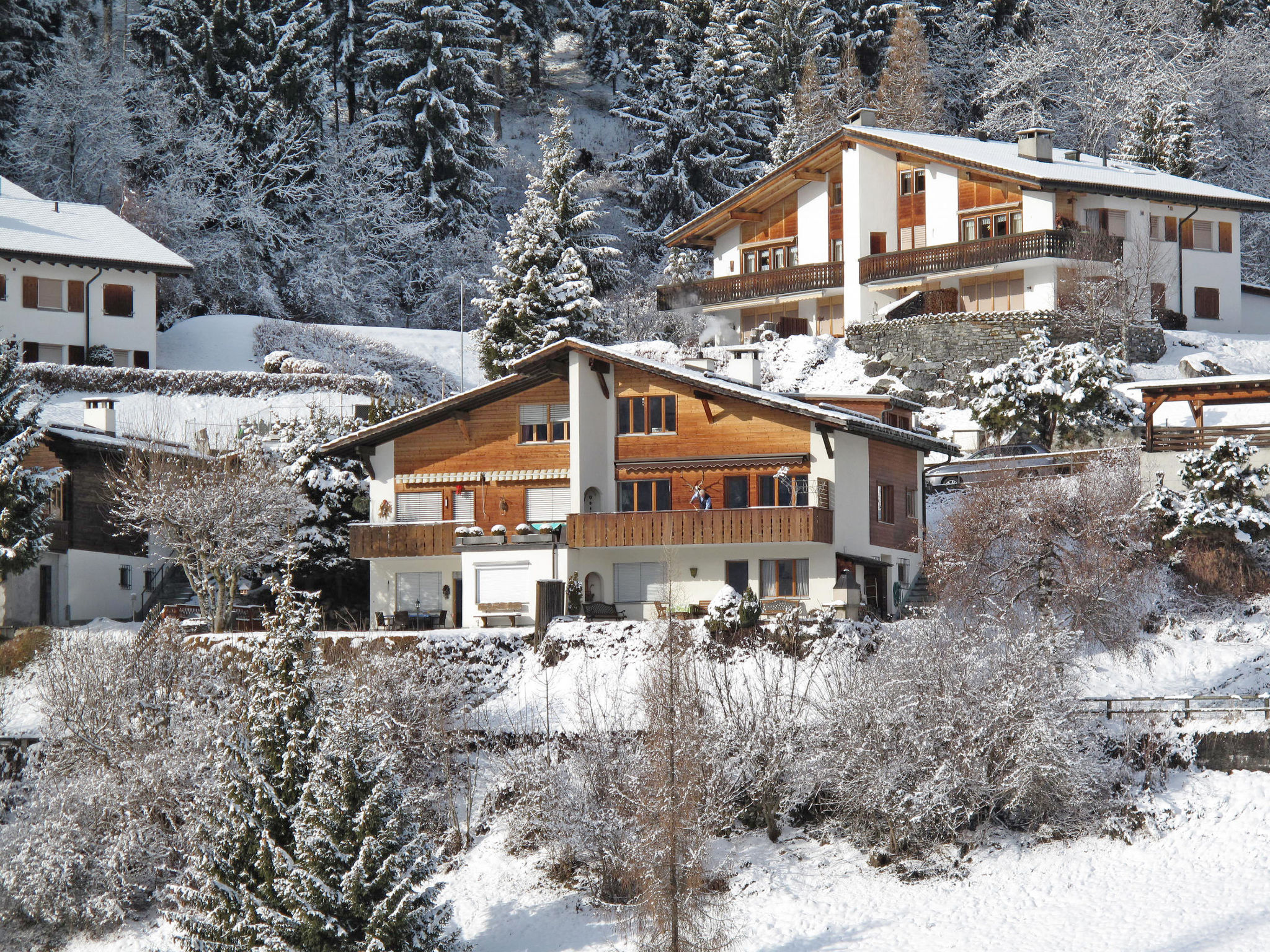 Zweifamilienhaus "Schumellins", 1'020 m.ü.M., auf 2 Stockwerken. 2 Wohnungen im Ferienhaus. 500 m vom Zentrum von Laax, 6 km vom Zentrum von Ilanz, 20 km vom Zentrum von Chur, am Hang, in einem Wohnquartier, 300 m vom See, in einer Sackgasse. Im Hause: Einstellraum für Fahrräder, Skiraum, Zentralheizung, Waschmaschine (zur Mitbenutzung). Treppenweg bis zum Haus. Parkplatz (überdacht) auf dem Grundstück. Einkaufsgeschäft 500 m, Supermarkt 6 km, Bushaltestelle "Laax GR, posta" 500 m, Bahnstation "Ilanz" 6 km. Golfplatz (18 Loch) 3.9 km, Bergeisenbahn 2 km, Skilift 2 km, Skibushaltestelle 350 m, Skischule 2 km. Bitte beachten: Bei guter Schneelage Zufahrt mit den Skiern bis zum Haus. Der Besitzer wohnt im selben Haus.