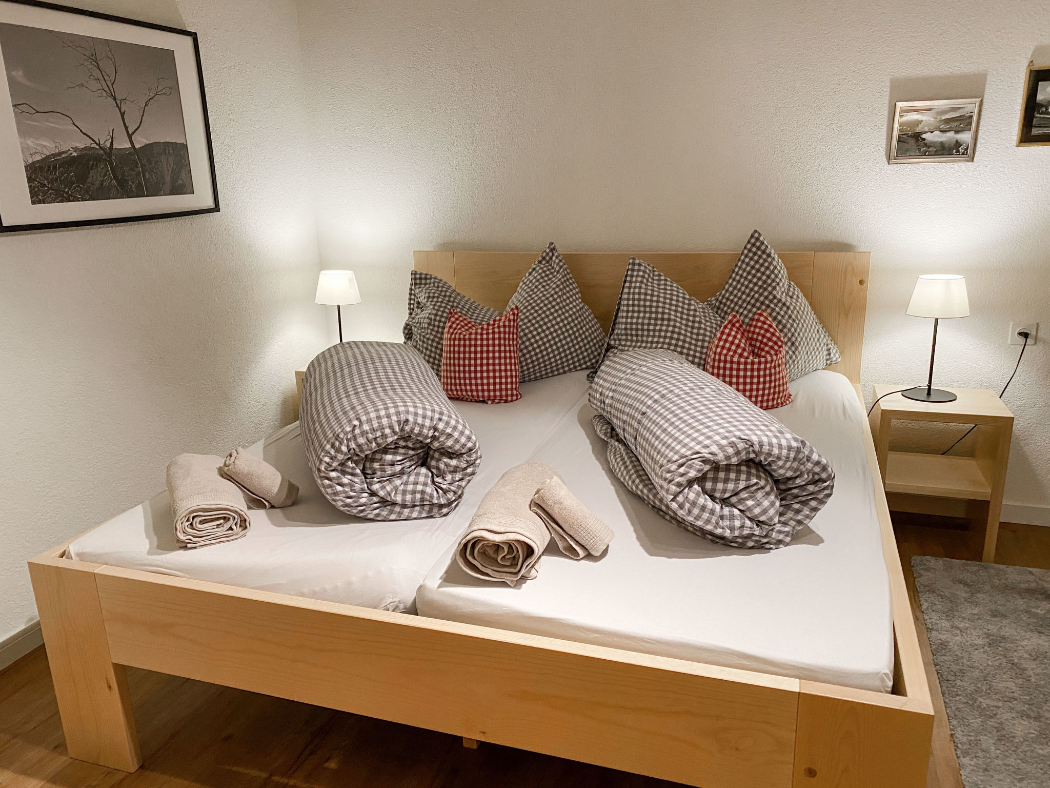"Schumellins (LAA400)", 1-Zimmer-Wohnung 35 m2, im Erdgeschoss, Südlage. Renoviert im Jahre 2021, geschmackvoll und gemütlich eingerichtet: Wohn-/Schlafzimmer mit 1 Doppelbett, Esstisch und Kabel-TV (Flachbildschirm). Ausgang zur Terrasse. Offene Küche (Backofen, Geschirrspüler, 2 Glaskeramikplatten, elektrische Kaffeemaschine, Racletteofen, Fondue Set (Chinoise, Käse)). Dusche/WC. Ölheizung. Terrasse. Terrassenmöbel, Gartengrill, Liegestühle (2). Schöne Panoramasicht auf den See, die Berge, die Landschaft und die Ortschaft. Zur Verfügung: Internet (Wireless LAN, extra). Parkplatz (überdacht) beim Haus. Bitte beachten: Nichtraucher-Haus. Maximal 2 Haustiere/Hunde erlaubt. Eigener Eingang.