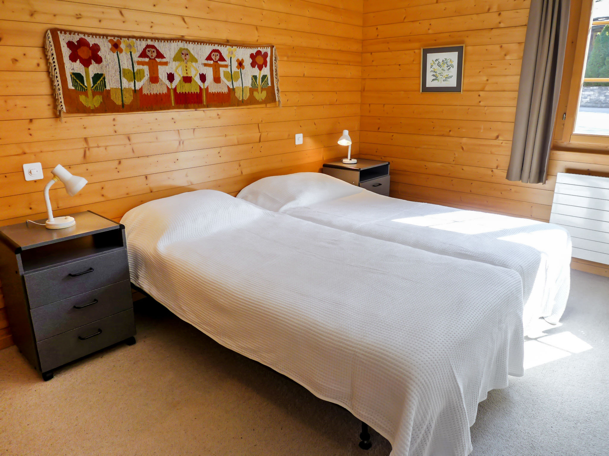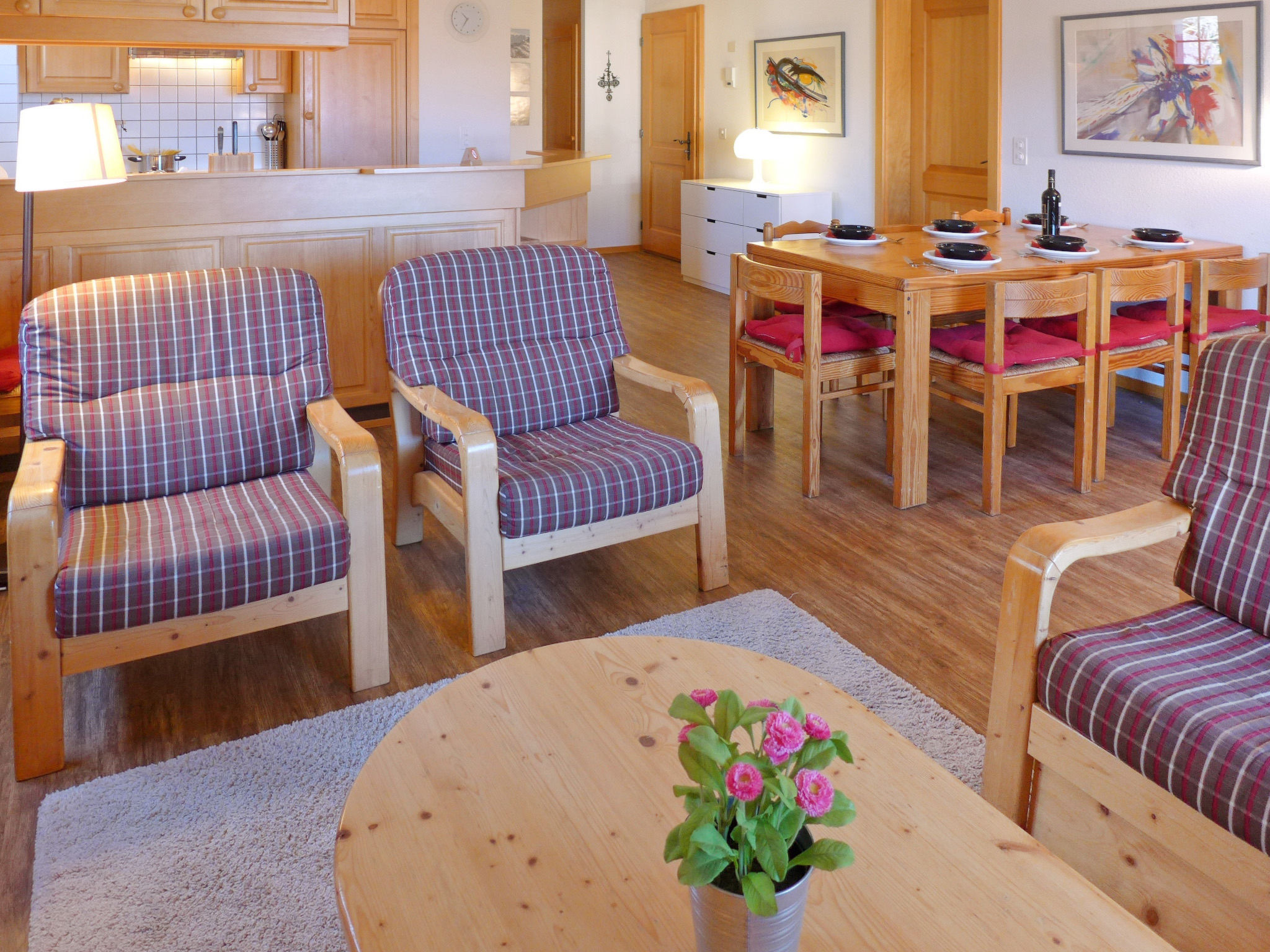 "Le Miclivier B1", 5-Zimmer-Maisonette-Wohnung 120 m2, im Erdgeschoss. Hell, zweckmässig und komfortabel eingerichtet: Wohn-/Esszimmer 58 m2 mit offenem Kamin, Esstisch und TV. Ausgang zum Garten. 1 Zimmer mit 2 Betten (90 cm), Bad/WC. Ausgang zum Garten, Richtung Süden. 1 Zimmer mit 2 Betten (90 cm, Länge 200 cm). Offene Küche (Backofen, Geschirrspüler, 4 Glaskeramikplatten, Toaster, Wasserkocher, Mikrowelle, Tiefkühler, elektrische Kaffeemaschine, Kapseln für die Kaffeemaschine (Nespresso) extra, Racletteofen, Fondue Set (Käse)). Dusche/WC. Unteres Geschoss: (Wendeltreppe) 1 kleines Zimmer, ohne Schrank mit 2 Betten (90 cm, Länge 190 cm). 1 kleines Zimmer, ohne Schrank mit 2 Betten (90 cm). Grosse Terrasse 36 m2, Garten. Terrassenmöbel, Gartengrill. Schöne Sicht auf die Berge. Zur Verfügung: Bügeleisen, Babybett, Haartrockner. Internet (Wireless LAN, gratis). Garage Nr. B1. Bitte beachten: Nichtraucher-Unterkunft.