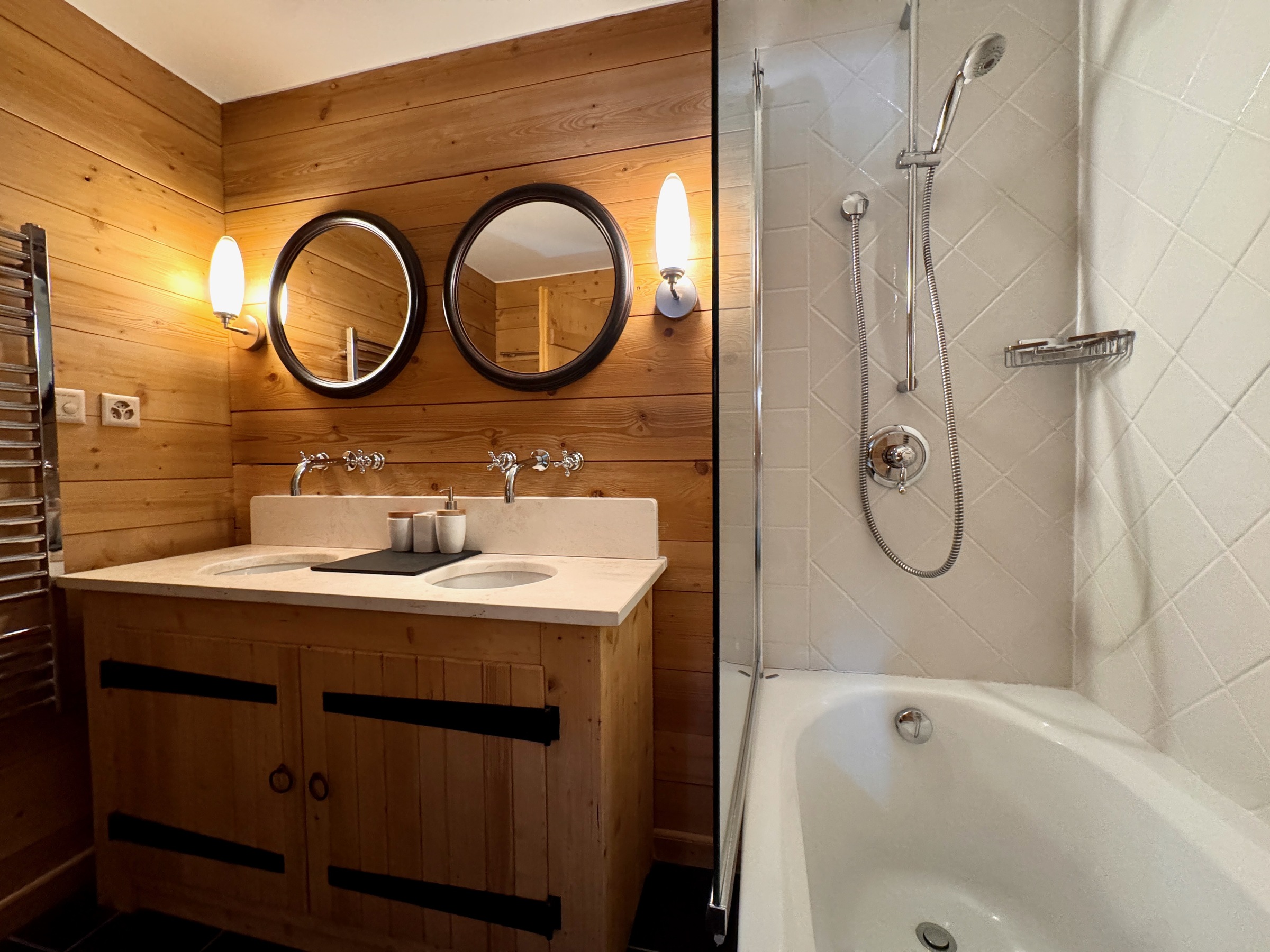 Two bedrooms separated by a dressing room on the raised lower ground floor with their own ensuite bathrooms provide for the calmest nights. Indoor underground parking with direct step free access to the chalet. Separate utility room and ski room.