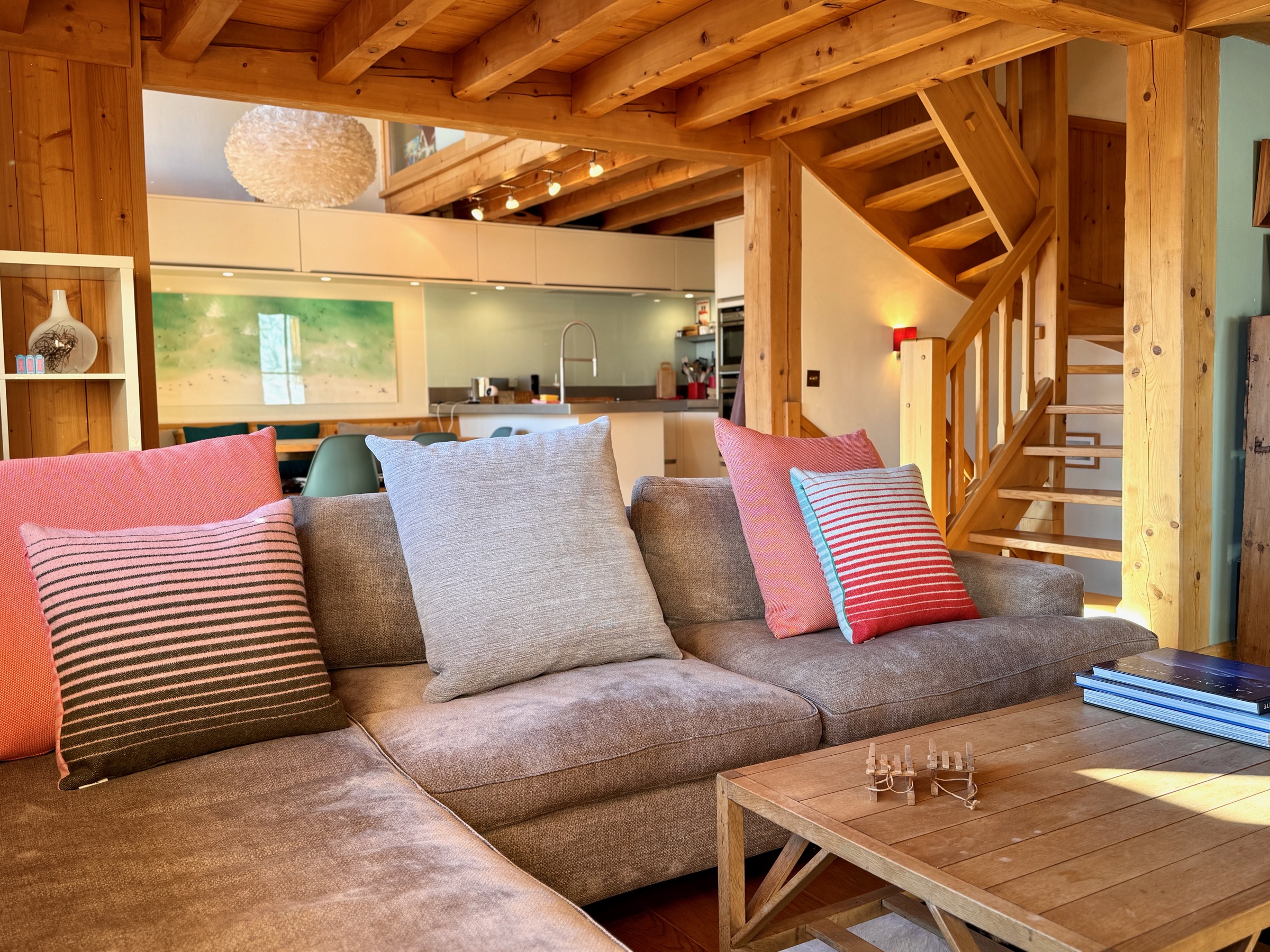 The raised ground floor benefits from a modern fully equipped kitchen and spectacular views. Dining area can sit up to 10 people. Direct access to two large terraces and garden from kitchen and living room allow for convivial sunny winter lunches and summer dinners.