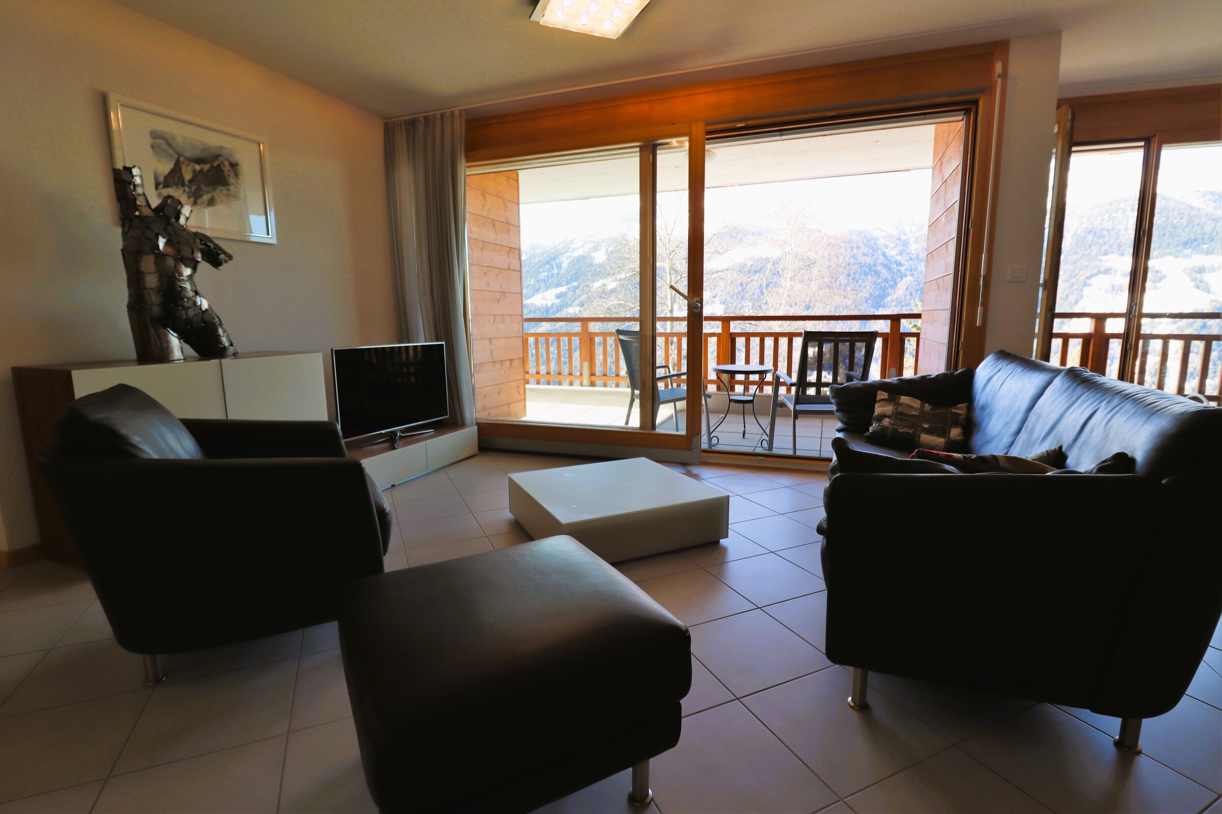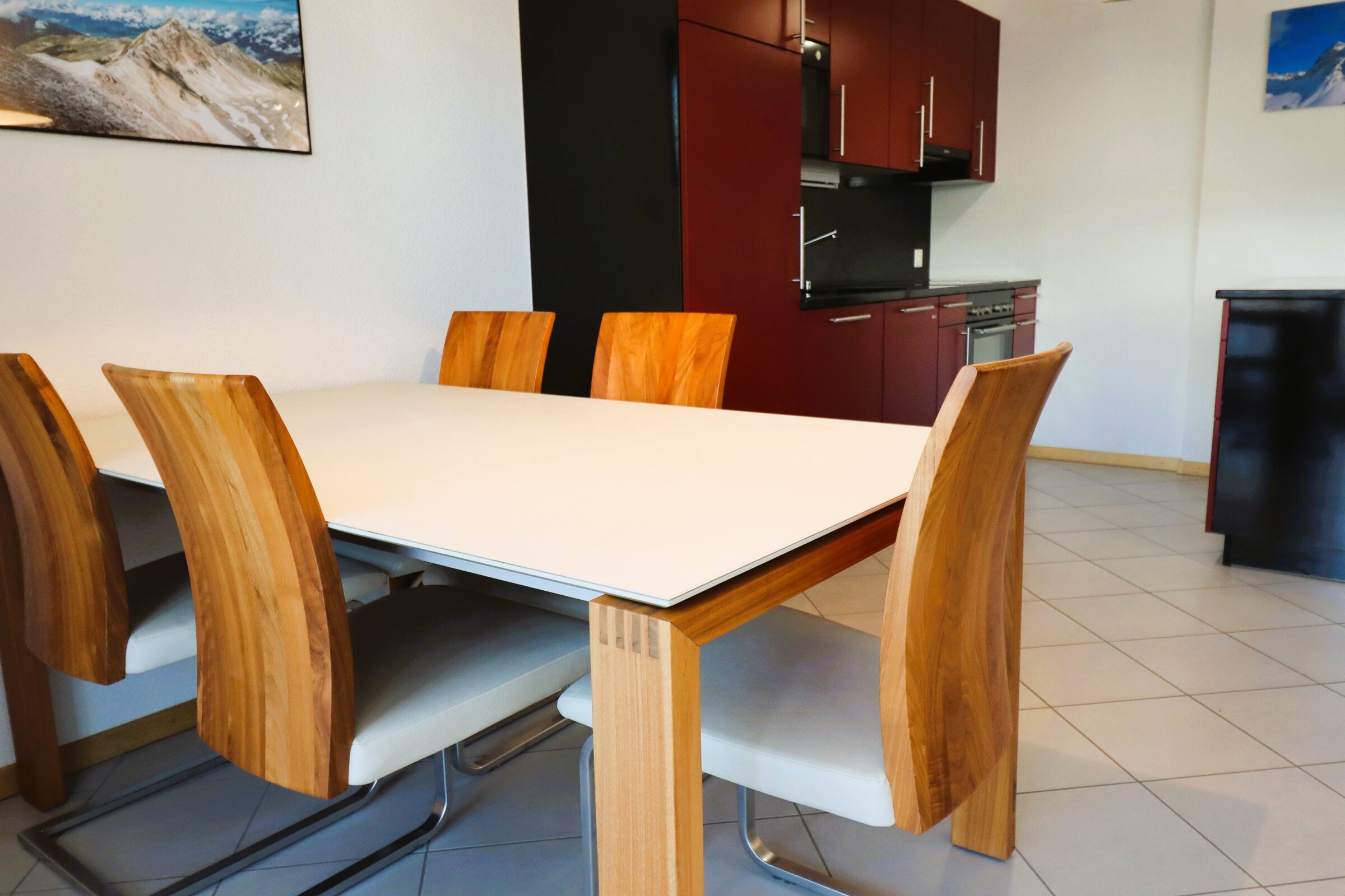 Aussen : Moderne Wohnung für 5 Personen, Terrasse, Panoramablick nach Süden, am Ortseingang gelegen -Innen : 90 qm, Wohnraum mit Schwedenofen, Essecke, Fernseher - Zimmer : 1 Doppelbettzimmer mit 1 doppelbett ( 180/210) , 1 Zimmer-Büro mit 1 Einzelbett (90/210), 1 Zimmer mit 2 Einzelbetten (90/210)-Sanitäranlagen : 2 Badezimmer eins mit duche und eins mit Badewanne, Waschmaschine und Trockner -Küche : offene Küche, Elektroherd, Backofen, Vitrocerame, Kühlschrank mit Tiefkühler, Geschirrspüler, Kaffeemaschine, Wasserheizgerät -Verschiedenes : WiFi und Fernseher, Haustiere nicht genehmigt, Nichtraucher, Gartenmöbel, Skiraum, 100 m von der Bushaltestelle entfernt, Innenparkplatz -