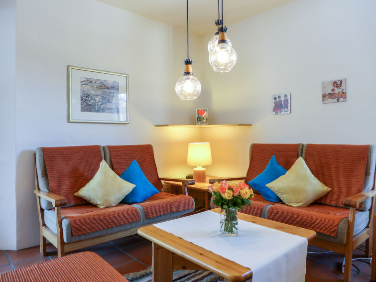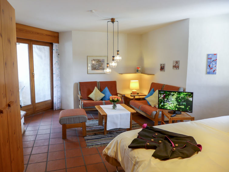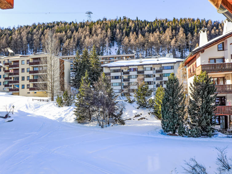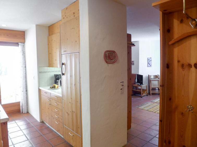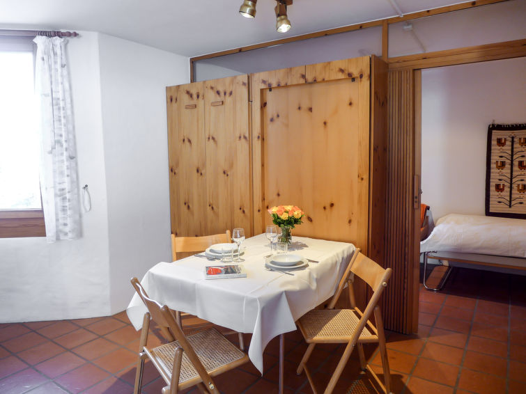 "Chesa Maurus A12", 1-Zimmer-Wohnung 50 m2 im 3. Stock. Zweckmässig und gemütlich eingerichtet: Wohn-/Schlafzimmer mit 2 Klappbetten (90 cm, Länge 200 cm), offenem Kamin, Esstisch und TV (Flachbildschirm). Ausgang zum Balkon. Verbundenes Zimmer mit 1 Klappbett (90 cm, Länge 200 cm). Offene Küche (4 Kochplatten, Backofen, Geschirrspüler, Toaster, Wasserkocher, elektrische Kaffeemaschine). Ausgang zum Balkon. Bad/WC. Balkon 6 m2. Balkonmöbel. Schöne Sicht auf die Berge, die Landschaft und die Ortschaft. Zur Verfügung: Haartrockner. Internet (Wireless LAN, gratis). Garage Nr. 17 - A12 auf dem Grundstück (1 Auto), Höhe 210 cm, Breite 220 cm. Bitte beachten: Nichtraucher-Unterkunft, Nichtraucher-Haus. :der Schlafbereich für die 3. Person kann durch eine Schiebetür abgetrennt werden.