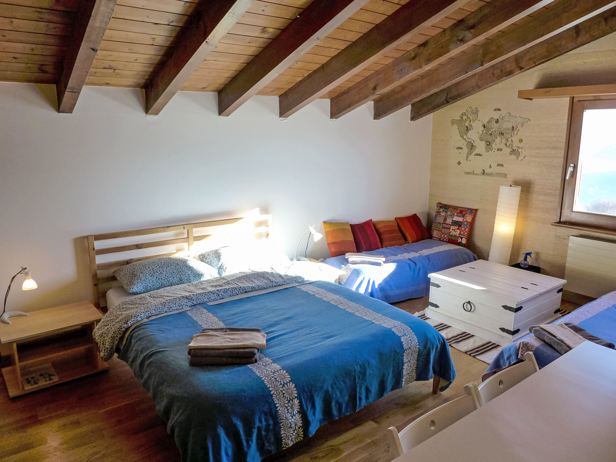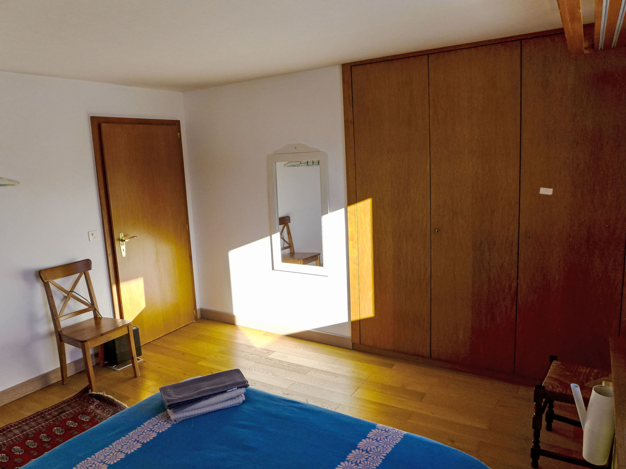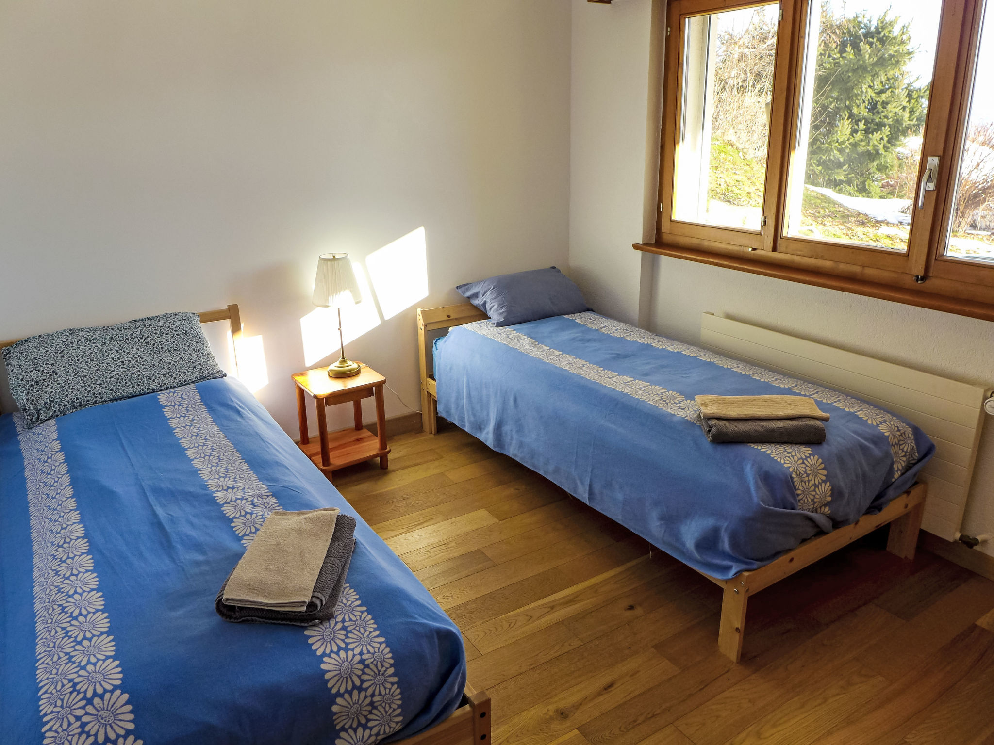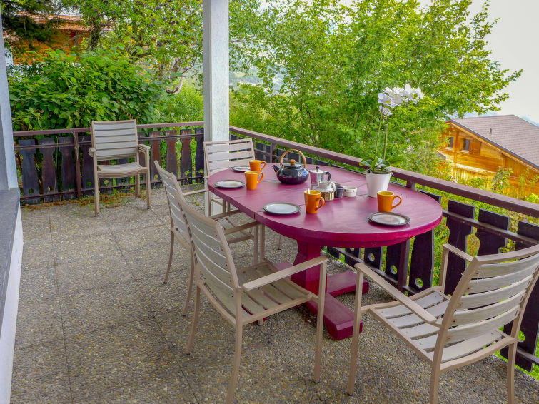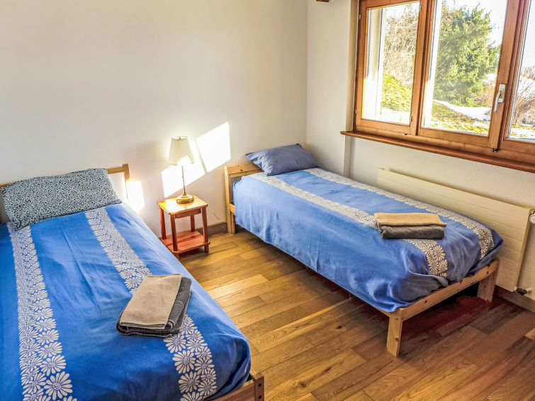 "Chalet Aglaia", 5-Zimmer-Chalet 220 m2 auf 3 Stockwerken, Südlage. Objekt geeignet für 8 Erwachsene + 2 Kinder. Geräumig, komfortabel und schön eingerichtet: Wohn-/Esszimmer mit offenem Kamin, Kabel-TV und Flachbildschirm. Ausgang zum Balkon. Küche (Backofen, Geschirrspüler, 4 Glaskeramikplatten, Toaster, Wasserkocher, Mikrowelle, Tiefkühler, elektrische Kaffeemaschine, Racletteofen, Fondue Set (Käse)). Ausgang zur Terrasse. Unteres Geschoss: 1 Zimmer mit 2 Betten (90 cm, Länge 200 cm), sep. WC. Obergeschoss: 1 abgeschrägtes grosses Zimmer mit 2 Betten (80 cm, Länge 200 cm), 1 franz. Bett (160 cm, Länge 200 cm). 1 Zimmer mit 1 franz. Bett (160 cm, Länge 200 cm). 1 abgeschrägtes Zimmer mit 1 franz. Bett (140 cm, Länge 200 cm). Bad/WC, Dusche/WC. Grosser Balkon, Südlage und Ostlage, kleine Terrasse, Nordlage und Ostlage. Balkonmöbel, Gartengrill (mobil), Liegestühle (2). Sehr schöne Sicht auf die Berge, das Tal und die Landschaft. Zur Verfügung: Waschmaschine, Bügeleisen, Kinderhochstuhl, Babybett bis 3 Jahre, Haartrockner. Internet (WLAN, gratis). Garage (2 Autos) beim Haus, Höhe 190 cm, Breite 230 cm. Bitte beachten: geeignet für Familien. Nichtraucher-Haus. Babybett ohne Bettwäsche und ohne Decke. Nach 22 Uhr ist es verboten, Lärm zu machen, da die Umgebung sehr lärmempfindlich ist.