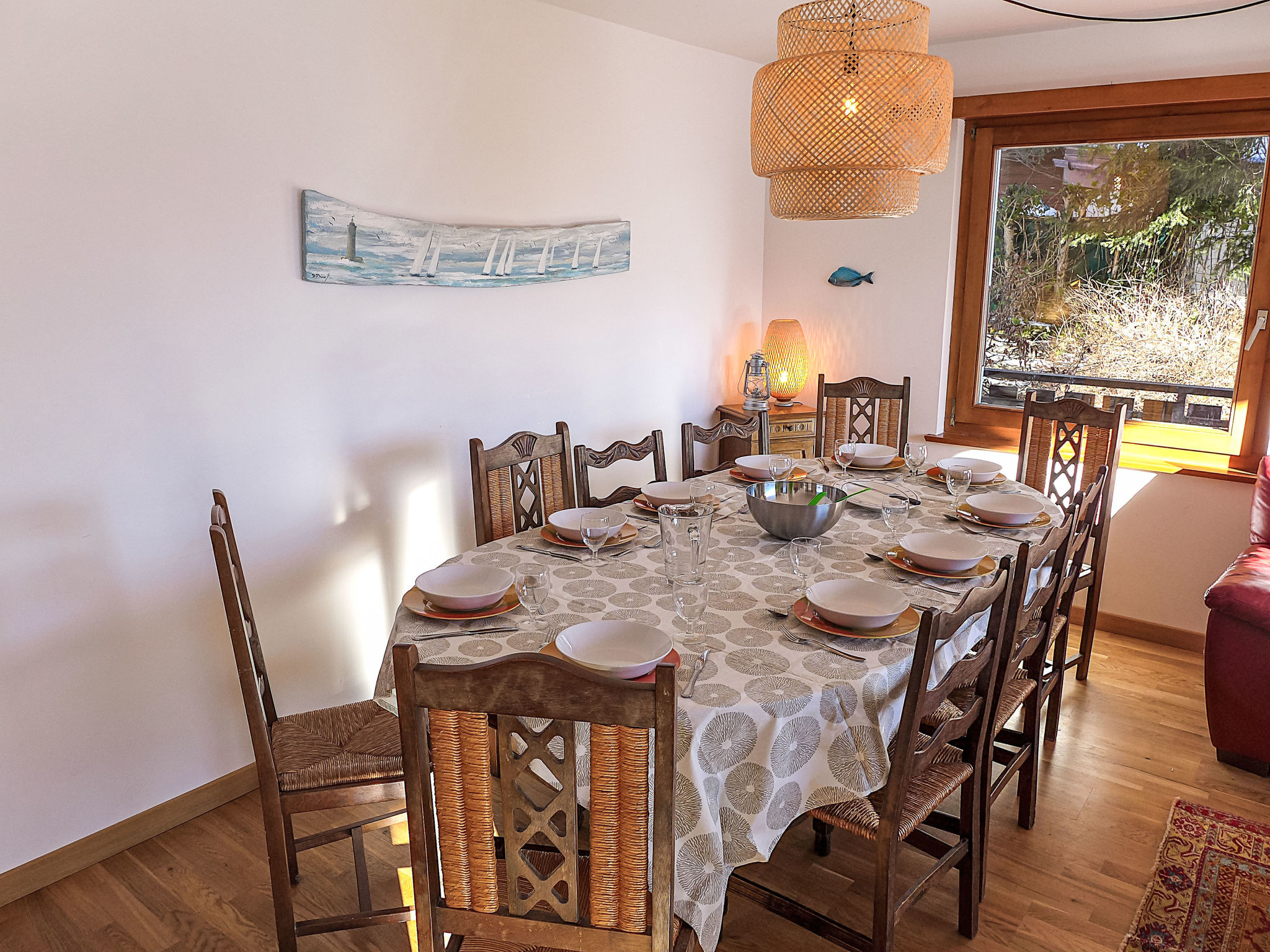 "Chalet Aglaia", 5-Zimmer-Chalet 220 m2 auf 3 Stockwerken, Südlage. Objekt geeignet für 8 Erwachsene + 2 Kinder. Geräumig, teilweise renoviert im Jahre 2026, komfortabel und schön eingerichtet: Wohn-/Esszimmer mit offenem Kamin, Kabel-TV und Flachbildschirm. Ausgang zum Balkon. Küche (Backofen, Geschirrspüler, 4 Glaskeramikplatten, Toaster, Wasserkocher, Mikrowelle, Tiefkühler, elektrische Kaffeemaschine, Racletteofen, Fondue Set (Käse)). Ausgang zur Terrasse. Unteres Geschoss: 1 Zimmer mit 2 Betten (90 cm, Länge 200 cm), sep. WC. Obergeschoss: 1 abgeschrägtes grosses Zimmer mit 2 Betten (80 cm, Länge 200 cm), 1 franz. Bett (160 cm, Länge 200 cm). 1 Zimmer mit 1 franz. Bett (160 cm, Länge 200 cm). 1 abgeschrägtes Zimmer mit 1 franz. Bett (160 cm, Länge 200 cm). Bad/WC, Dusche/WC. Grosser Balkon, Südlage und Ostlage, kleine Terrasse, Nordlage und Ostlage. Balkonmöbel, Gartengrill (mobil), Liegestühle (2). Sehr schöne Sicht auf die Berge, das Tal und die Landschaft. Zur Verfügung: Waschmaschine, Bügeleisen, Kinderhochstuhl, Babybett bis 3 Jahre, Haartrockner. Internet (WLAN, gratis). Garage (2 Autos), Höhe 190 cm, Breite 230 cm. Bitte beachten: geeignet für Familien. Nichtraucher-Haus. Babybett ohne Bettwäsche und ohne Decke. Nach 22 Uhr ist es verboten, Lärm zu machen, da die Umgebung sehr lärmempfindlich ist.