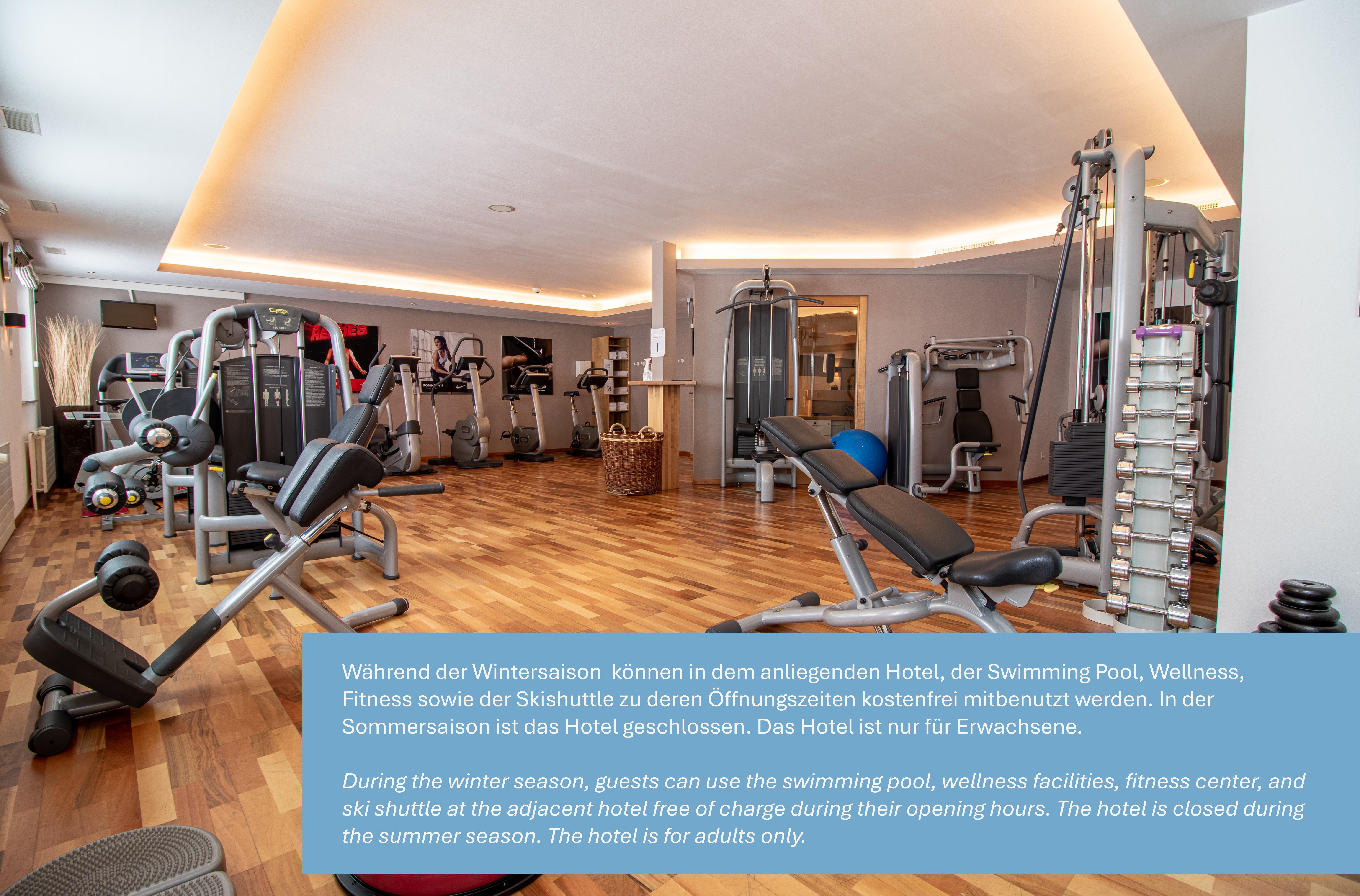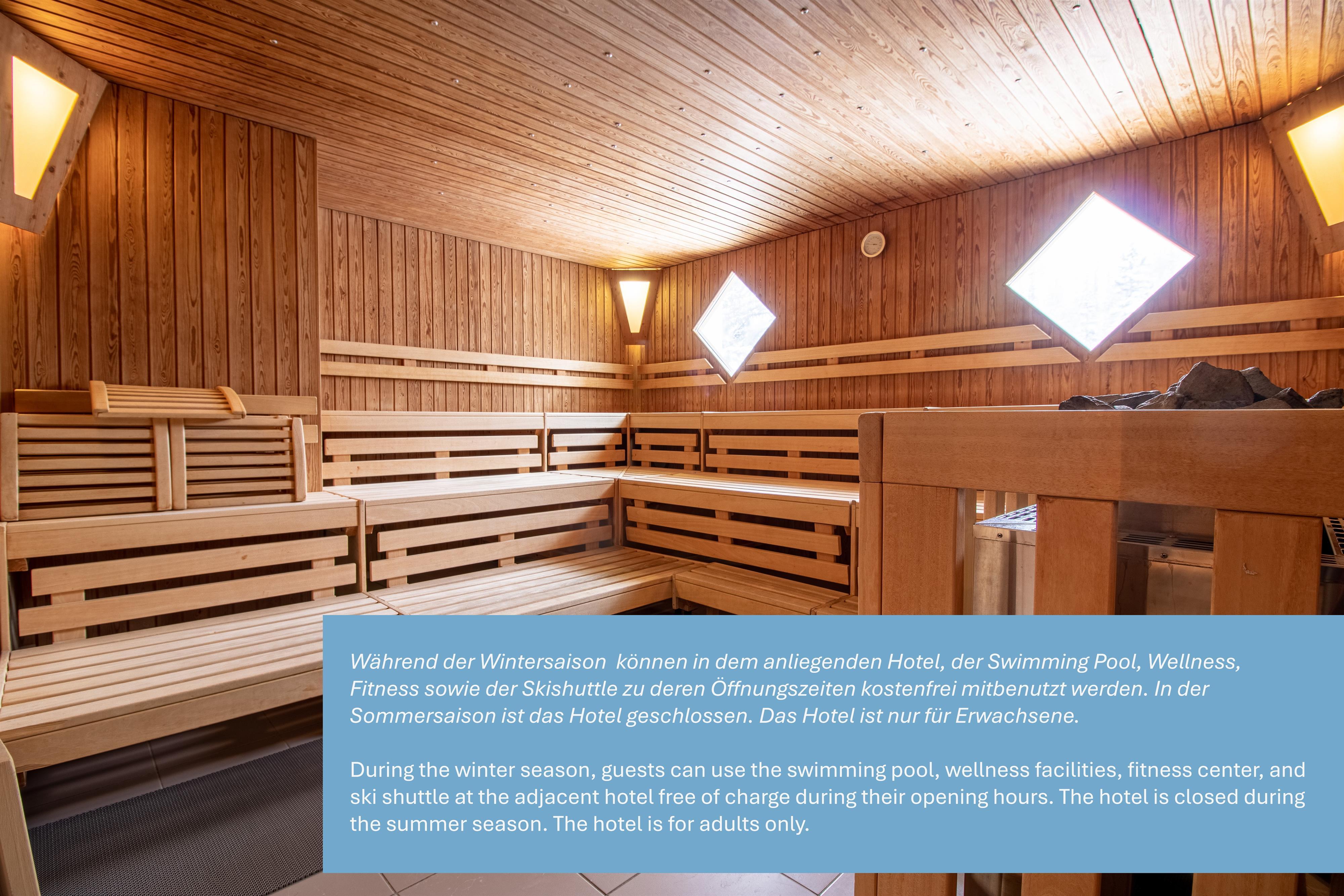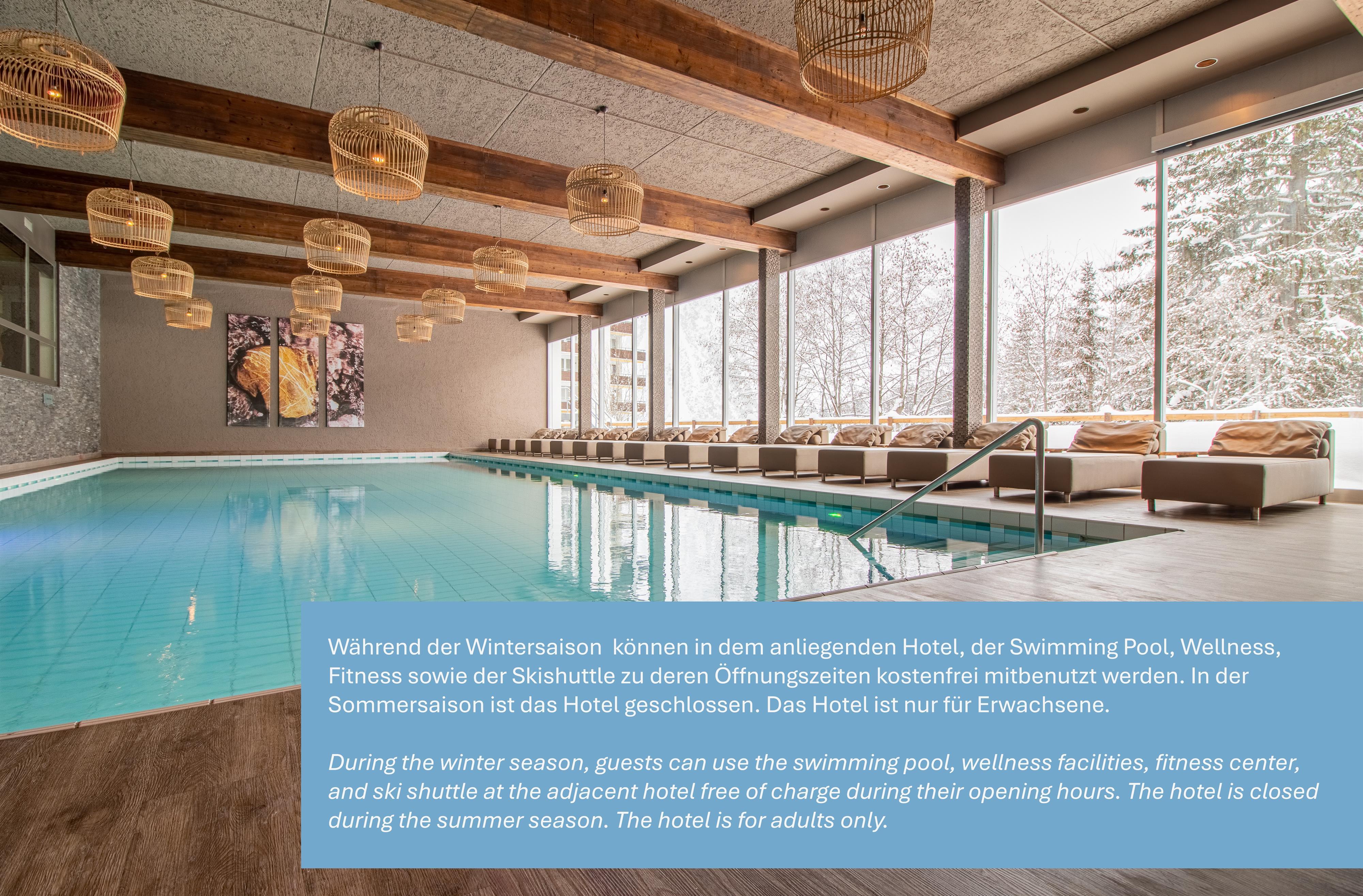 Während der Wintersaison  können in dem anliegenden Hotel, der Swimming Pool, Wellness, Fitness sowie der Skishuttle zu deren Öffnungszeiten kostenfrei mitbenutzt werden. In der Sommersaison ist das Hotel geschlossen. Das Hotel ist nur für Erwachsene.