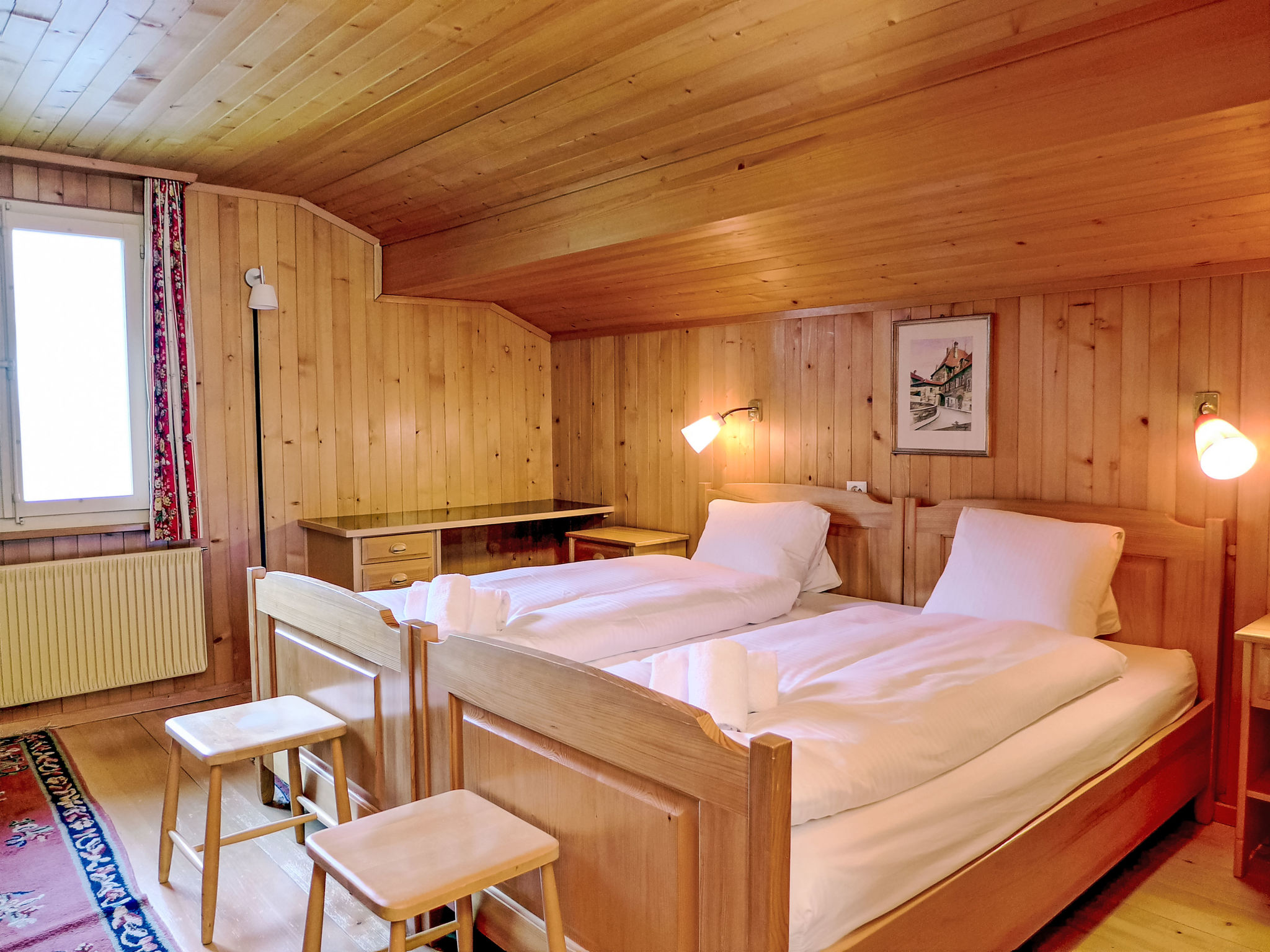 "Chalet Colette - 2", 6-Zimmer-Wohnung 110 m2 auf 2 Stockwerken, im Obergeschoss. Geräumig, teilweise abgeschrägt, teilweise im Jahre 2023, sehr komfortabel und gemütlich eingerichtet: offenes Wohn-/Esszimmer mit Essecke, Digital-TV, CD und Stereoanlage. Ausgang zum Balkon, Richtung Süden. Kleines Büro mit 1 Diwanbett. 1 grosses Zimmer mit 1 Doppelbett (2 x 90 cm, Länge 200 cm), Bad/WC. Küche (Backofen, Geschirrspüler, 4 Glaskeramikplatten, Toaster, Wasserkocher, Mikrowelle, elektrische Kaffeemaschine, Kapseln für die Kaffeemaschine (Nespresso) extra, Fondue Set (Käse)) mit Durchreiche. Sep. WC. Obergeschoss: 1 abgeschrägtes Zimmer mit 1 Doppelbett (2 x 90 cm, Länge 200 cm). 2 abgeschrägte Zimmer, jedes Zimmer mit 1 Bett (90 cm, Länge 195 cm). Dusche/WC. Holzdielenboden, Natursteinboden. Balkon, Südlage. Herrliche Panoramasicht auf die Berge, das Tal, die Ortschaft und Eigernordwand. Zur Verfügung: Internet (WLAN, gratis). Parkplatz in 50 m. Bitte beachten: geeignet für Familien. Eigener Eingang.