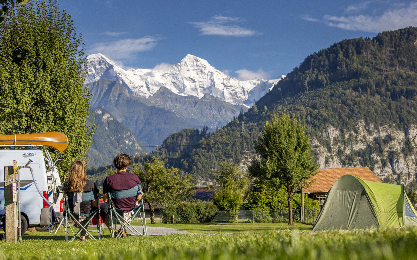 Idyllischer Familien-Campingplatz, eingebettet in eine wunderschöne, grüne Umgebung, bietet eine einzigartige Aussicht auf die majestätischen Gipfel von Eiger, Mönch und Jungfrau. Perfekt für erholsame und ruhige Urlaubstage.