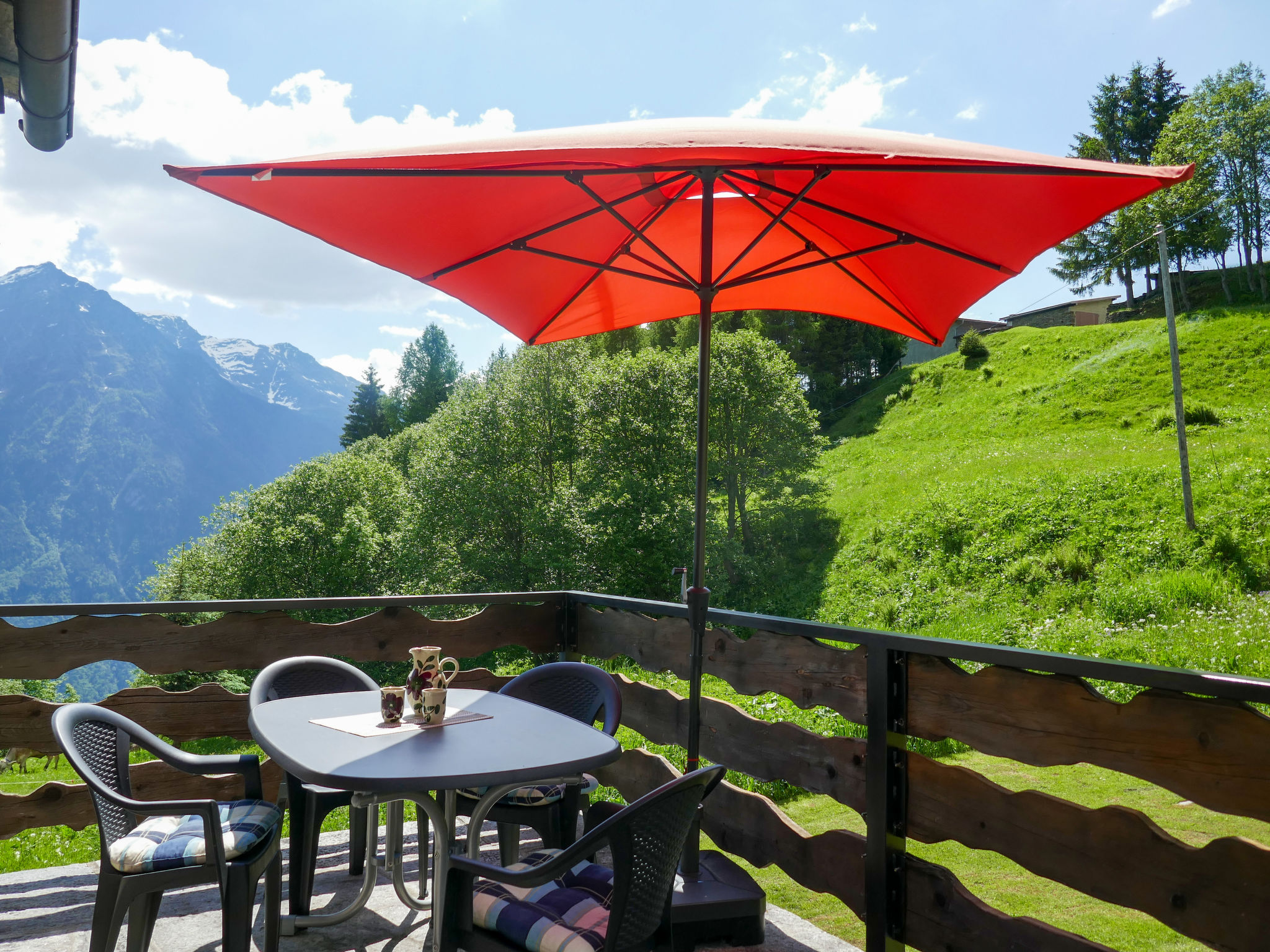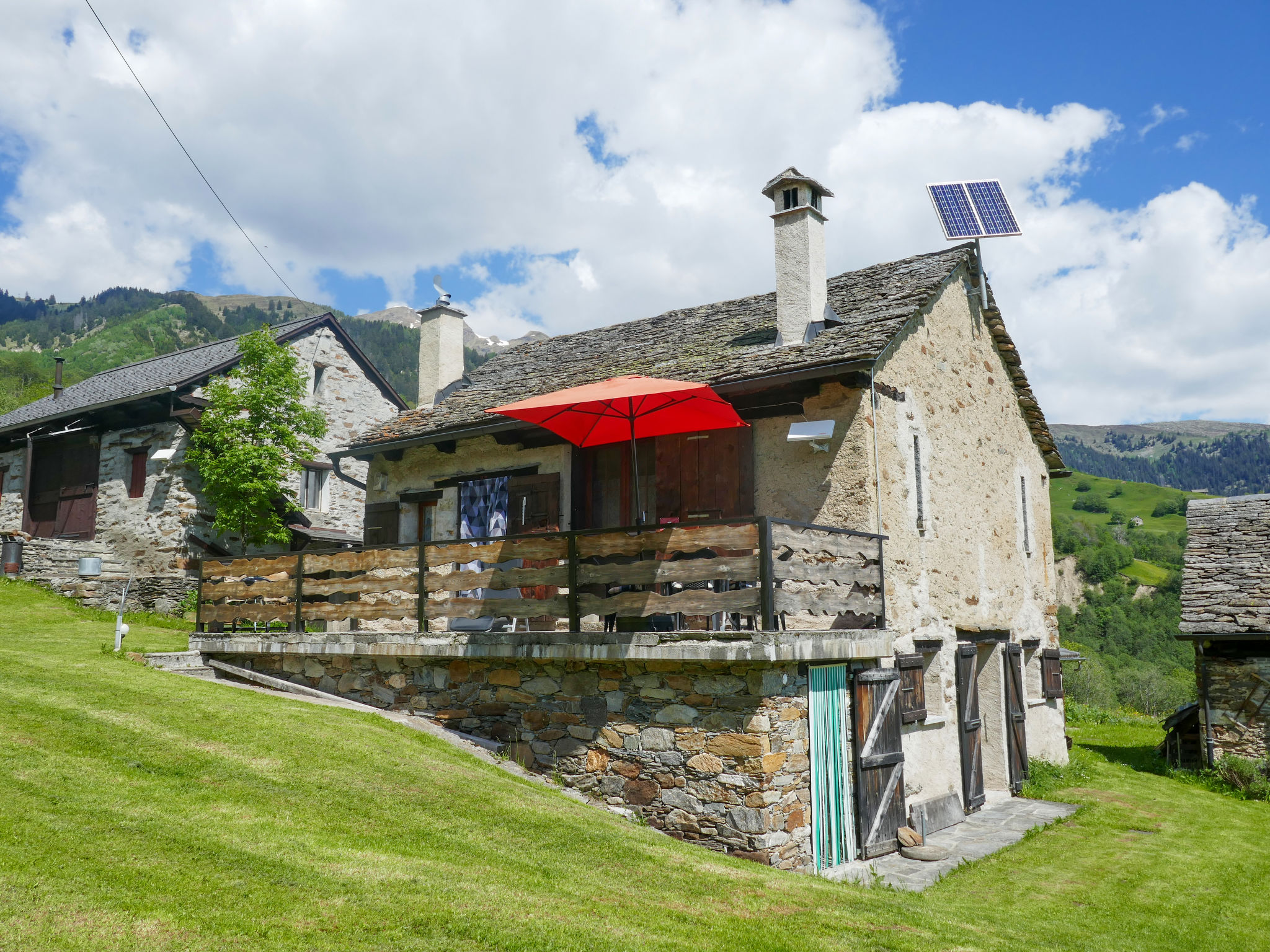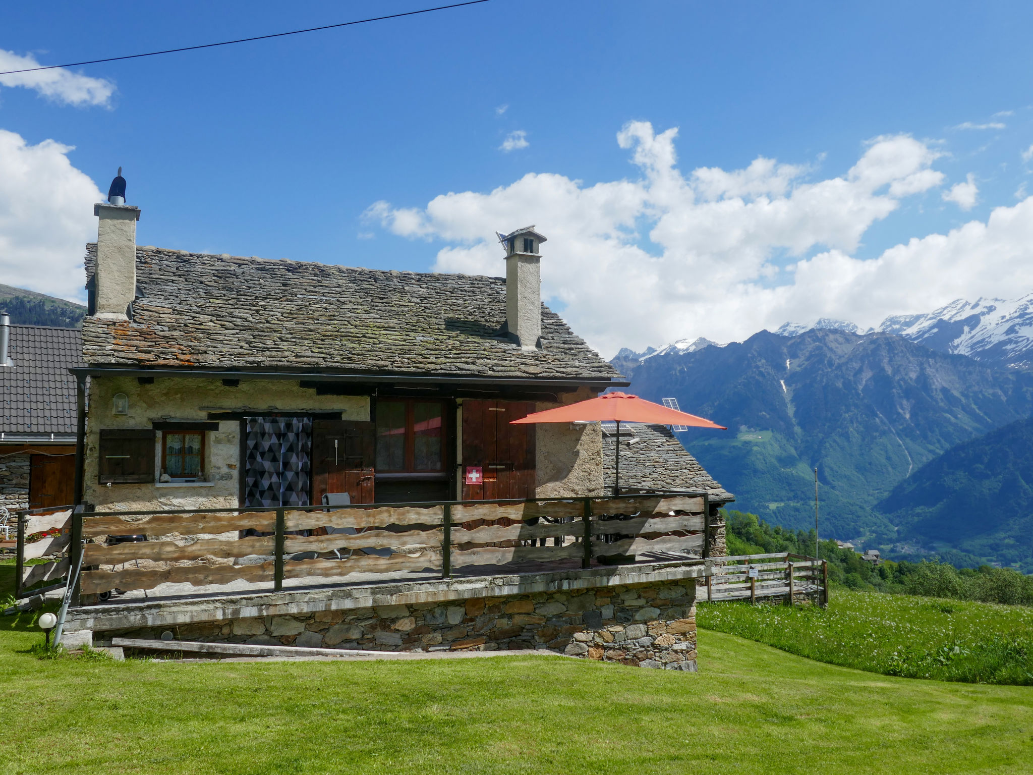 "Rustico Tecc Berbis", 1-Zimmer-Haus. Geräumig, teilweise abgeschrägt, rustikal und gemütlich eingerichtet: offenes Wohn-/Esszimmer mit offenem Kamin, Essecke und Sat-TV. Ausgang zur Terrasse. Offener Zwischenstock mit 2 Betten (95 cm, Länge 195 cm). Offene Küche (4 Glaskeramikplatten, Toaster, Wasserkocher, Mikrowelle, Fondue Set (Käse)). Unteres Geschoss: Dusche/WC. Holzheizung. Terrassenmöbel, Gartengrill (mobil), Liegestühle (2). Sehr schöne Sicht auf die Berge, das Tal und die Landschaft. Zur Verfügung: Kinderhochstuhl, Babybett bis 2 Jahre (extra), Haartrockner. Bitte beachten: Nichtraucher-Haus. >> Wichtig: Der Holzofen in der Küche dient nur der Dekoration. Zündung verboten! NL-00002457