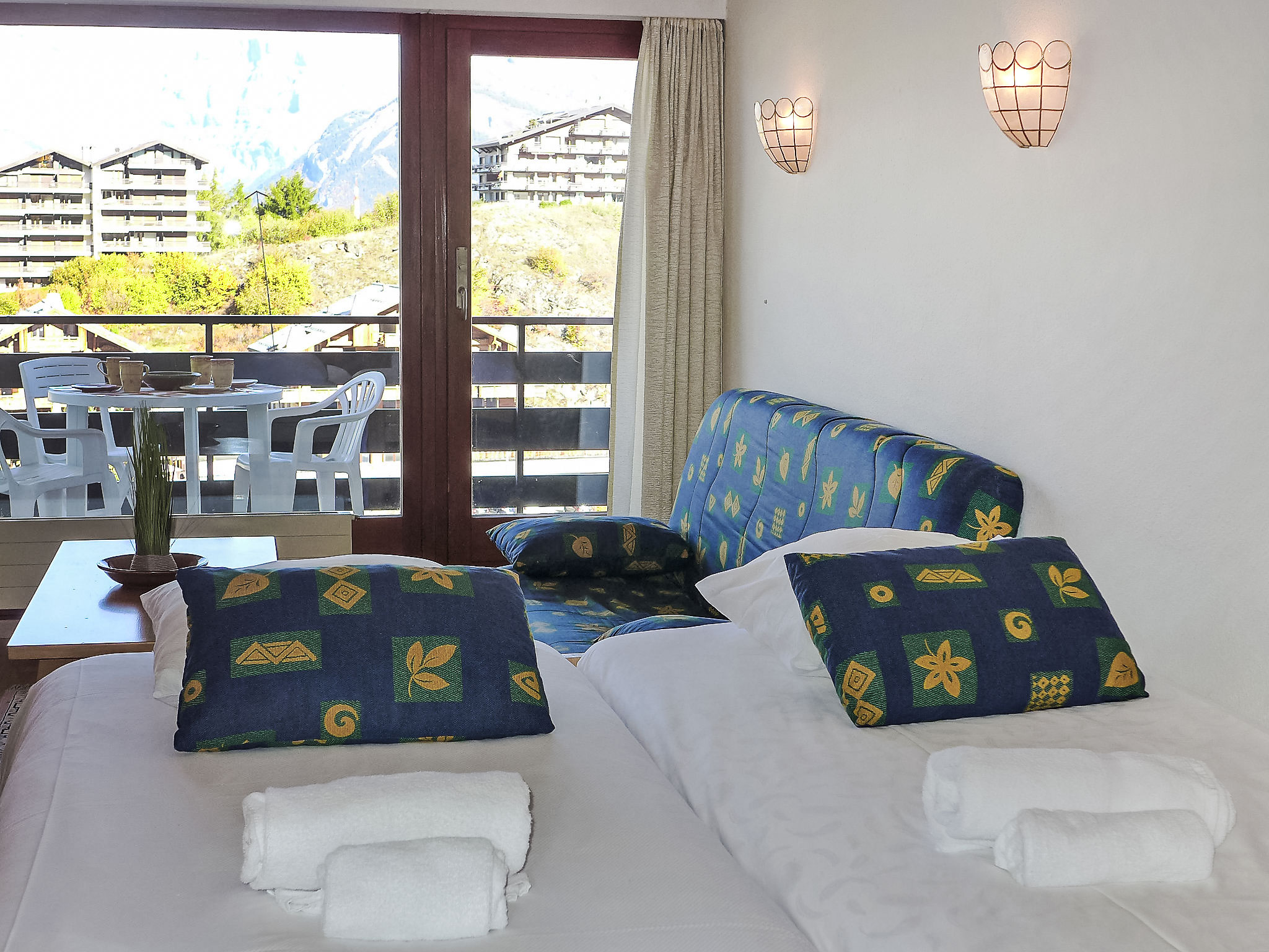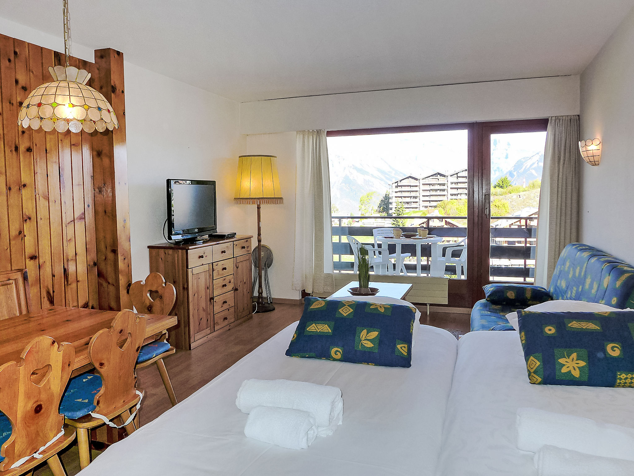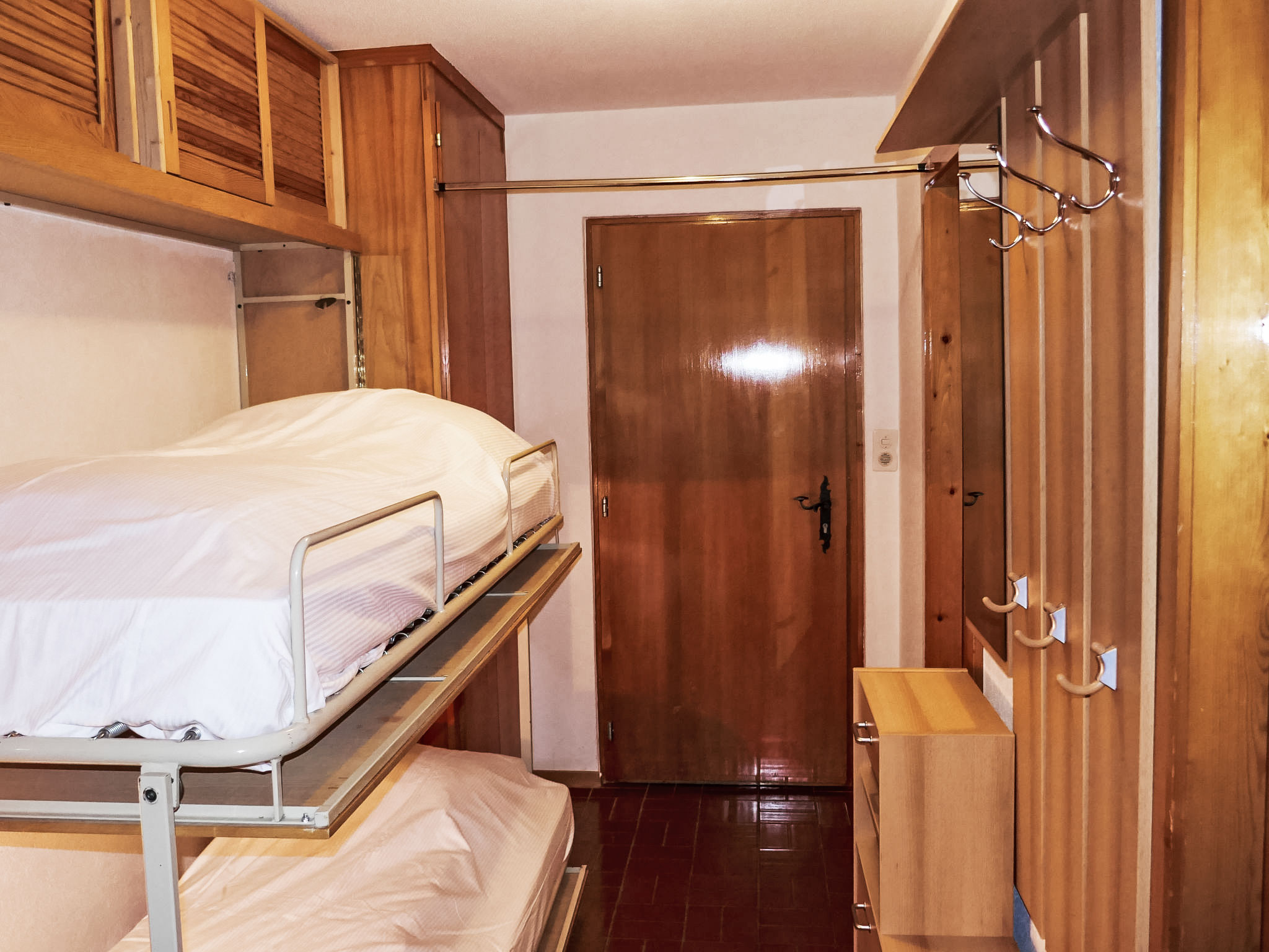 "Christiania 2 Sbel", 1-Zimmer-Wohnung 38 m2, im erhöhten Erdgeschoss. Wohn-/Esszimmer mit 1 Ausziehbett (2 Pers. 2 x 90 cm, Länge 190 cm), Kabel-TV (Flachbildschirm). Ausgang zum Balkon. Eingang mit 1 x 2 Etagenbetten (80 cm, Länge 180 cm). Küche (3 Kochplatten, Backofen, Toaster, Wasserkocher, Mikrowelle, elektrische Kaffeemaschine, Kapseln für die Kaffeemaschine (Delizio) extra, Fondue Set (Chinoise, Käse)). Bad/WC. Balkon, Nordlage. Sicht auf die Berge und die Ortschaft. Zur Verfügung: Haartrockner. Internet (WLAN, gratis). Bitte beachten: Nichtraucher-Unterkunft, kein Parkplatz. Maximal 1 Haustier/Hund erlaubt. Anstelle eines abgeschlossenen Schlafzimmers befinden sich manche Schlafplätze in einem offenen Bereich (Galerie, Nische etc.).