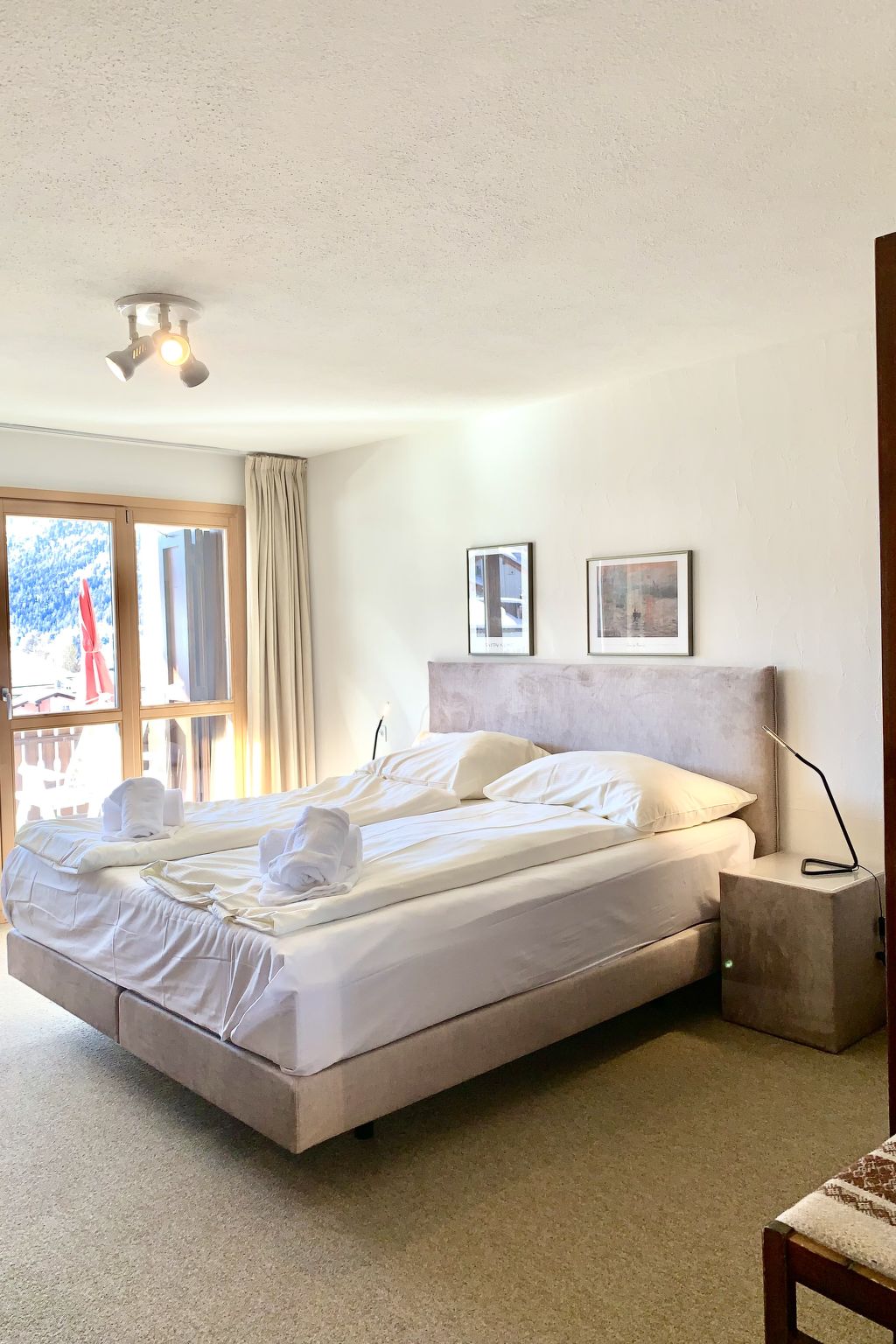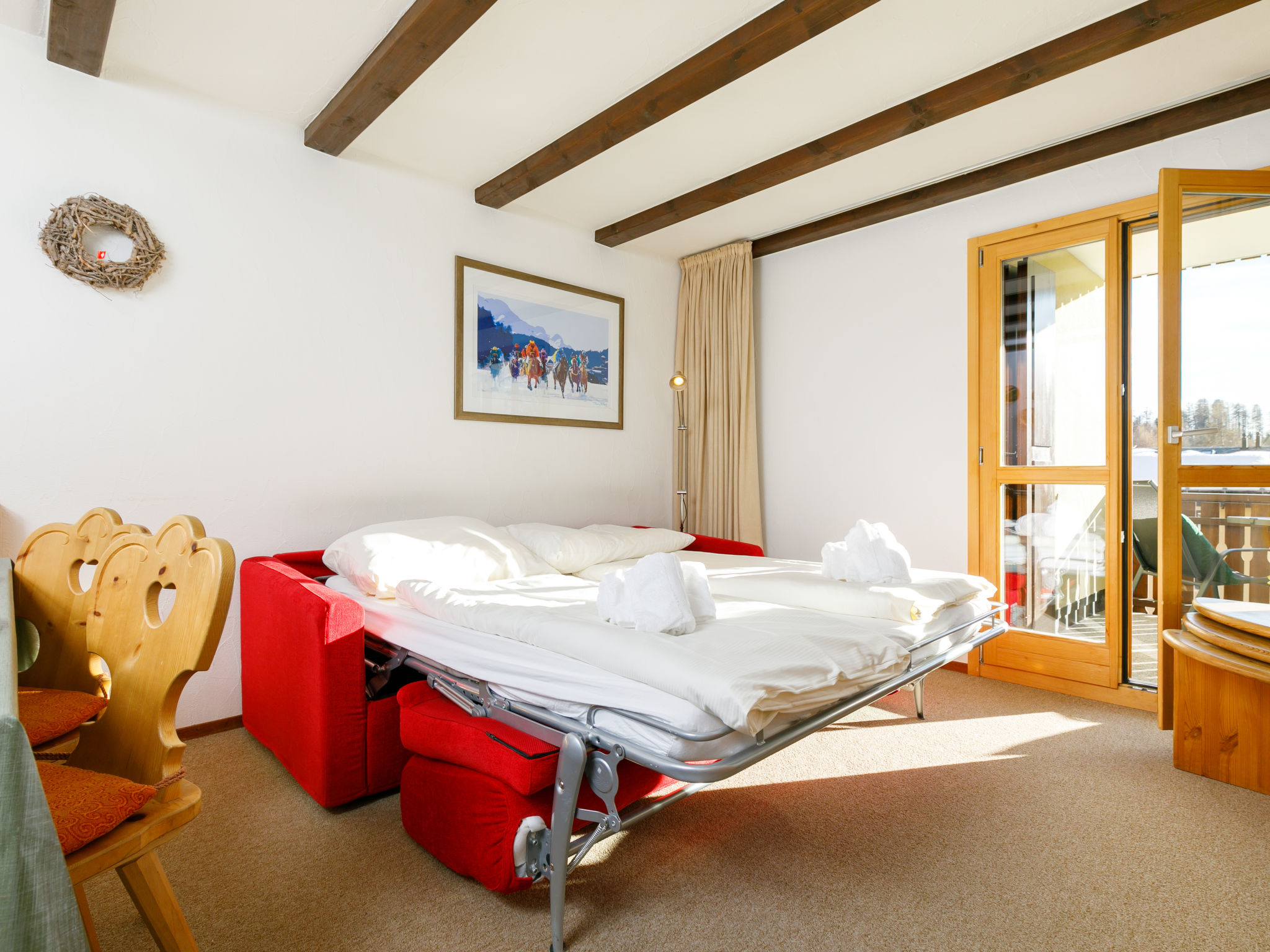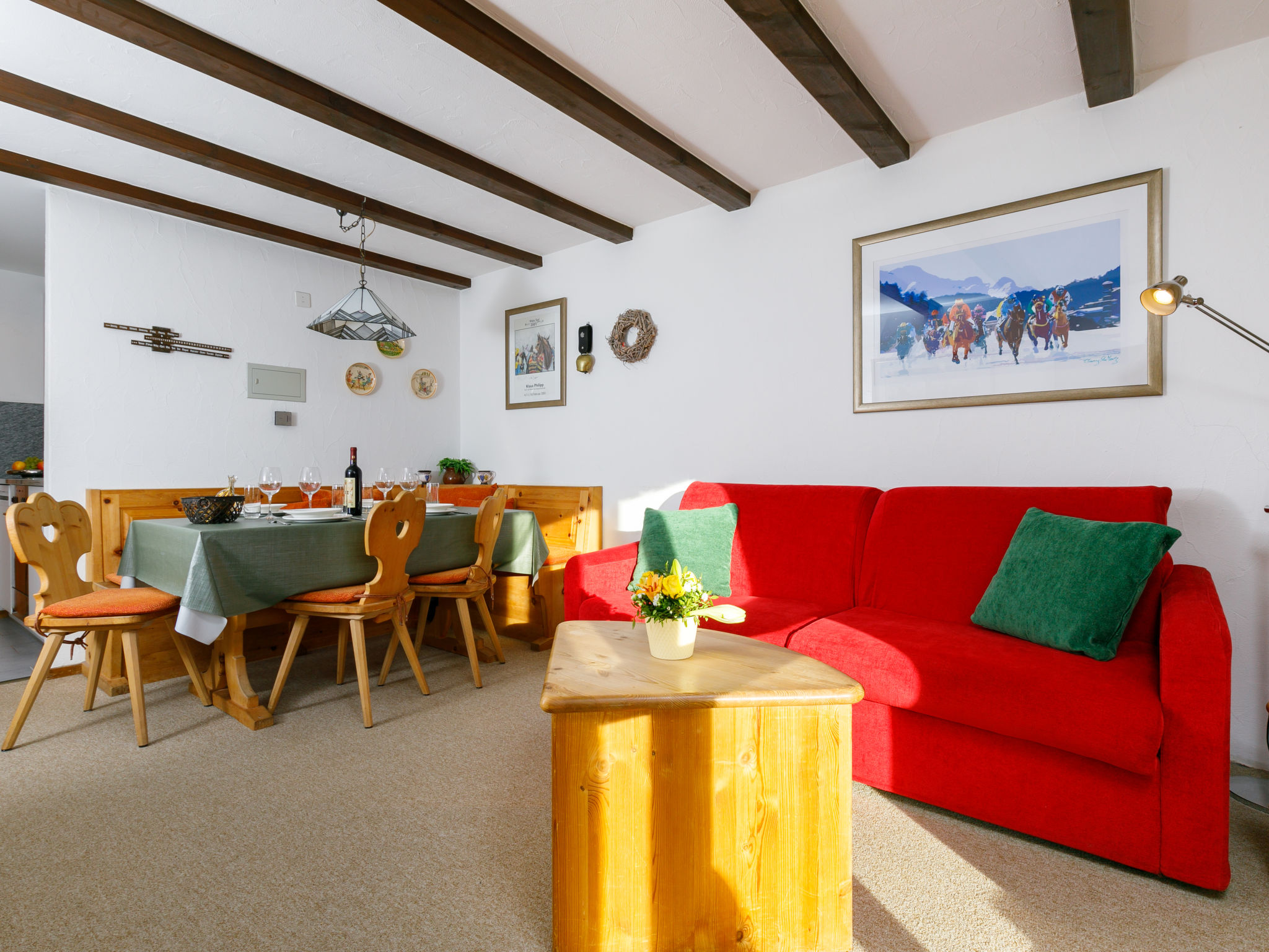 "Residenza Chesa Margun 67-3", 2-Zimmer-Wohnung 50 m2. Sehr gemütlich eingerichtet: Wohn-/Esszimmer mit 1 Doppeldiwanbett, TV und Radio. Ausgang zum Balkon. 1 Zimmer mit 2 Betten. Im Eingang (Backofen, Geschirrspüler, 3 Glaskeramikplatten). Bad/WC. Balkon, Südlage. Schöne Sicht auf die Berge und die Landschaft. Maximal 1 Haustier/Hund erlaubt.