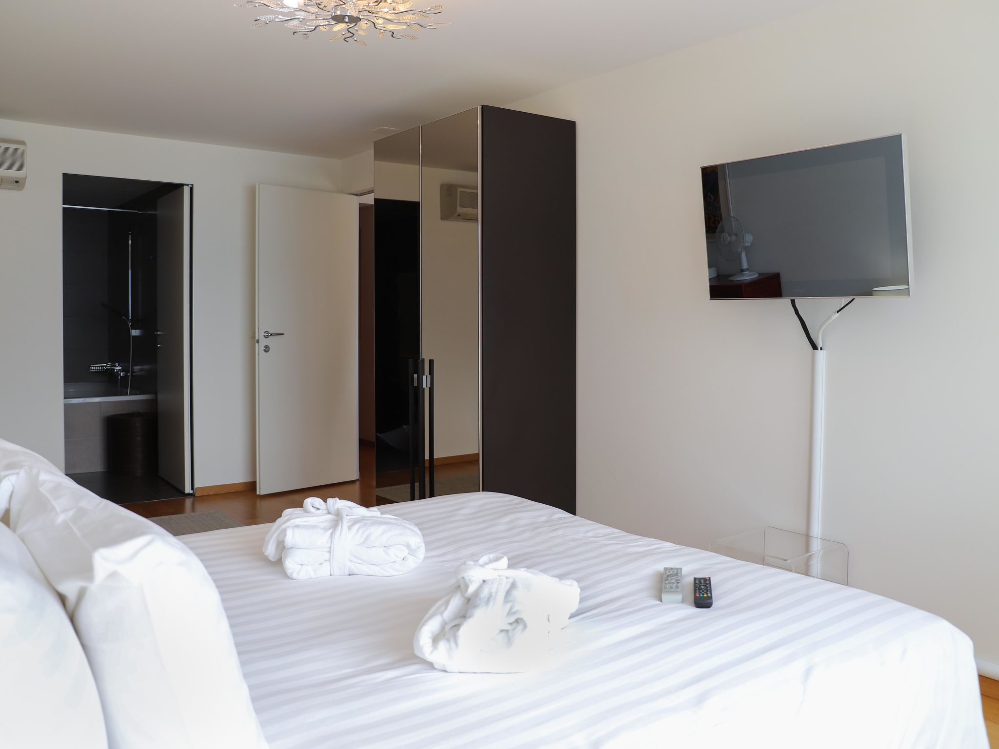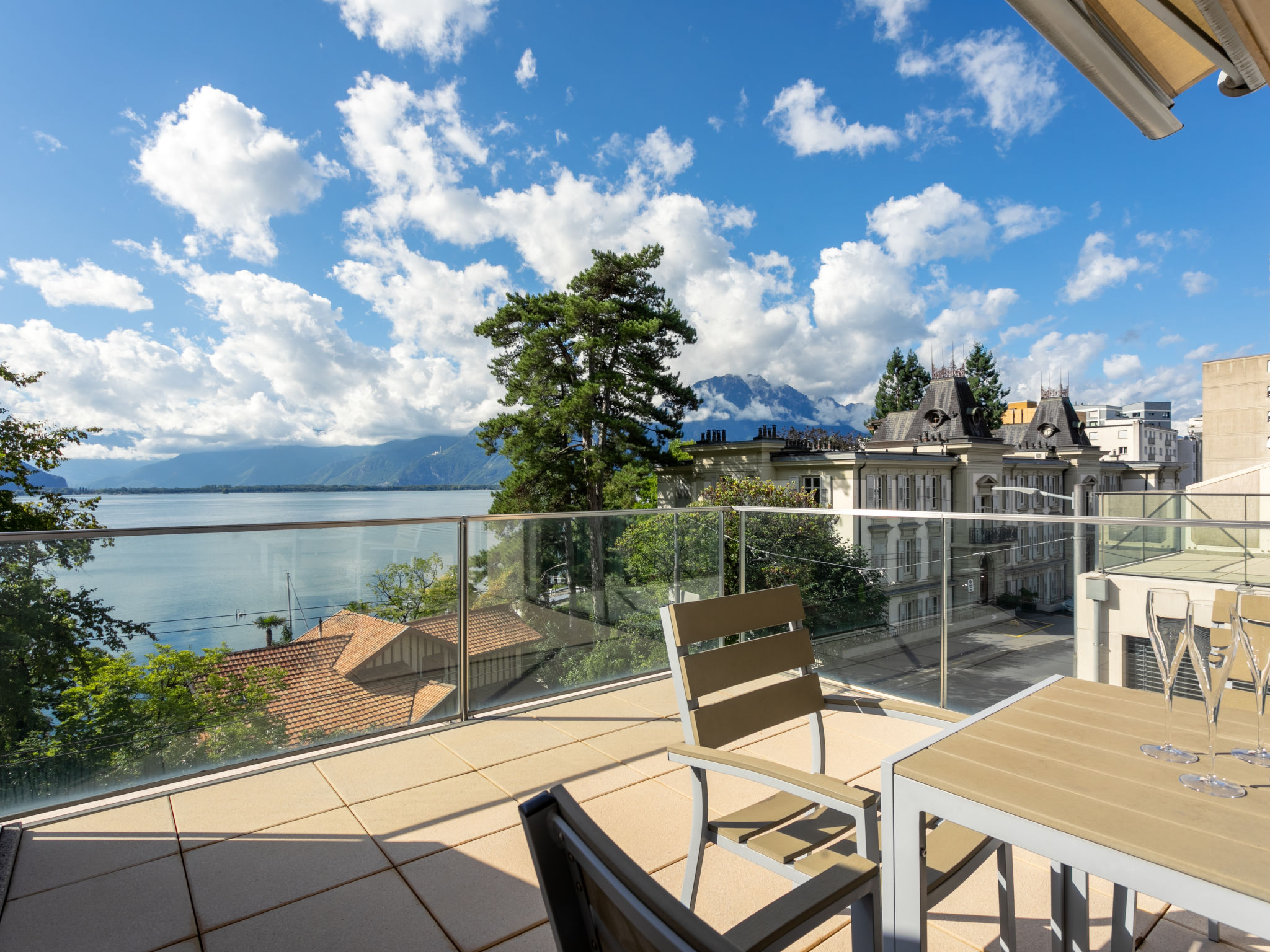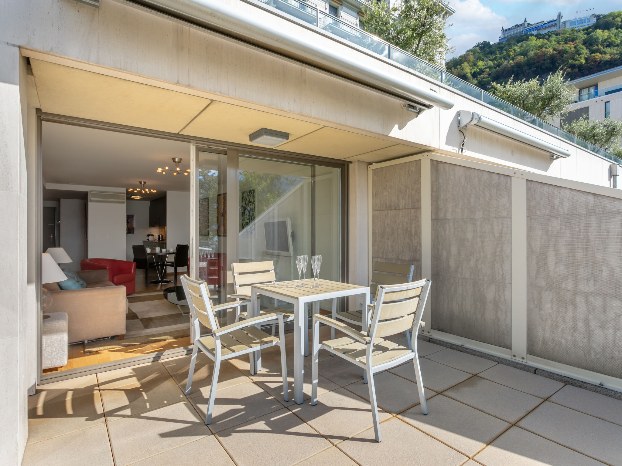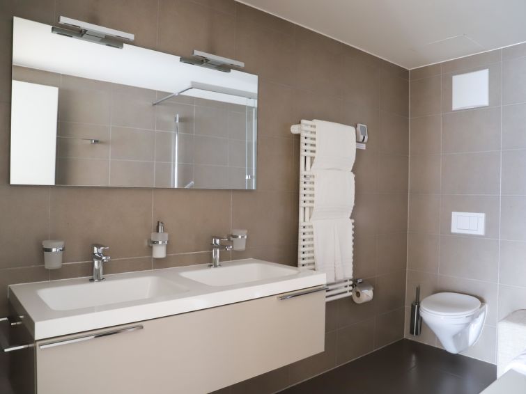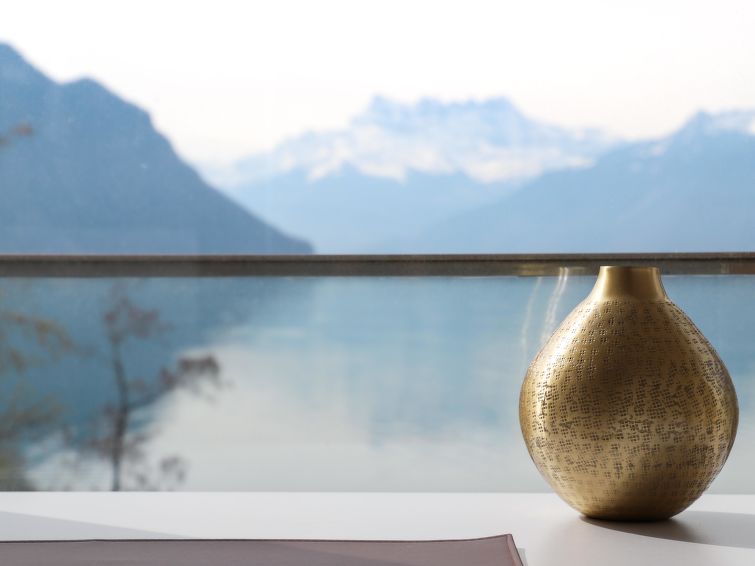 "La Terrasses C2.5", 2-Zimmer-Wohnung 72 m2. Luxuriös und geschmackvoll eingerichtet: Wohn-/Esszimmer mit Panoramafenster mit Kabel-TV, Internationale TV-Sender, Klimaanlage und elektrischem Rollladen. Ausgang zur Terrasse. 1 Zimmer mit 1 Doppelbett (180 cm, Länge 200 cm), Bad/WC und Klimaanlage. Ausgang zur Terrasse. Offene Küche (Geschirrspüler, 4 Glaskeramikplatten, Toaster, Wasserkocher, Mikrowelle, Tiefkühler, elektrische Kaffeemaschine, Kapseln für die Kaffeemaschine (Nespresso) extra, Racletteofen, Fondue Set (Chinoise, Käse)). Sep. WC, Doppelwaschbecken. E-Heizung. Terrasse 10 m2. Terrassenmöbel. Herrliche Sicht auf den See, die Berge, die Landschaft und die Ortschaft. Zur Verfügung: Waschmaschine, Wäschetrockner, Bügeleisen, Haartrockner. Internet (WLAN, gratis). Garage Nr. 165 auf dem Grundstück, Höhe 190 cm. Bitte beachten: Nichtraucher-Unterkunft, Parkplatz nur für kleine Wagen.