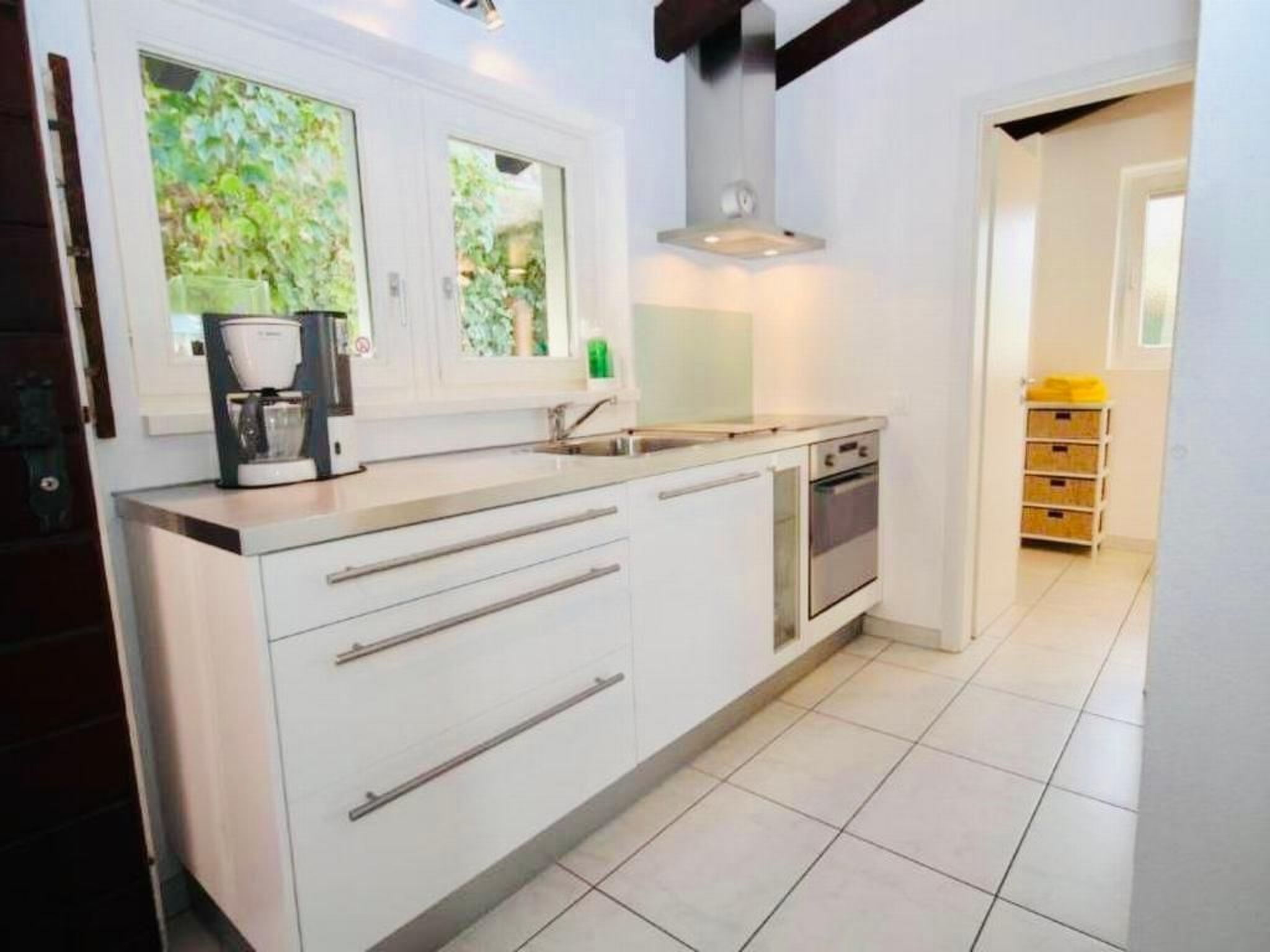 Beim Betreten der Wohnung erwartet Sie eine modern eingerichtete Küche mit allem erdenklichen Komfort, darunter ein Glaskeramikkochfeld, Backofen, Kühlschrank mit Tiefgefrierfach und sogar eine Nespresso-Maschine. Das helle Wohnzimmer mit bequemem Leder-Sofa, Relaxsessel und einem runden Glastisch lädt zum Verweilen ein, während Sie über das Panoramafenster mit Insektenplissee und die seitlichen Fenster das Sonnenlicht genießen können. Hier sind Komfort und Funktionalität perfekt vereint.