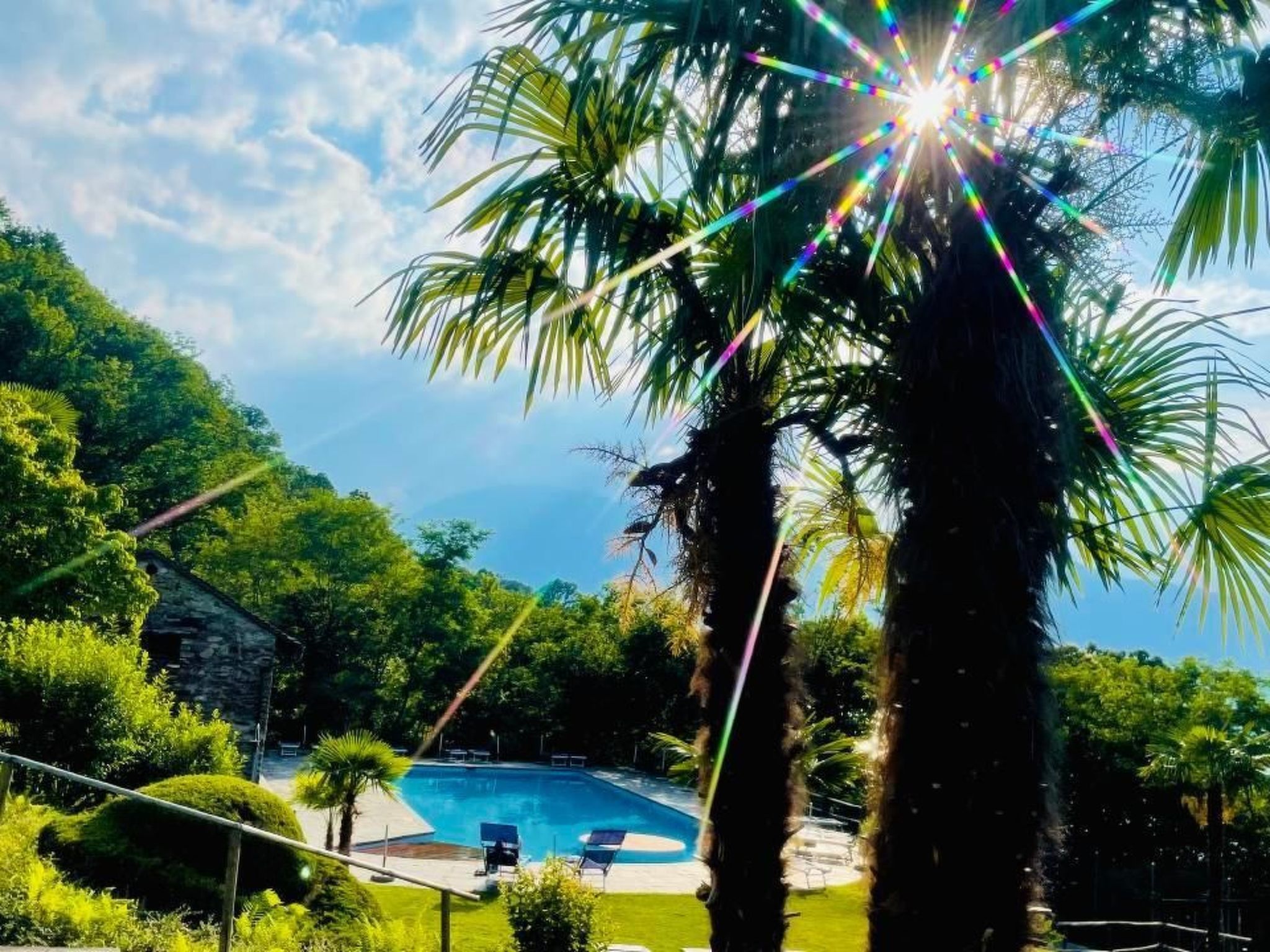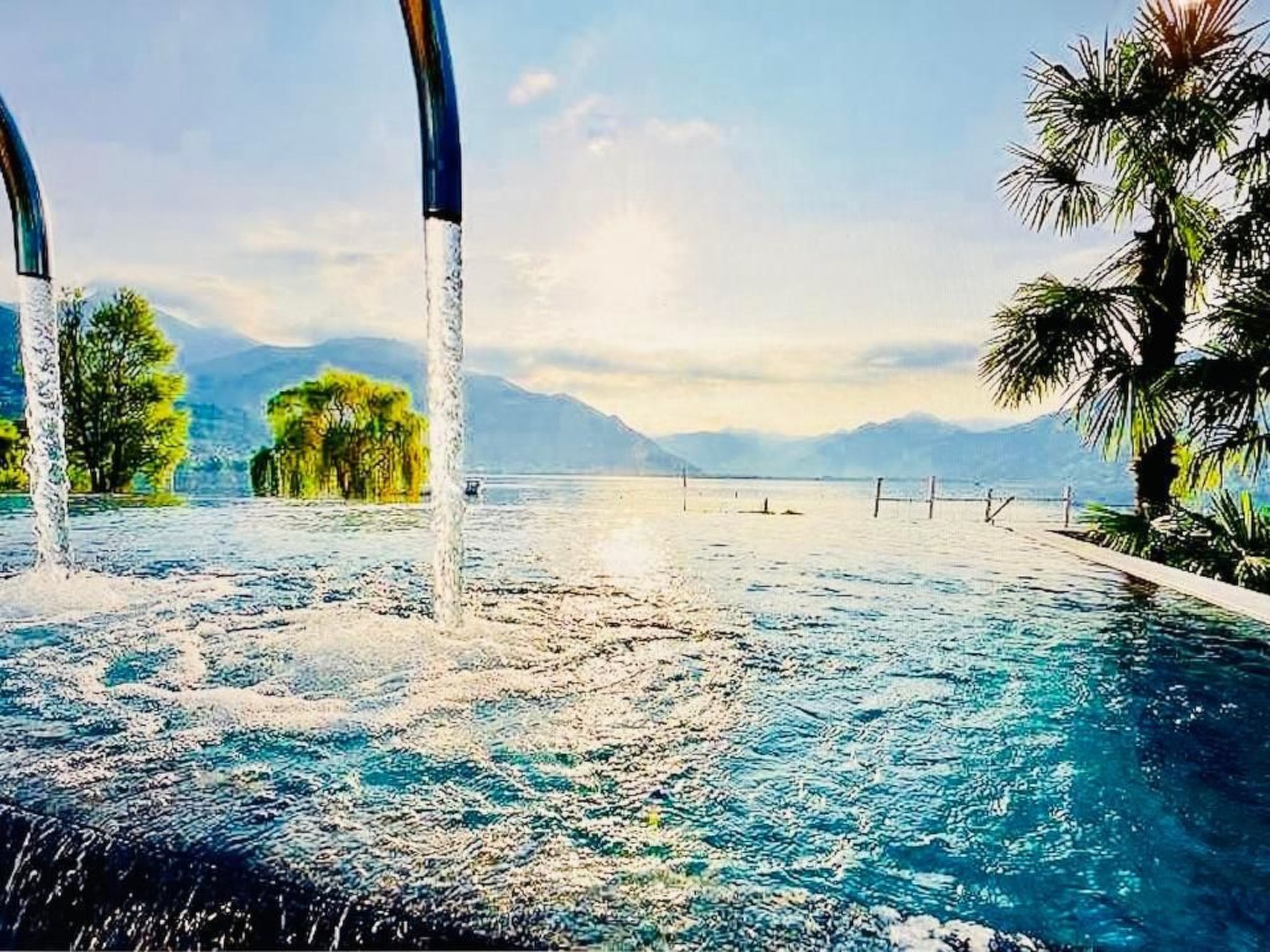 Der Außenbereich der Wohnung bietet mit seiner gedeckten Terrasse ein ideales Plätzchen zum Entspannen. Genießen Sie hier den atemberaubenden Seeblick und die beeindruckende Aussicht auf die Bergspitzen des Tessins. Eine Lounge-Möbel-Ausstattung sorgt dafür, dass Sie die Abendsonne in voller Pracht erleben können. Zusätzlich gewährt der parkähnlich gestaltete und gepflegte Garten mit Pool, Liegestühlen und weiteren Freizeitmöglichkeiten Ihnen einen komfortablen Aufenthaltsort im Freien.