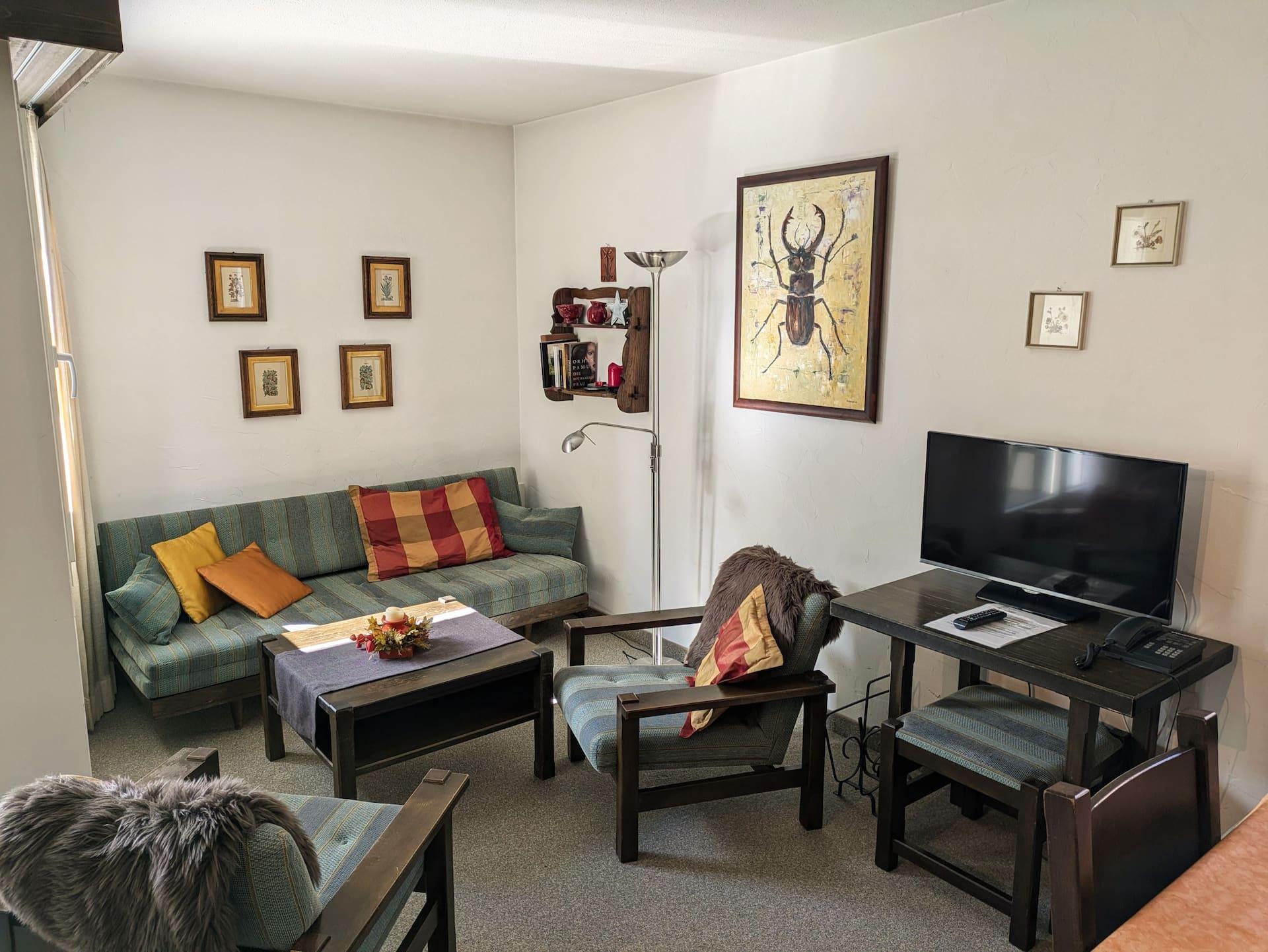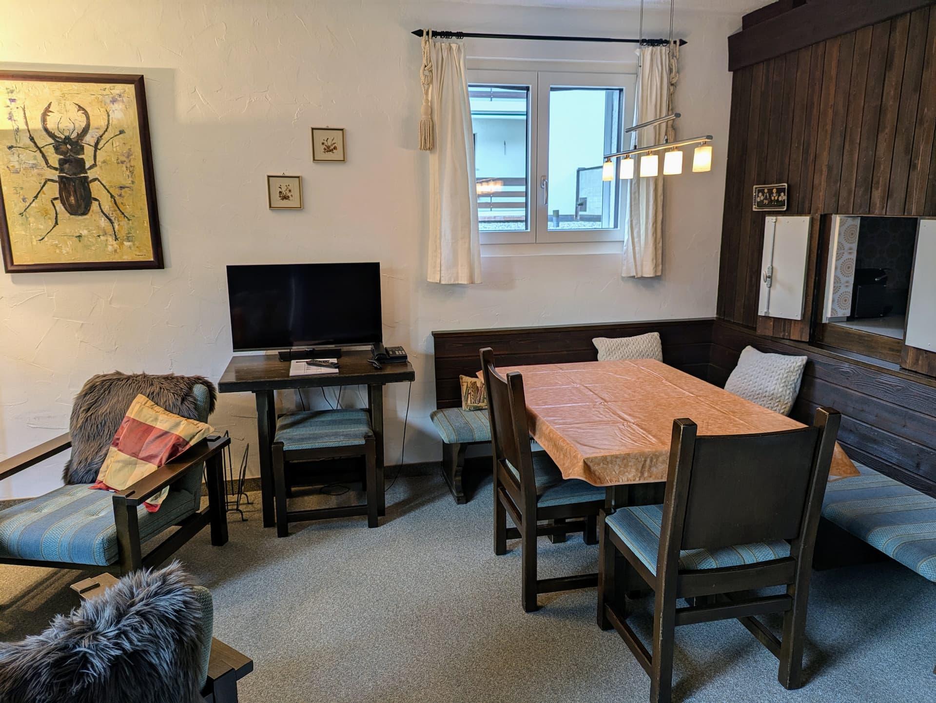 Appartementhaus Chesa Clois abseits der Hauptstrasse an ruhiger, sonniger Lage, 200 m vom Zentrum. Langlaufloipe, Bergbahnen im Winter auf Skis erreichbar. Eisbahn, Curling- und Tennisplätze in unmittelbarer Nähe. Dachterrasse, Hausbar (nur im Winter), Aufenthaltsraum mit TV, Kegelbahn (extra), Tischtennis, Billard (extra), Kinderspielzimmer, Kiosk, Lift, Waschküche, Kleines Hallenbad ands Sauna (extra).