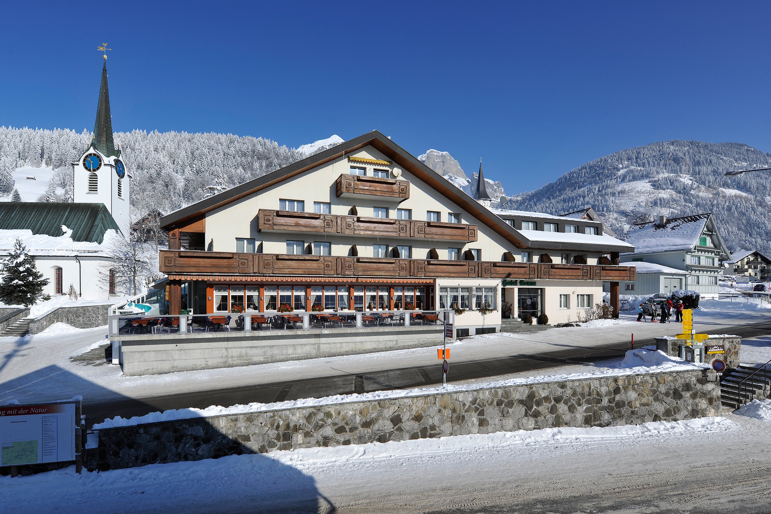 Das Bijou-Hotel im Dorfzentrum von Wildhaus verfügt über 26 heimelig eingerichtete Zimmer mit jeglichem Komfort. Die Mahlzeiten werden im gut bürgerlichen Hotel Restaurant mit Sonnenterrasse serviert. Die gemütlichen Zimmer sind alle mit hellem Föhrenholz ausgekleidet und mit viel Liebe zum Detail eingerichtet. Die etwas kleineren Nordzimmer sind ruhig und zur Bergseite gelegen. Die Südzimmer mit Balkon bieten Ausblicke auf den Schafberg und die Churfirsten-Kette.