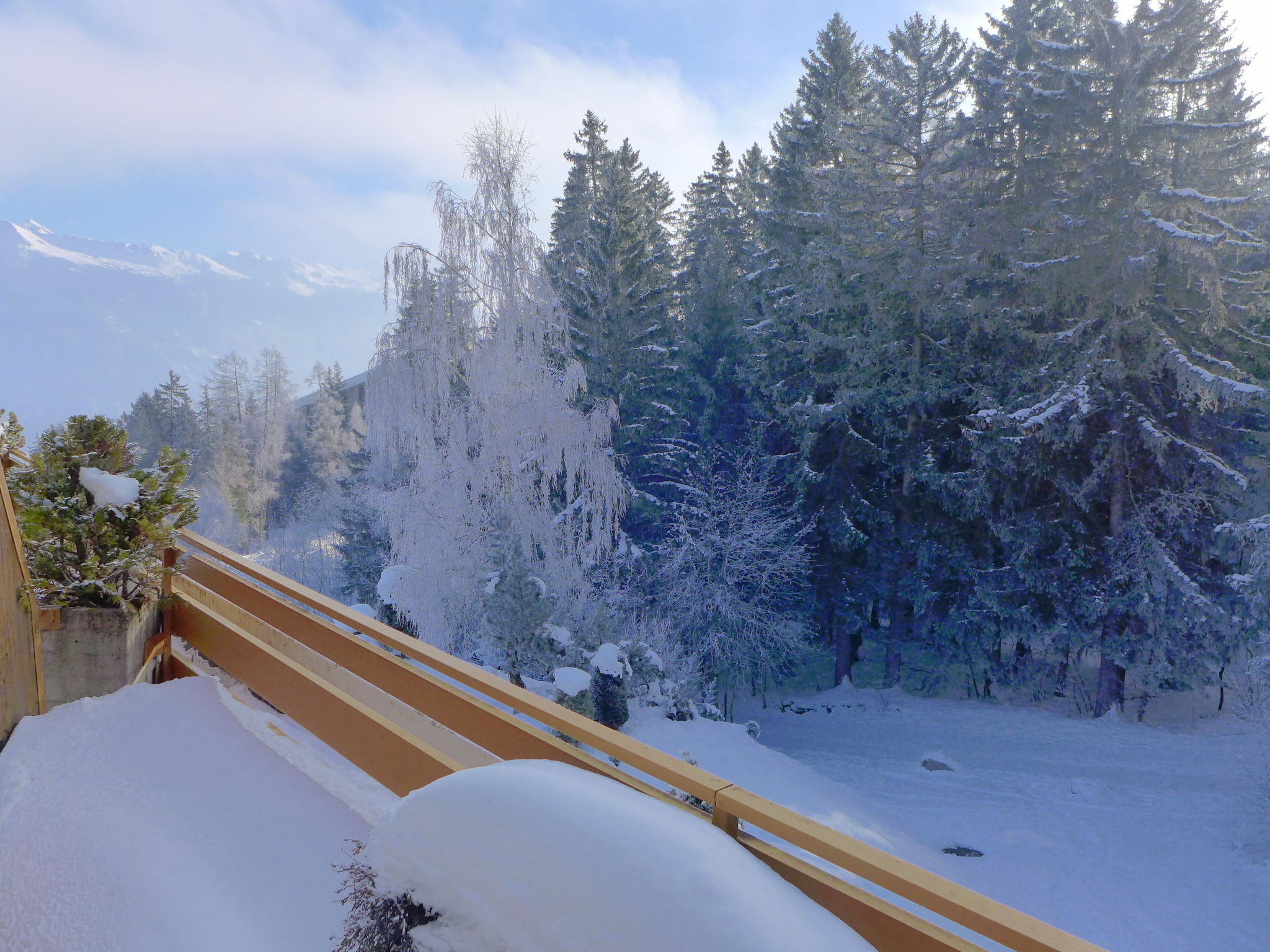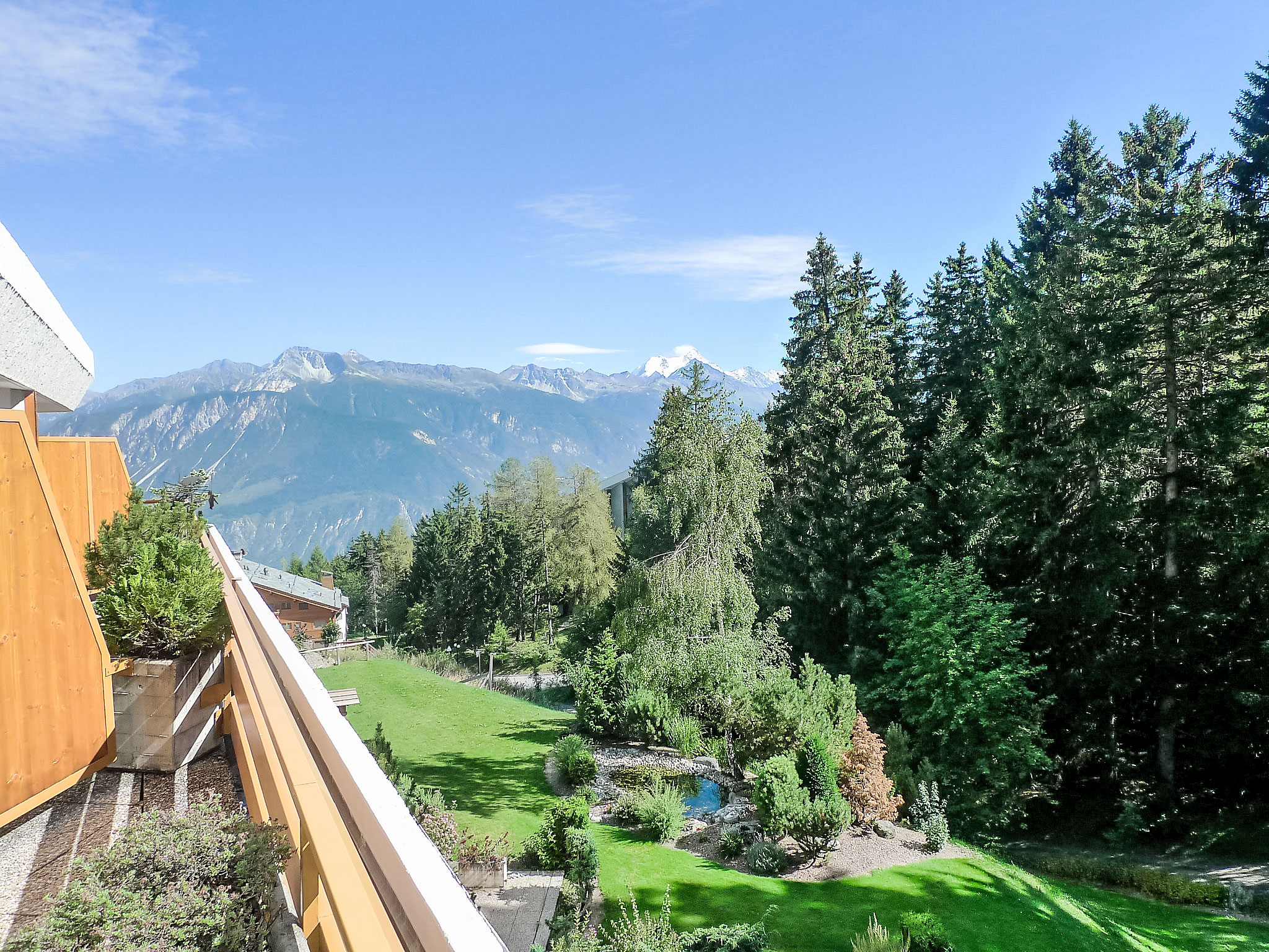 Schwimmbad (ca. 26°) und Sprudelbad (ab 16 Jahre alt) im November geschlossen. Das Gebäude wurde auf einem geneigten Grundstück erbaut. Die Stockwerke werden als Ebenen betrachtet, die ab Residenzboden nummeriert sind. Bei starkem Schneefall, ist es gemäss den Anweisungen des Administrators untersagt, die Terrassen vom Schnee zu räumen. Terrassenhaus "Terrasse des Alpes". Im Ortsteil Marigny, 400 m vom Zentrum von Montana, sonnige Lage, 1.5 km vom See, 1.5 km vom Skigebiet, Richtung Südwesten. Zur Mitbenutzung: Hallenbad beheizt (12 x 5 m, saisonale Verfügbarkeit: 01.Jan. - 31.Okt. und 16.Dez. - 31.Dez. Öffnungszeiten Schwimmbad: 08:00-20:00). Sprudelbad, Terrasse. Im Hause: Aufenthaltsraum, Fahrstuhl, Skiraum, Zentralheizung, Waschmaschine, Wäschetrockner (zur Mitbenutzung, extra). Einkaufsgeschäft, Supermarkt, Restaurant, Bar, Café 400 m, Zentrum zu Fuss in 5 Minuten erreichbar, Bushaltestelle "Montana Poste" 300 m, Bahnstation "Funiculaire Montana Gare" 450 m, Badesee "Moubra" 1.5 km. Golfplatz (18 Loch) 3.8 km, Skisportanlagen 1.5 km. Bitte beachten: Gratis Skibus.