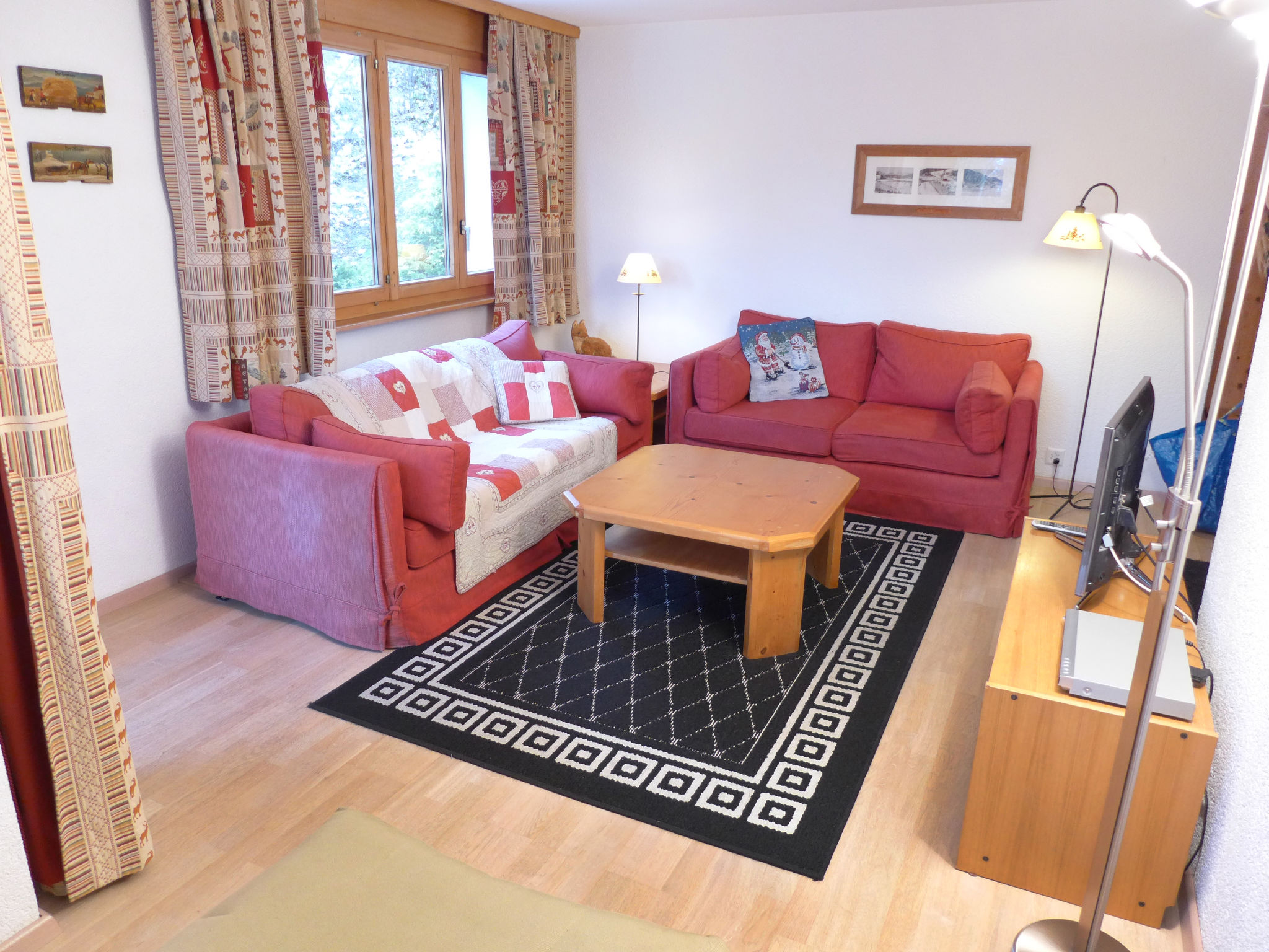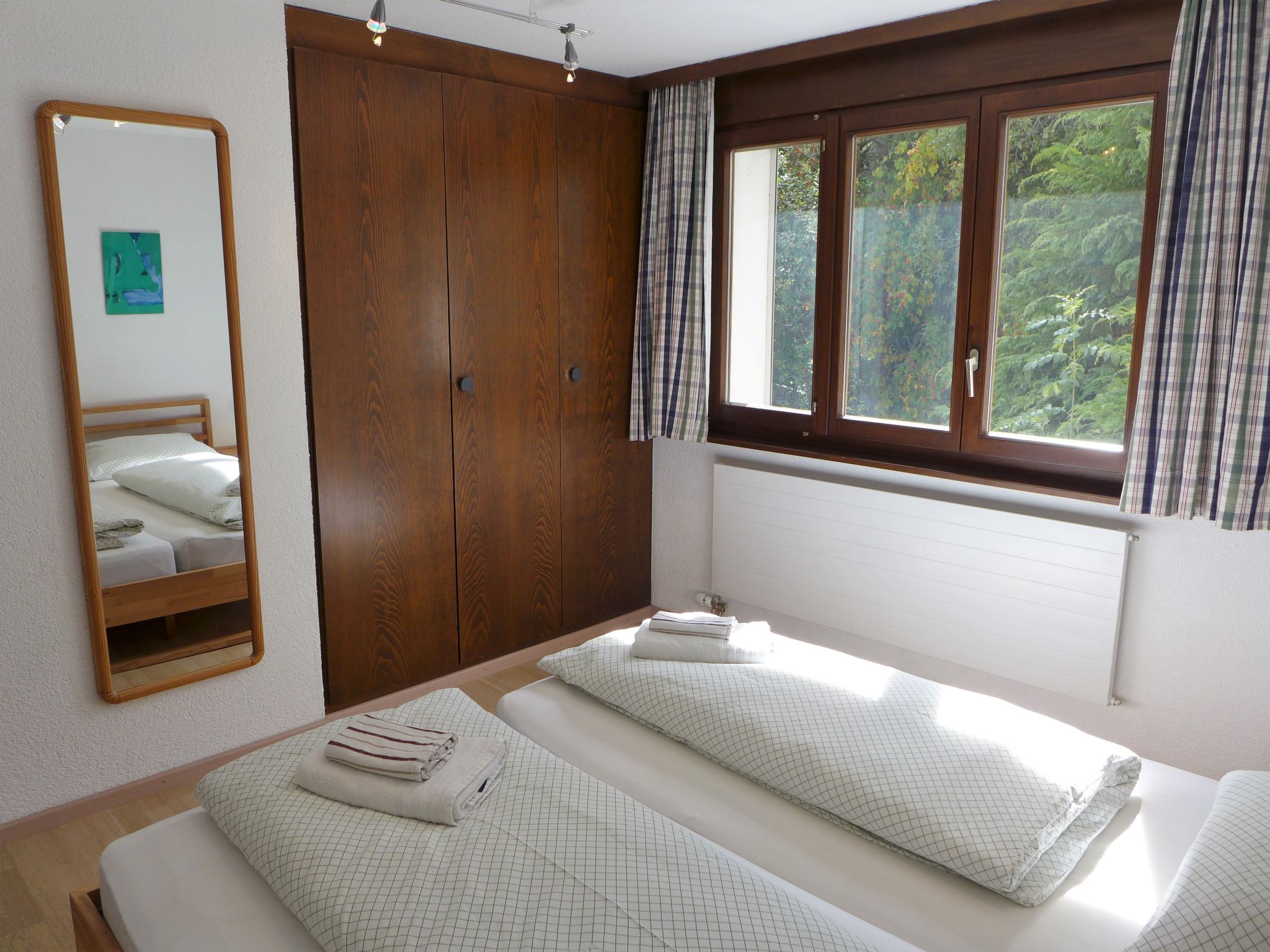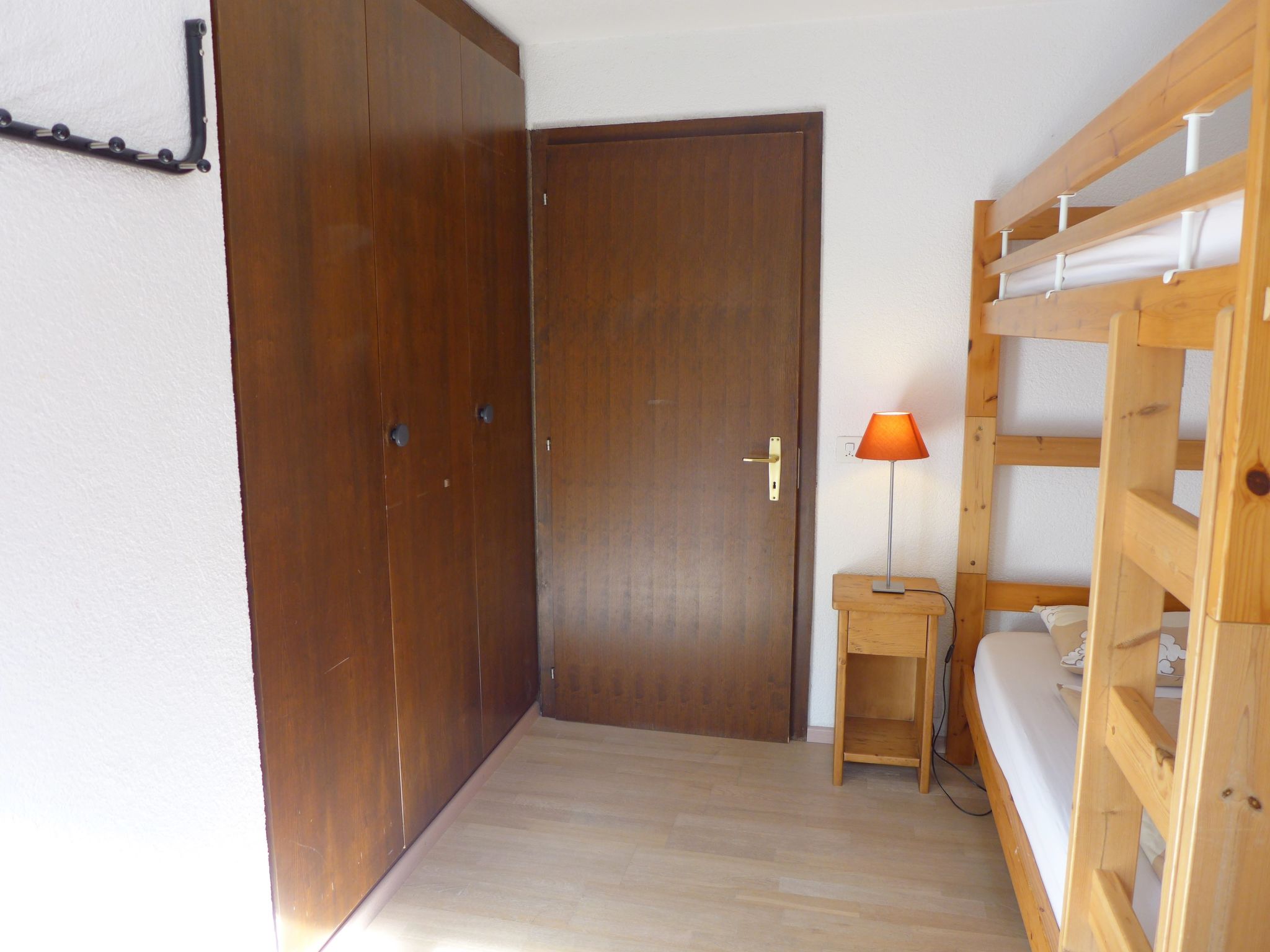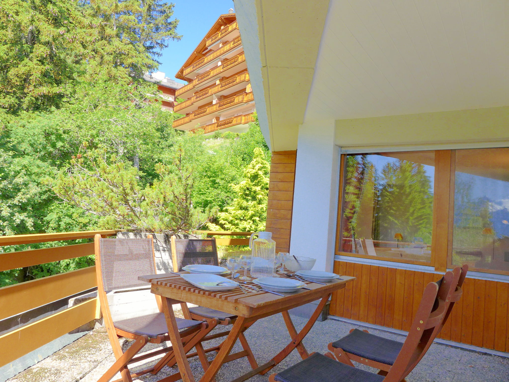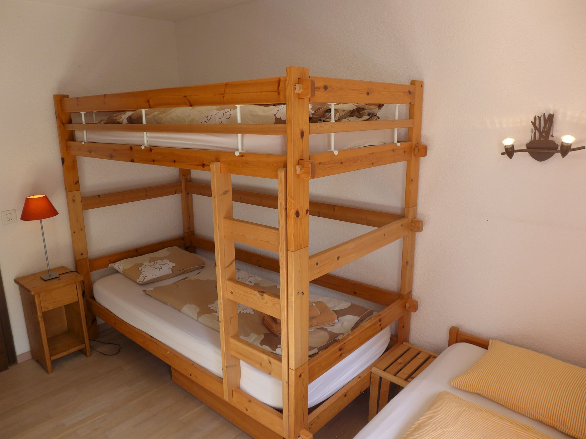 "Terrasse Des Alpes 917", 3-Zimmer-Wohnung 75 m2 im 4. Stock. Teilweise renoviert im Jahre 2025: Wohn-/Esszimmer mit 1 Diwanbett (140 cm, Länge 190 cm), Kabel-TV, Radio, CD und DVD. 1 Kinderzimmer mit 1 Bett (90 cm, Länge 190 cm), 1 x 2 Etagenbetten (90 cm, Länge 190 cm). 1 Zimmer mit 1 Doppelbett (2 x 90 cm, Länge 200 cm). Kochnische (Backofen, Geschirrspüler, 4 Glaskeramikplatten, Toaster, Wasserkocher, elektrische Kaffeemaschine, Kapseln für die Kaffeemaschine (NESPRESSO) extra, Fondue Set (Chinoise, Käse)). Bad/WC, Dusche/WC. Terrasse 10 m2, Westlage. Terrassenmöbel, Abstellkammer. Sicht auf die Berge und den Wald. Zur Verfügung: Kinderhochstuhl, Haartrockner. Internet (WLAN, gratis). Garage Nr. 76, Höhe 200 cm, Breite 230 cm. Bitte beachten: Nichtraucher-Unterkunft.