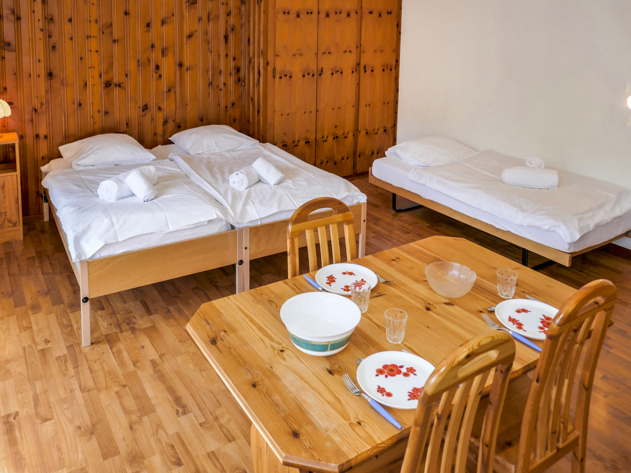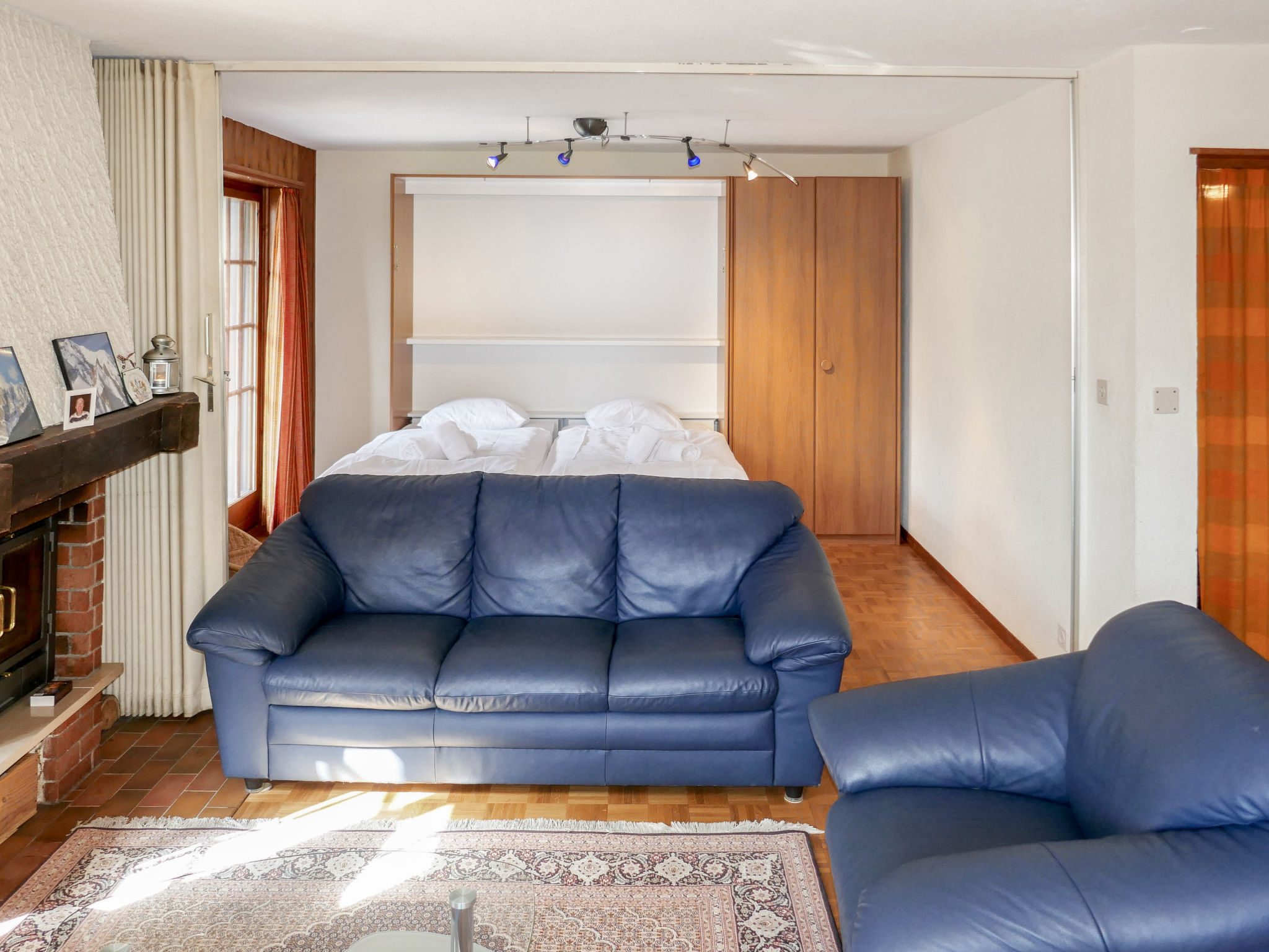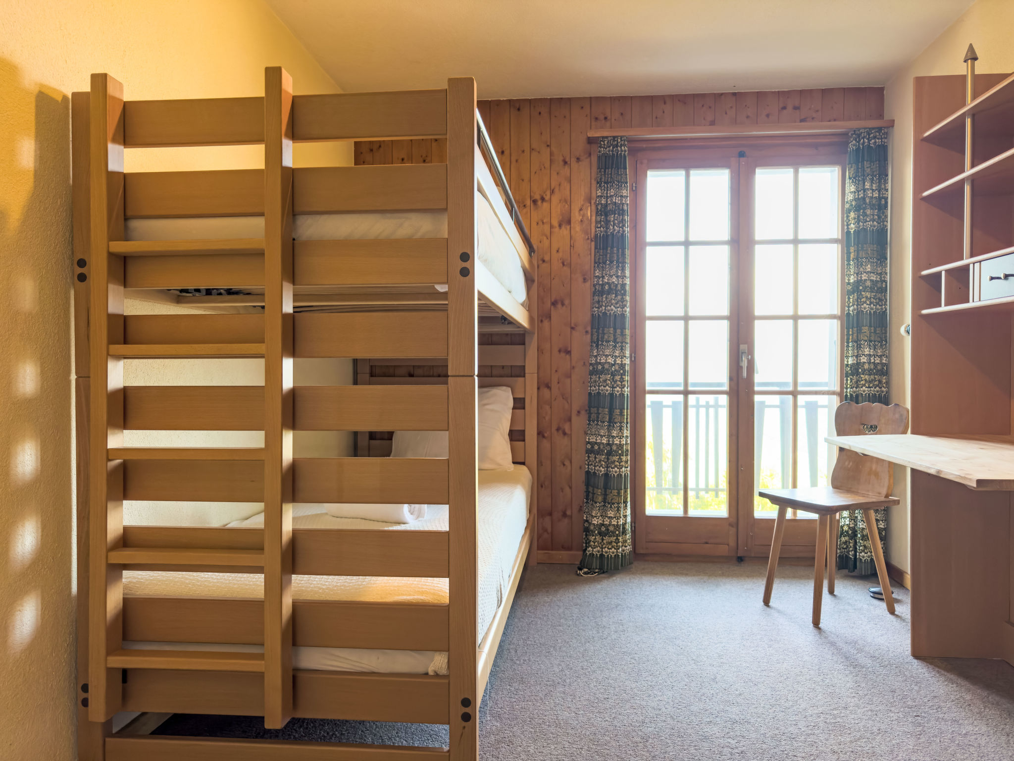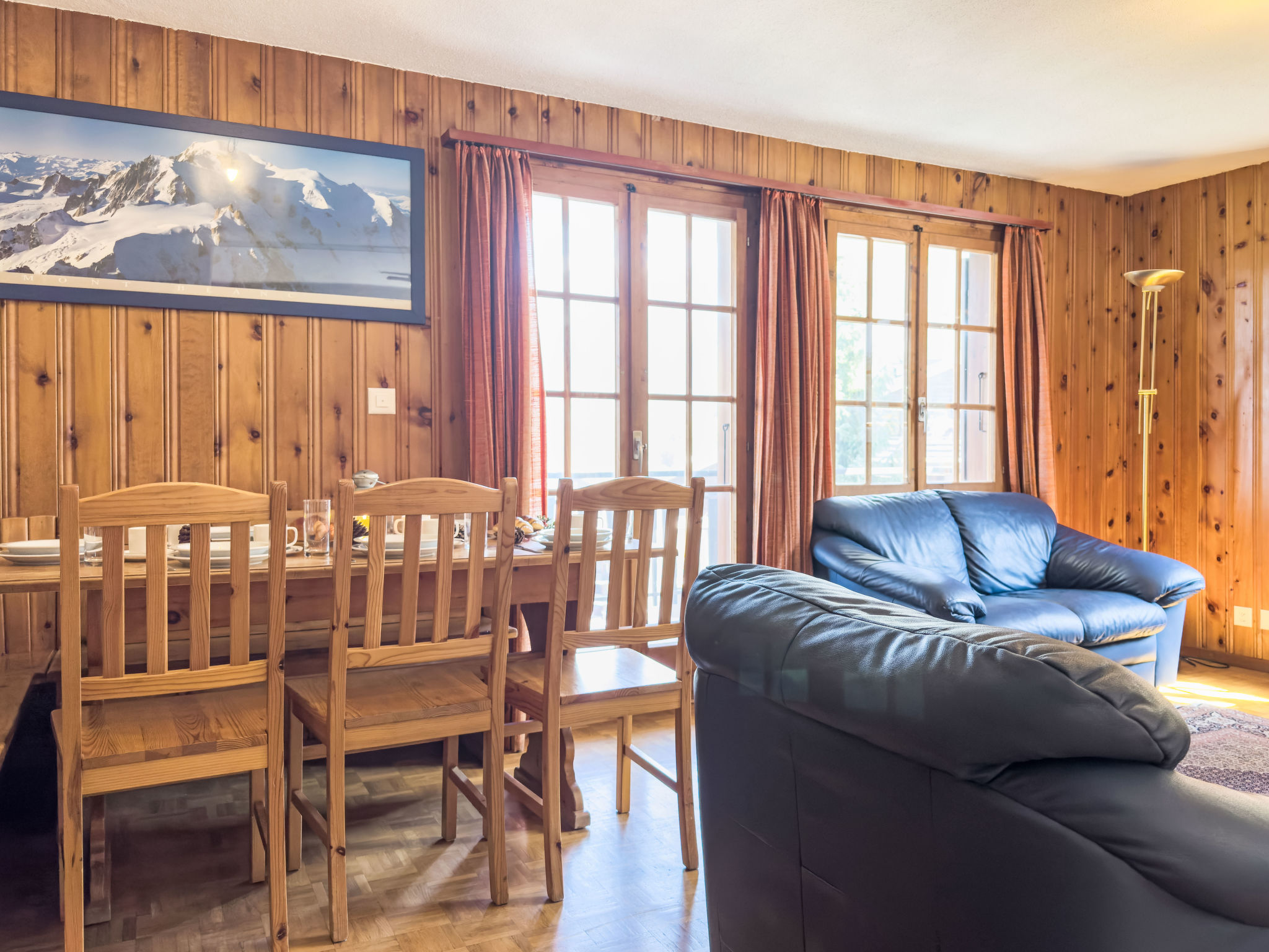 "Mont-Soleil 2&3", 4-Zimmer-Wohnung 120 m2 im 1. Stock. Teilweise renoviert im Jahre 2024, zweckmässig eingerichtet: Wohnzimmer mit Schiebetür mit 2 Wandklappbetten (90 cm, Länge 200 cm), offenem Kamin und Kabel-TV. Ausgang zum Balkon, Richtung Osten und Richtung Süden. 1 Zimmer mit 1 x 2 Etagenbetten (90 cm, Länge 200 cm). Ausgang zum Balkon, Richtung Norden. 1 Zimmer mit 1 franz. Bett (140 cm, Länge 200 cm). 1 Doppelzimmer 30 m2 mit 3 Betten (90 cm, Länge 190 cm), Bad/WC. Ausgang zum Balkon. Küche (4 Kochplatten, Backofen, Geschirrspüler, Toaster, Mikrowelle, Tiefkühler, Racletteofen, Fondue Set (Käse)). Bad/WC, sep. WC. 3 Balkone. Balkonmöbel. Sicht auf die Berge und das Tal. Zur Verfügung: Internet (Wireless LAN, gratis). Bitte beachten: ein Doppelzimmer liegt außerhalb der Wohnung. Nichtraucher-Unterkunft. Keine interne Verbindung zwischen den separaten Wohneinheiten. Dreibettzimmer mit separatem Zugang oder vom gemeinsamen Balkon aus.