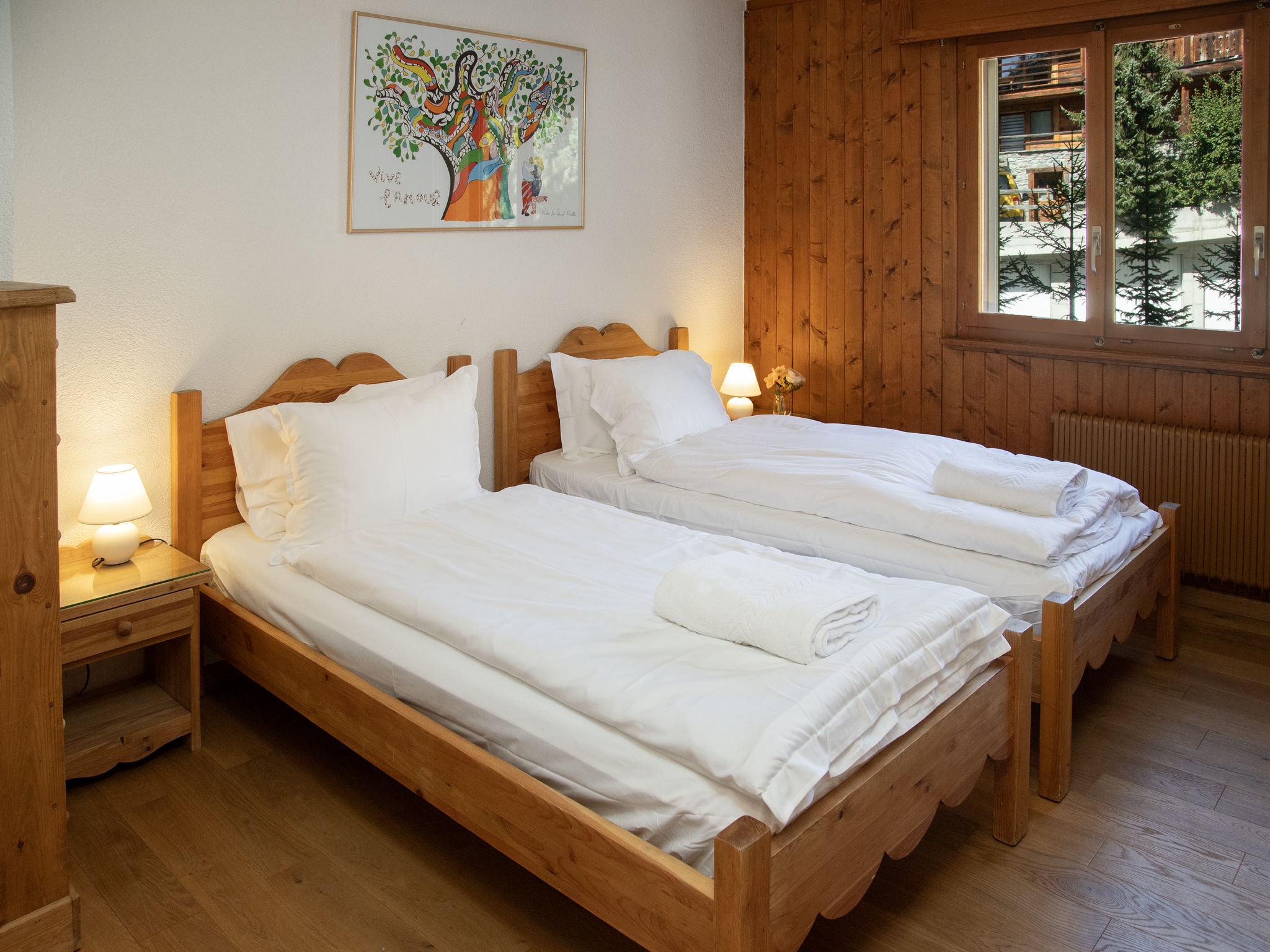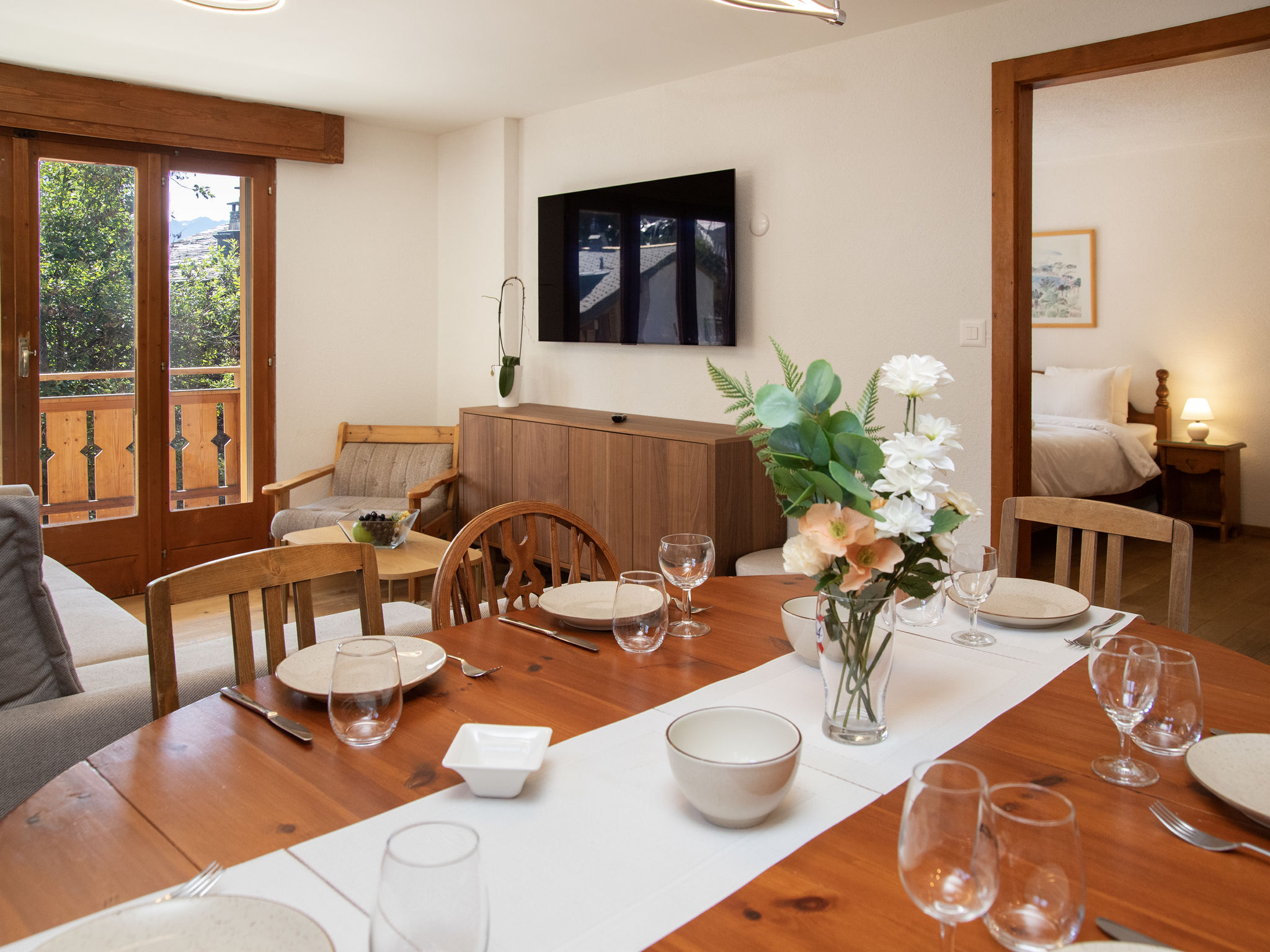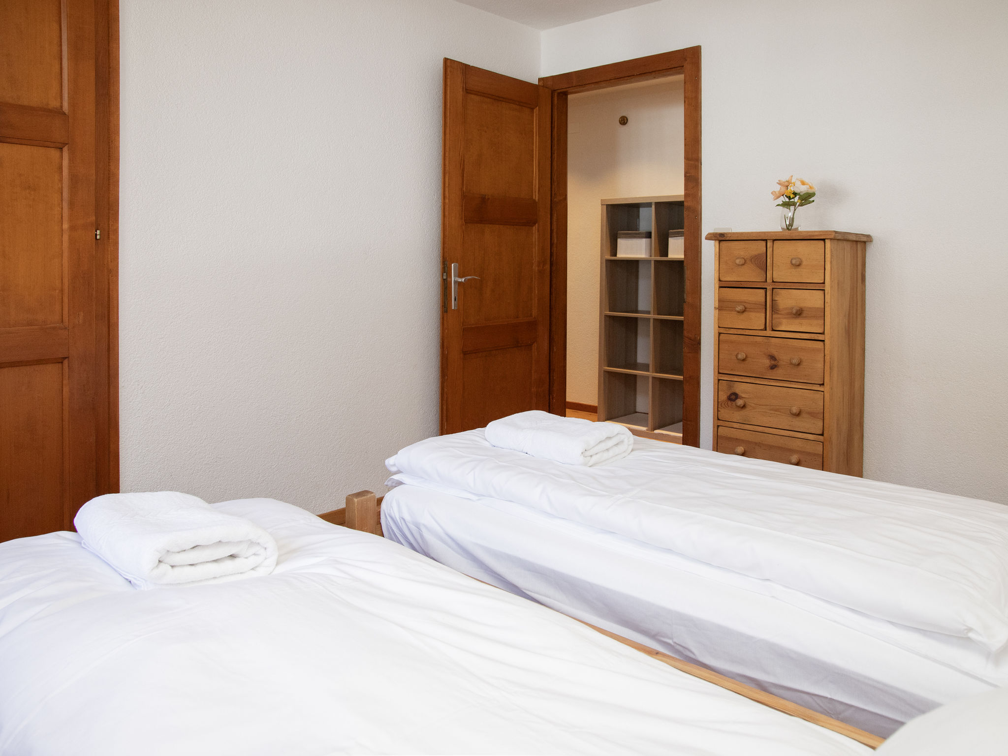 "Val Fleuri 208", 4-Zimmer-Wohnung 100 m2 im 2. Stock, Südlage. Schön und geschmackvoll eingerichtet: grosses Wohn-/Esszimmer mit Kabel-TV (Flachbildschirm). Ausgang zur Terrasse. 1 grosses Zimmer mit 1 Doppelbett (1 x 160 cm, Länge 200 cm). Ausgang zur Terrasse. 2 grosse Zimmer, jedes Zimmer mit 2 Betten (90 cm, Länge 200 cm). Offene Küche (4 Kochplatten, Backofen, Geschirrspüler, Toaster, Wasserkocher, Mikrowelle, Tiefkühler, elektrische Kaffeemaschine, Kapseln für die Kaffeemaschine (Nespresso) extra, Racletteofen, Fondue Set (Käse)) mit Durchreiche. Bad/WC, Dusche/WC. Heizung, E-Heizung, Fussbodenheizung. Parkettboden. Sehr schöne Sicht auf die Berge. Zur Verfügung: Waschmaschine, Wäschetrockner, Haartrockner. Internet (WLAN, gratis). Parkplatz. Bitte beachten: Nichtraucher-Unterkunft.