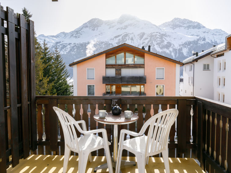 "Apt.17", 2-Zimmer-Wohnung 48 m2. Hell, zweckmässig eingerichtet: Wohn-/Esszimmer mit 1 Diwanbett (80 cm, Länge 180 cm), Sat-TV, Radio und E-Heizung. Ausgang zum Balkon. 1 Zimmer mit 2 Betten. Küche (4 Kochplatten, Backofen, Geschirrspüler, elektrische Kaffeemaschine). Bad/WC. Balkon. Balkonmöbel. Sicht auf die Berge, das Tal und die Ortschaft. Zur Verfügung: Internet (WLAN). Parkplatz, Höhe 200 cm, Breite 288 cm. Bitte beachten: Nichtraucher-Unterkunft. Balkon Richtung Silvaplanersee und Hauptstrasse.