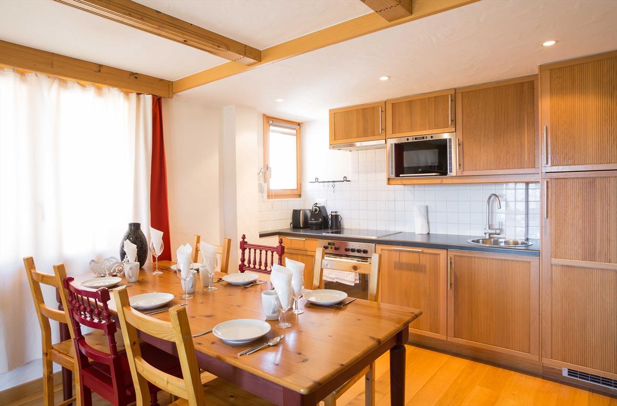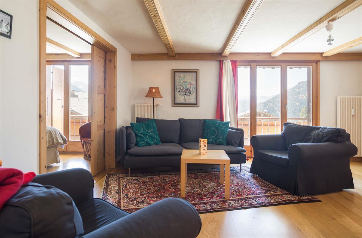 Wohnzimmer mit Essecke, Küche mit Geschirrspüler, Nespresso Kaffeemachine und Mikrowelle, ein Zimmer mit 2 Betten, ein Zimmer mit einem Bett, ein Doppelzimmer mit Dusche und WC, Bad mit WC und Waschmachine, Balkon Südseite, herrliche Aussicht. Kablefernsehen, Internet WIFI. Skiraum, reservierter Aussenparkplatz, ~79m2. Rue de Médran 45. HAUSTIERE VERBOTEN. NICHTRAUCHERWOHNUNG.