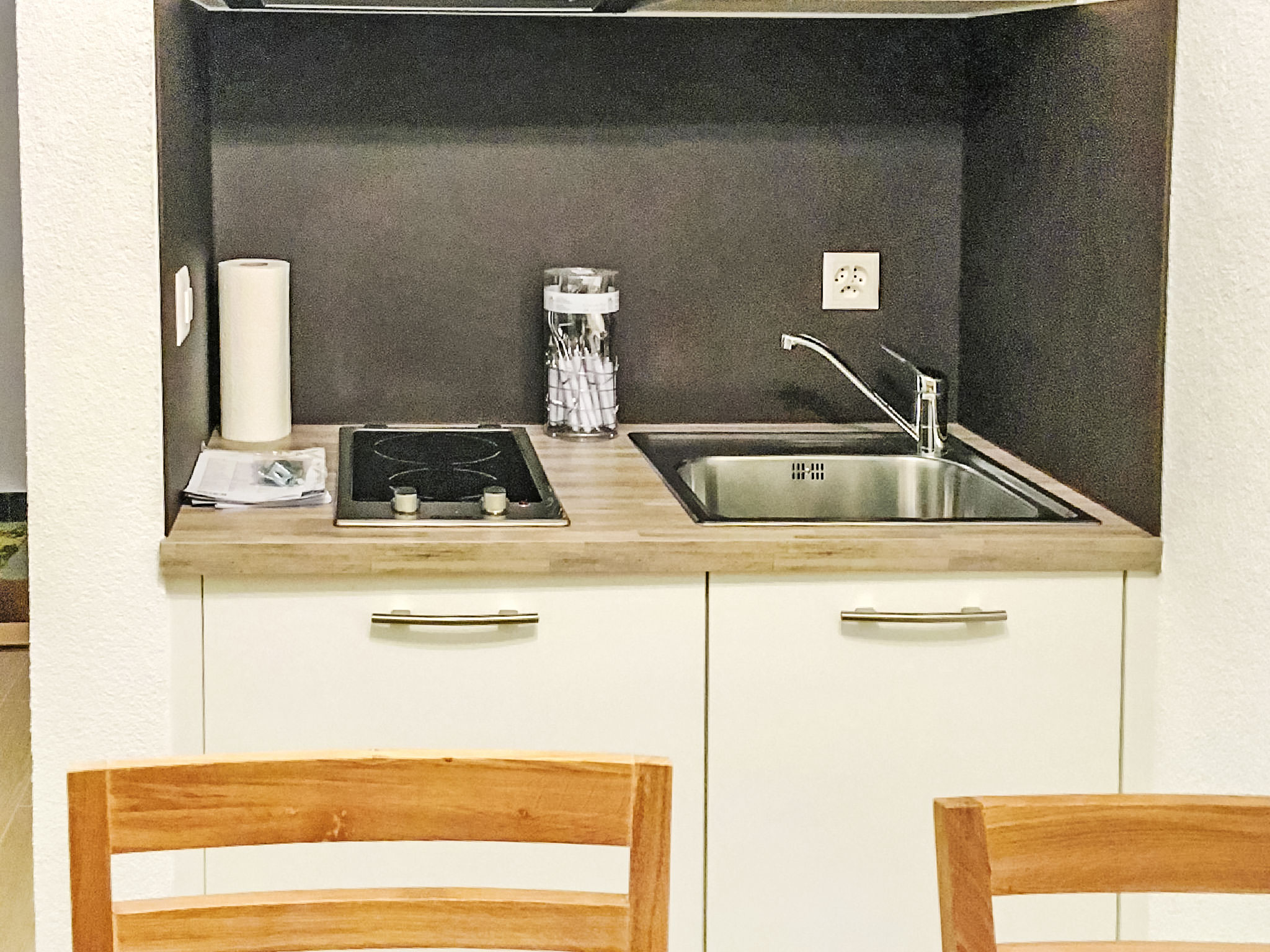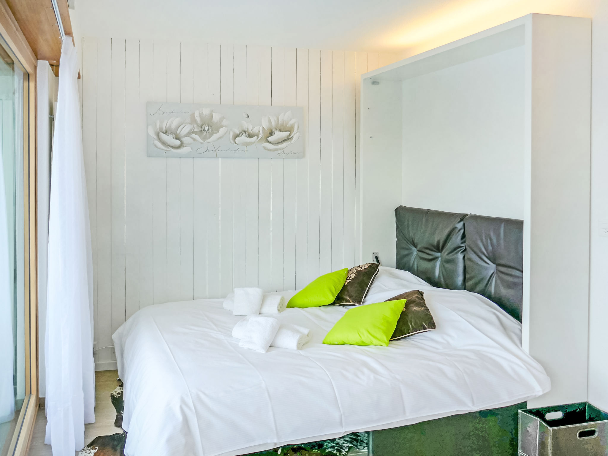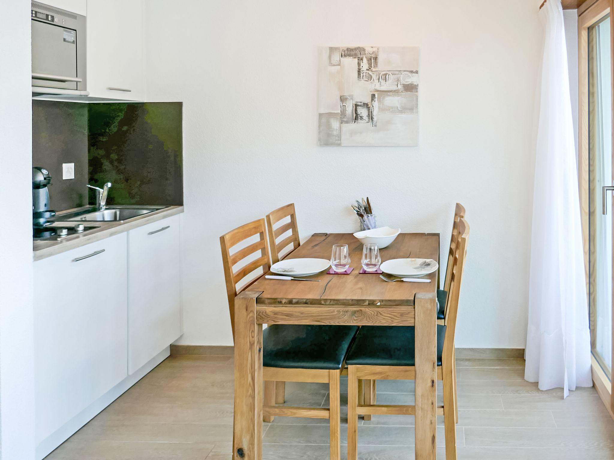 "Grenier 5", 1-Zimmer-Studio 20 m2 im 2. Stock. Eingang. Wohn-/Esszimmer mit 1 franz. Wandschrankbett (150 cm, Länge 200 cm). Ausgang zum Balkon, Richtung Norden. Kochnische (2 Glaskeramikplatten, Mikrowelle, elektrische Kaffeemaschine, Kapseln für die Kaffeemaschine (Dolce Gusto) extra, Racletteofen). Dusche/WC. Balkon, Nordlage. Balkonmöbel. Schöne Sicht auf die Berge und das Tal. Zur Verfügung: Haartrockner. Internet (Wireless LAN, gratis). Parkplatz Nr. 1. Bitte beachten: Nichtraucher-Unterkunft. 1 kleines Haustier/Hund erlaubt.