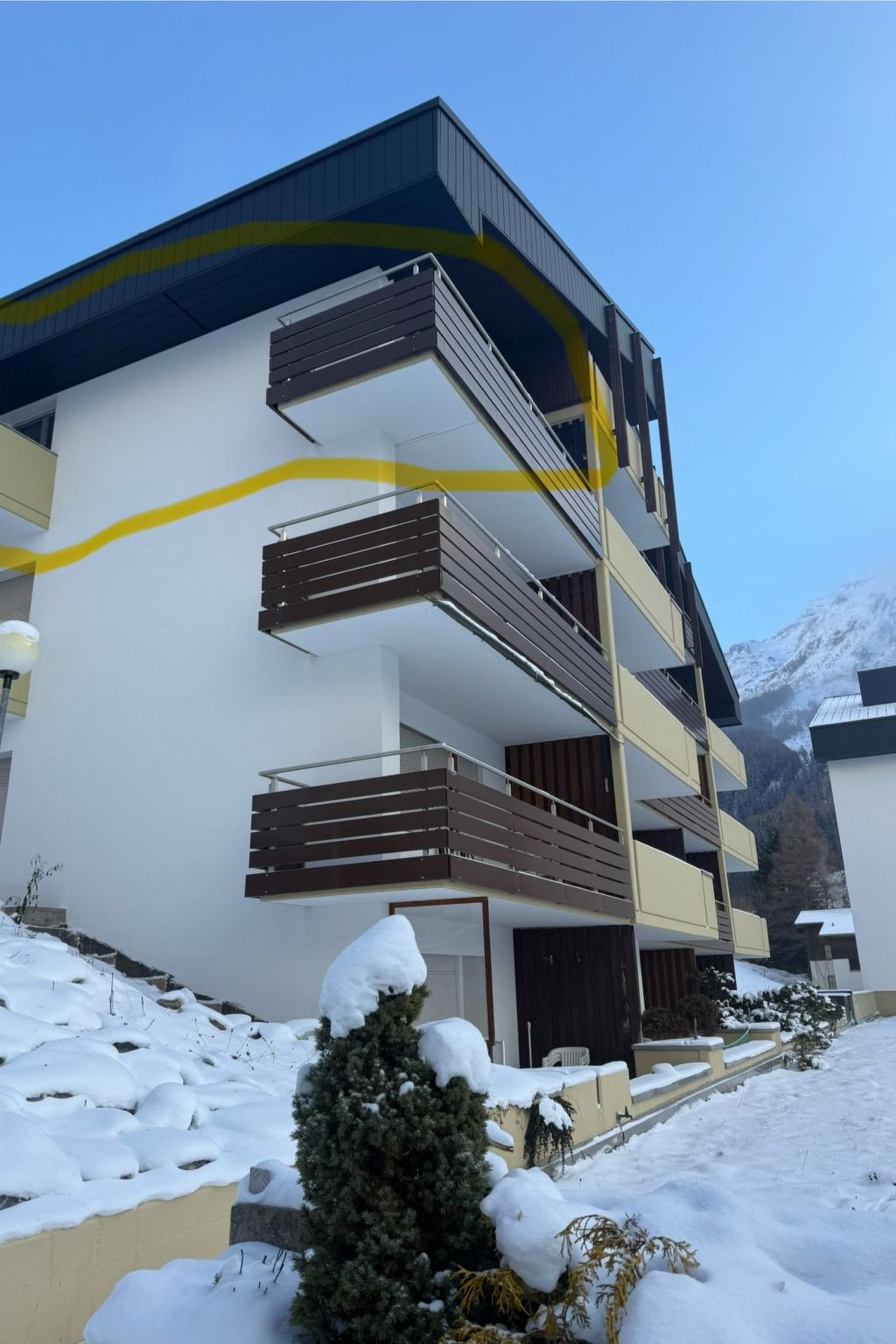 Im Außenbereich erwarten Sie gleich zwei Balkone, die zum Verweilen einladen: Ein großer Südbalkon 9,5qm mit herrlicher Sicht über Leukerbad mit einem Hängesessel (der auch im Schlafzimmer 1 aufgehängt werden kann an der Decke), einem Hängemattengestell sowie Stühlen und zwei kleinen neuen Tischen(welche weggeklappt werden können bei Nichtbedarf) für gemütliche Stunden im Freien oder der kleine Westbalkon 2qm vom Schlafzimmer 2, um in Ruhe ein Buch zu lesen oder einfach die Seele baumeln zu lassen. Zudem ist direkt oberhalb der Wohnung der Estrich. Die Wohnung liegt ruhig, abseits der Ringstraße(Hauptstraße) oberhalb Leukerbad (oberste Häuser mit top Aussicht), zur Gemmibahn sind es wenige Meter. Neu isolierte Gebäudefassade und Dach. Unsere Garagenbox steht Ihnen alleine zur Verfügung.