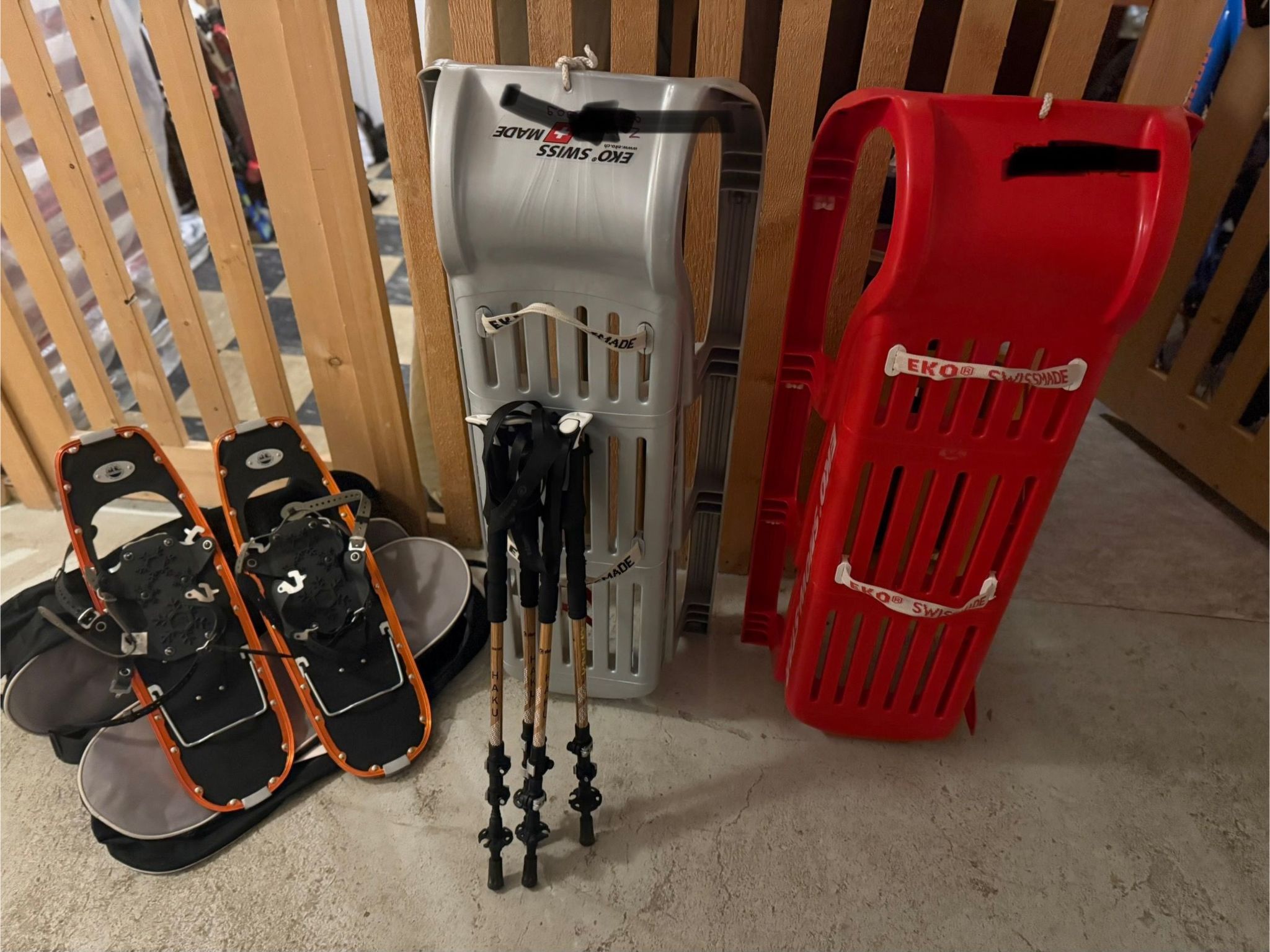 Für Ihre Wanderungen dürfen Sie die zwei paar Walkingstöcke, fürs Schlitteln unsere zwei hochwertigen Ekoschlitten und zum Schneeschuhlaufen zwei paar Schneeschuhe ausleihen, die im eigenen Keller bereit stehen. Den Keller können Sie auch zum sicheren Aufbewahren Ihrer Skis etc. benutzen (oder den gemeinschaftlichen Skiraum). Die Skischuhe trocknen am besten in der Wohnung unter der Heizung.