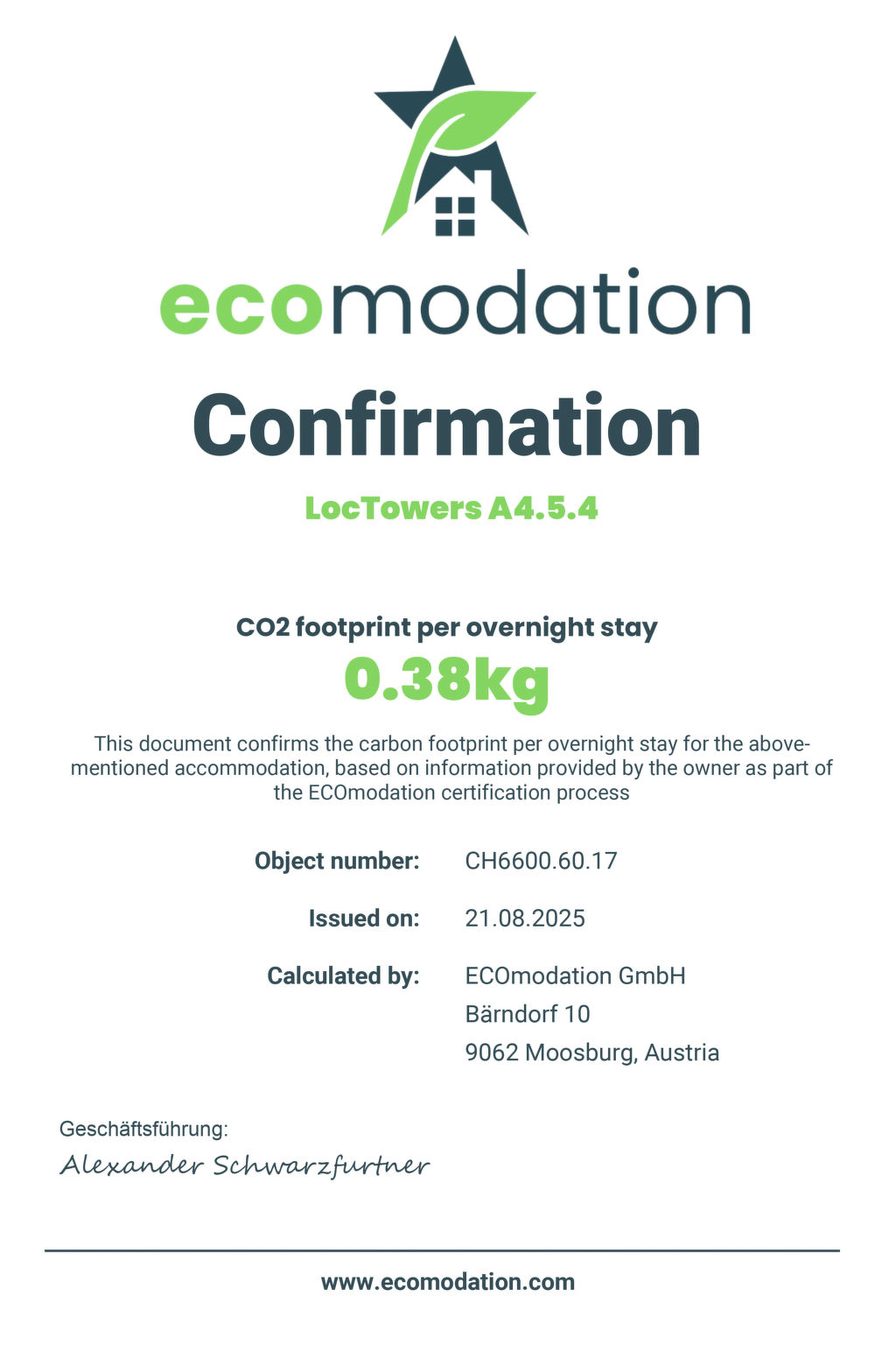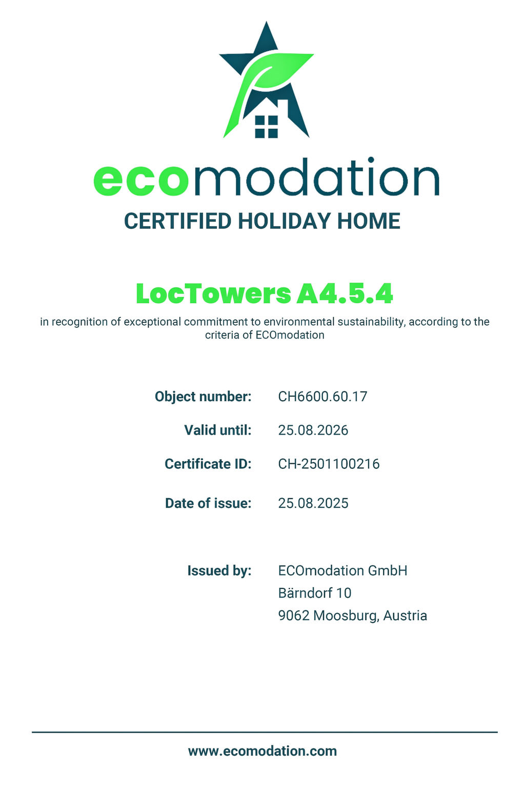 "LocTowers A4.5.4", 2-Zimmer-Wohnung 59 m2 im 5. Stock. Geräumig und hell, sehr komfortabel und modern eingerichtet: grosses Wohn-/Esszimmer mit 1 Doppeldiwanbett (150 cm, Länge 200 cm), Esstisch, Kabel-TV und Digital-TV. Ausgang zum Balkon. 1 Zimmer mit 1 Doppelbett (2 x 80 cm, Länge 200 cm). Offene Küche (Backofen, Geschirrspüler, 4 Glaskeramikplatten, Toaster, Wasserkocher, Tiefkühler, elektrische Kaffeemaschine, Kapseln für die Kaffeemaschine (Delizio) extra, Racletteofen, Fondue Set (Käse)) mit Esstisch. Dusche/WC. Fussbodenheizung. Balkon 8 m2, Ostlage und Nordlage. Balkonmöbel. Sicht auf die Ortschaft. Zur Verfügung: Waschmaschine, Wäschetrockner, Bügeleisen, Kinderhochstuhl, Babybett (extra), Haartrockner. Internet (Wireless LAN, gratis). Bitte beachten: Nichtraucher-Unterkunft. Maximal 1 Haustier/Hund erlaubt. NL-00007183