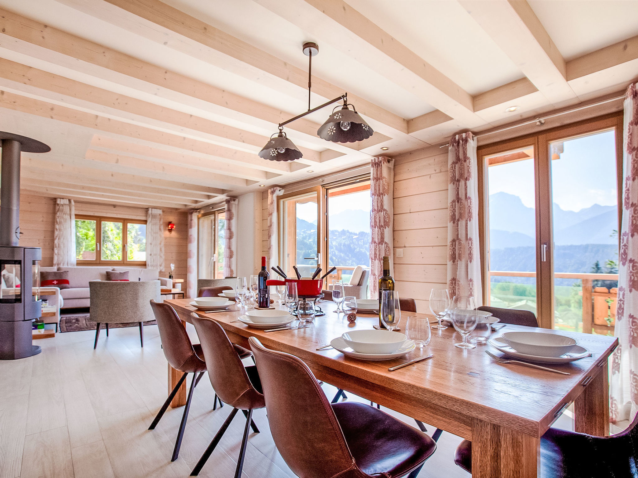 "Chalet Domino", 6-Zimmer-Chalet 230 m2 auf 3 Stockwerken, Südlage. Renoviert, komfortabel und modern eingerichtet: grosses Wohn-/Esszimmer mit Schwedenofen. Ausgang zur Terrasse, Richtung Süden. 1 Zimmer mit 1 franz. Bett (1 x 160 cm). Offene Küche (Backofen, Geschirrspüler, 4 Induktionskochplatten, Toaster, Wasserkocher, elektrische Kaffeemaschine, Kapseln für die Kaffeemaschine (Nespresso) extra, Dampfgarer, Racletteofen, Fondue Set (Käse)). Bad/WC. Unteres Geschoss: 1 Zimmer mit 2 Betten (90 cm). Ausgang zur Veranda. 1 Zimmer mit 2 Betten (90 cm), Dusche/WC. Ausgang zur Veranda. Mit Veranda mit TV (Flachbildschirm). Ausgang zum Garten, Richtung Süden. Bad/WC. Obergeschoss: 1 Zimmer, niedrige Türrahmen, Höhe 160 cm mit 1 franz. Bett (1 x 160 cm), Dusche/Bidet/WC. Ausgang zum Balkon, Richtung Süden. Grosser Balkon, Südlage, kleiner Balkon, Südlage, Garten. Balkonmöbel, Gartengrill. Sehr schöne Panoramasicht auf die Berge. Zur Verfügung: Waschmaschine, Wäschetrockner, Haartrockner. Internet (WLAN, gratis). Parkplatz (2 Autos), Garage (1 Auto). Bitte beachten: Nichtraucher-Haus. 283.74.3880-1