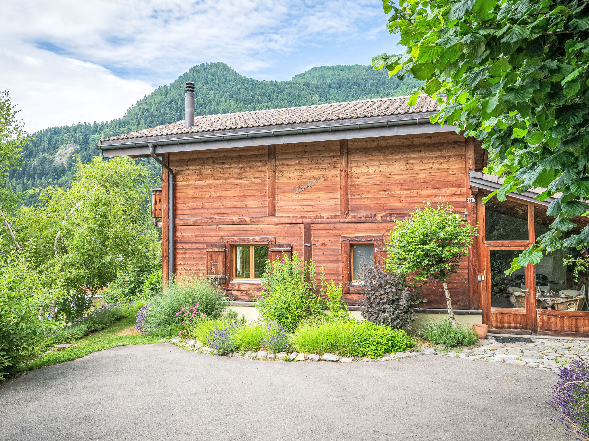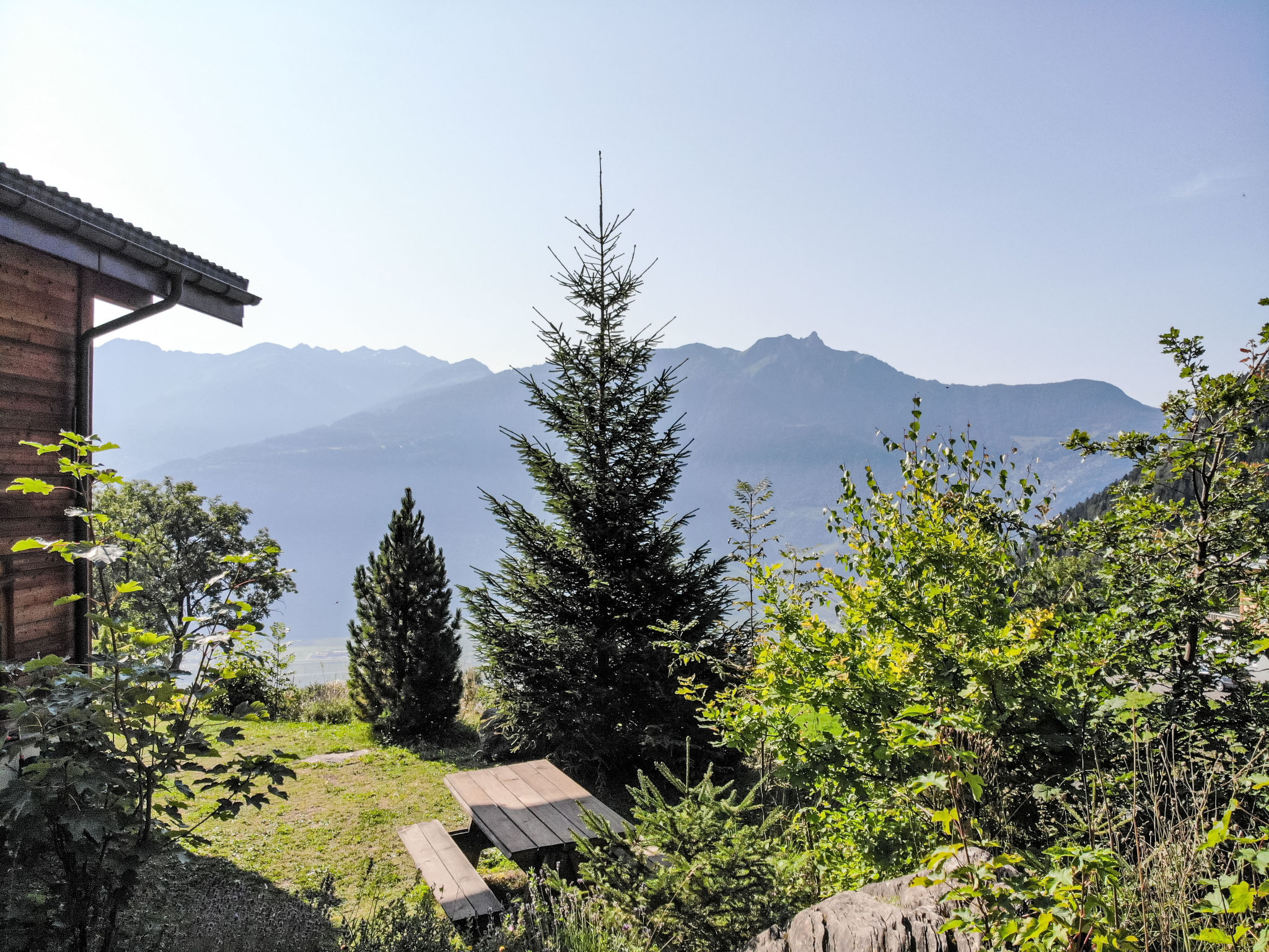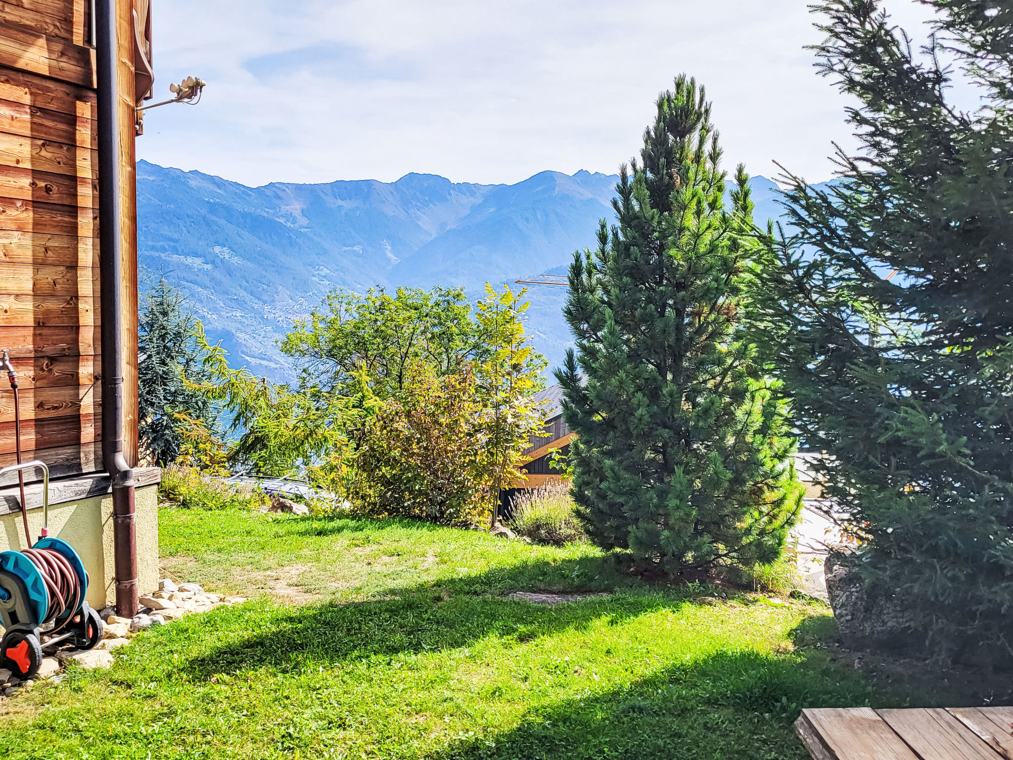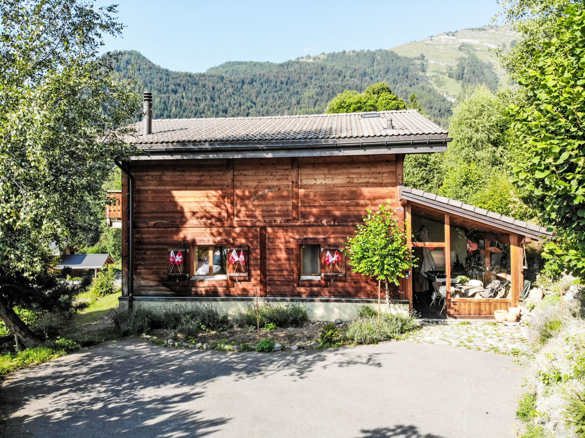 "Dendron", 4-Zimmer-Chalet 120 m2 auf 2 Stockwerken, Südlage. Hell, teilweise abgeschrägt, komfortabel und gemütlich eingerichtet: Eingang mit Wintergarten Richtung Westen. Wohn-/Esszimmer mit offenem Kamin, Kabel-TV, Radio und DVD. Ausgang zum Garten. Offene Küche (Backofen, Geschirrspüler, 4 Induktionskochplatten, Toaster, Wasserkocher, Mikrowelle, Tiefkühler, elektrische Kaffeemaschine, Kapseln für die Kaffeemaschine (Nespresso) extra, Dampfgarer, Racletteofen, Fondue Set (Käse)). Dusche/WC. Obergeschoss: 1 abgeschrägtes Zimmer mit 1 franz. Bett (2 x 80 cm, Länge 200 cm). 1 abgeschrägtes Zimmer mit 1 franz. Bett (2 x 90 cm, Länge 200 cm). Ausgang zum Balkon. 1 abgeschrägtes Zimmer mit 1 franz. Bett (2 x 90 cm, Länge 200 cm). Ausgang zum Balkon. Bad/WC, Doppelwaschbecken. Balkon, Südlage, Garten 50 m2, Südlage und Ostlage. Terrassenmöbel, Gartengrill (mobil), Liegestühle (2). Sehr schöne Sicht auf die Berge, das Tal und die Landschaft. Zur Verfügung: Waschmaschine, Wäschetrockner, Bügeleisen, Kinderhochstuhl, Babybett bis 2 Jahre, Haartrockner, Wickelkommode. Internet (Wireless LAN, gratis). Parkplatz (3 Autos). Bitte beachten: geeignet für Familien. Nichtraucher-Haus. Maximal 1 Haustier/Hund erlaubt.
