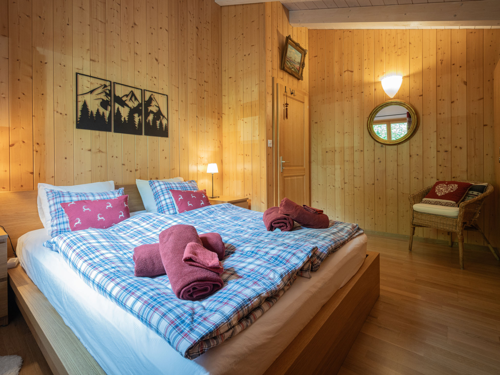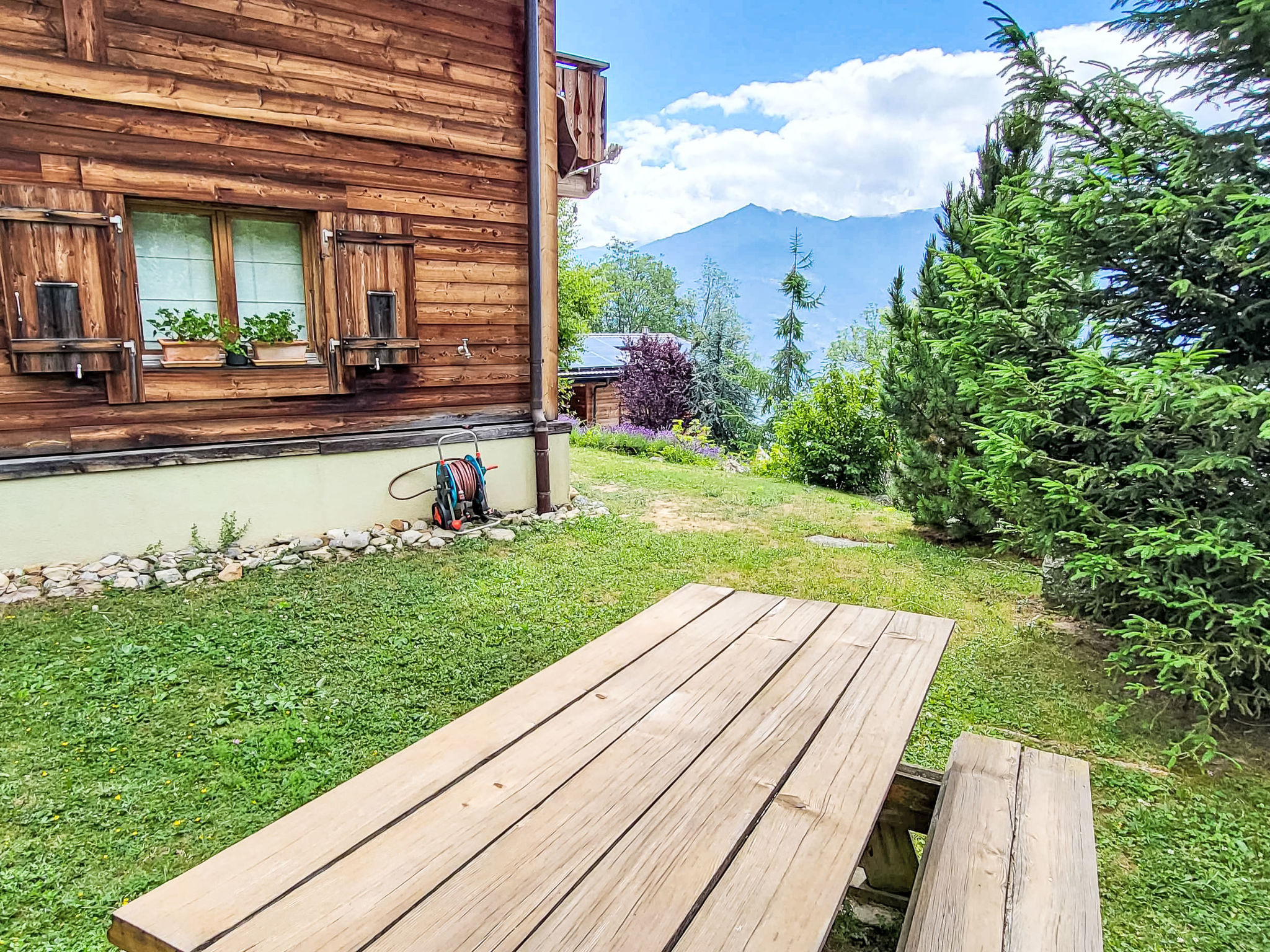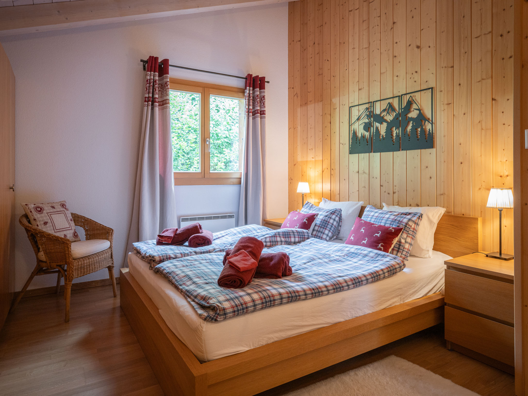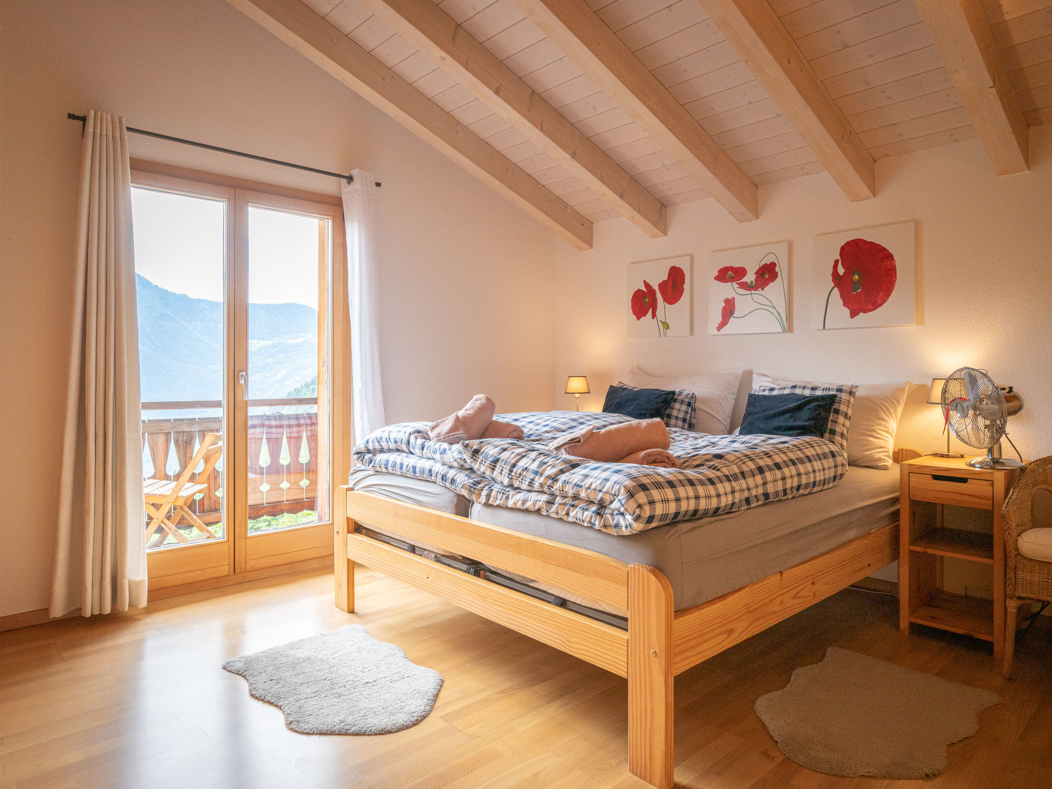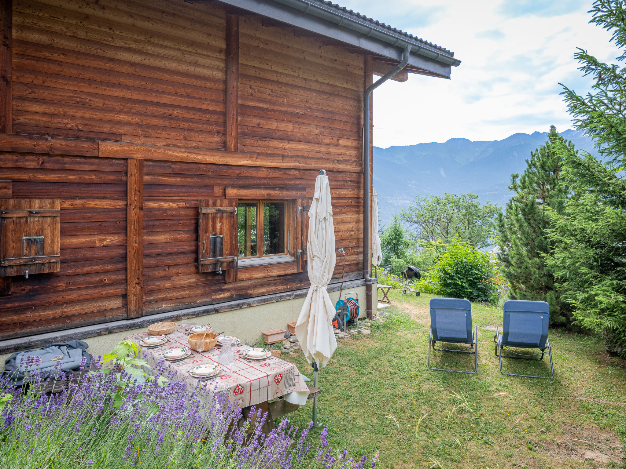 "Dendron", 4-Zimmer-Chalet 120 m2 auf 2 Stockwerken, Südlage. Hell, teilweise abgeschrägt, komfortabel und gemütlich eingerichtet: Eingang mit Wintergarten Richtung Westen. Wohn-/Esszimmer mit offenem Kamin, Kabel-TV, Radio und DVD. Ausgang zum Garten. Offene Küche (Backofen, Geschirrspüler, 4 Induktionskochplatten, Toaster, Wasserkocher, Mikrowelle, Tiefkühler, elektrische Kaffeemaschine, Kapseln für die Kaffeemaschine (Nespresso) extra, Dampfgarer, Racletteofen, Fondue Set (Käse)). Dusche/WC. Obergeschoss: 1 abgeschrägtes Zimmer mit 1 franz. Bett (2 x 80 cm, Länge 200 cm). 1 abgeschrägtes Zimmer mit 1 franz. Bett (2 x 90 cm, Länge 200 cm). Ausgang zum Balkon. 1 abgeschrägtes Zimmer mit 1 franz. Bett (2 x 90 cm, Länge 200 cm). Ausgang zum Balkon. Bad/WC, Doppelwaschbecken. Balkon, Südlage, Garten 50 m2, Südlage und Ostlage. Terrassenmöbel, Gartengrill (mobil), Liegestühle (2). Sehr schöne Sicht auf die Berge, das Tal und die Landschaft. Zur Verfügung: Waschmaschine, Wäschetrockner, Bügeleisen, Kinderhochstuhl, Babybett bis 2 Jahre, Haartrockner, Wickelkommode. Internet (Wireless LAN, gratis). Parkplatz (3 Autos). Bitte beachten: geeignet für Familien. Nichtraucher-Haus. Maximal 1 Haustier/Hund erlaubt.