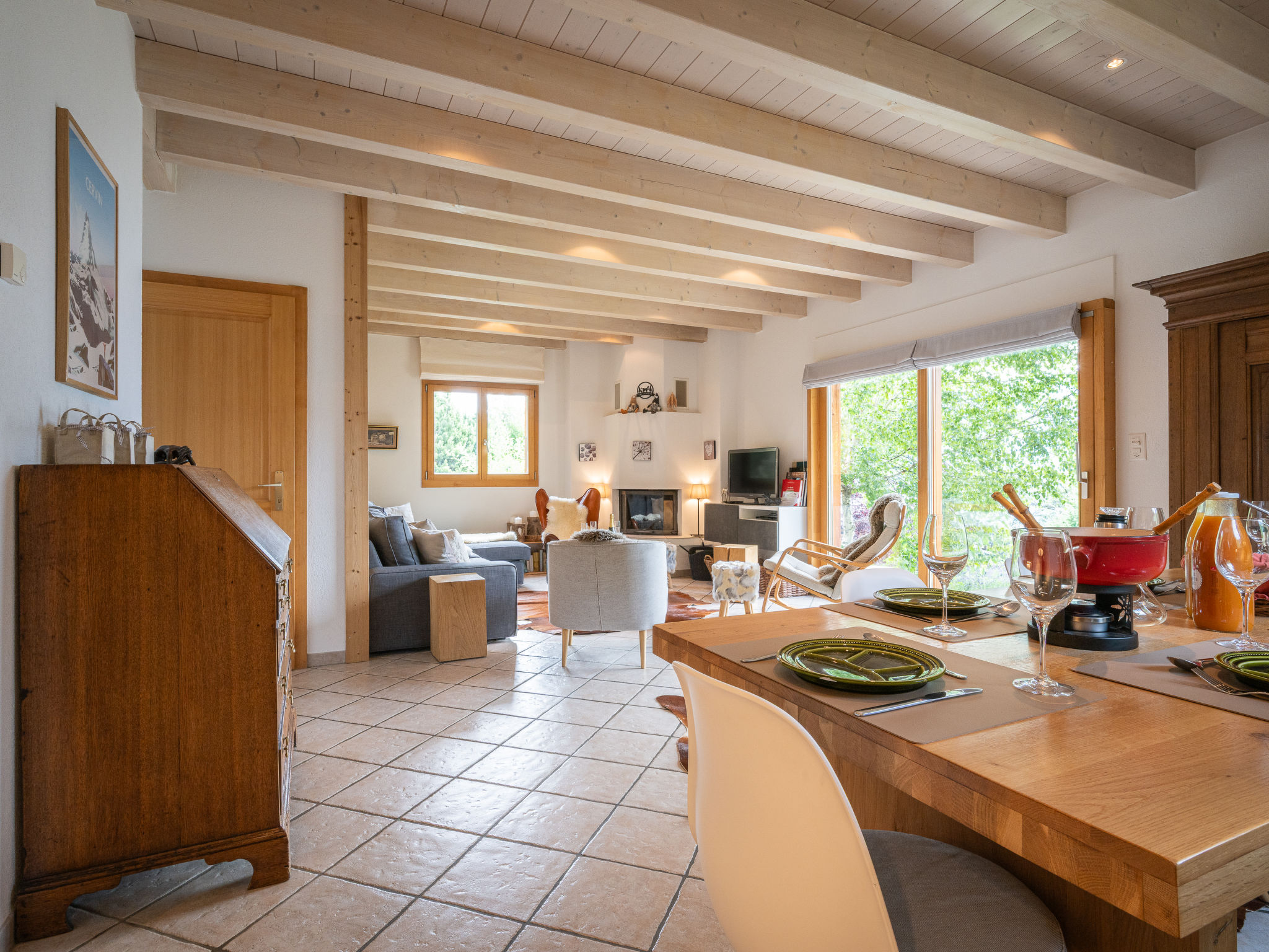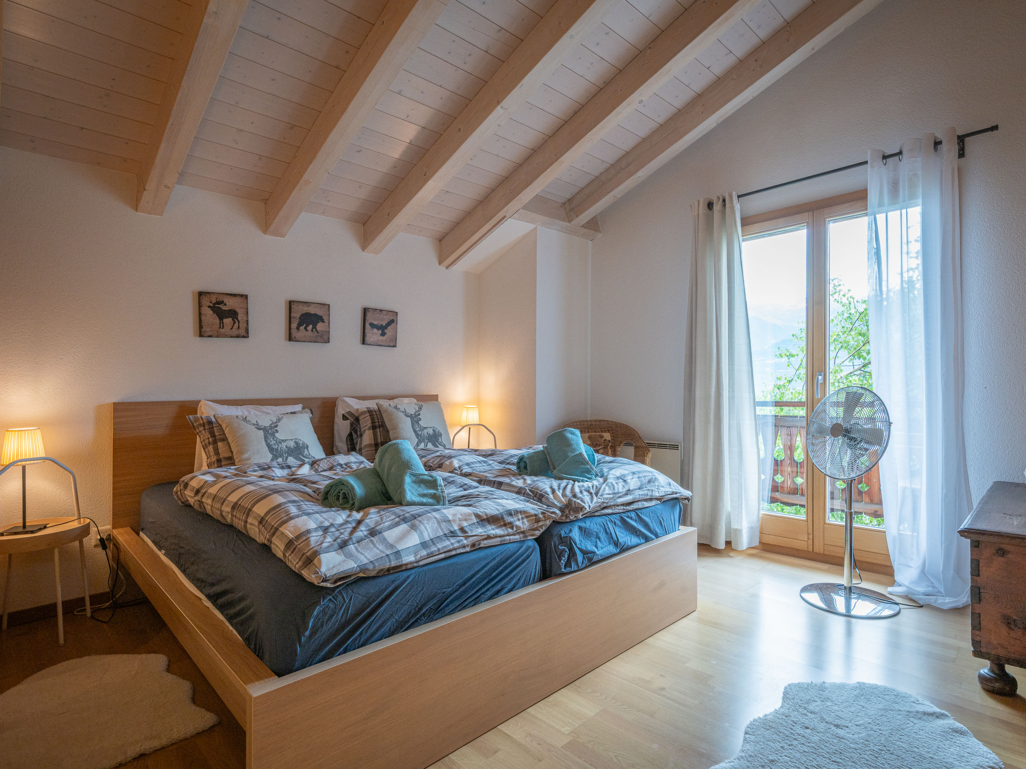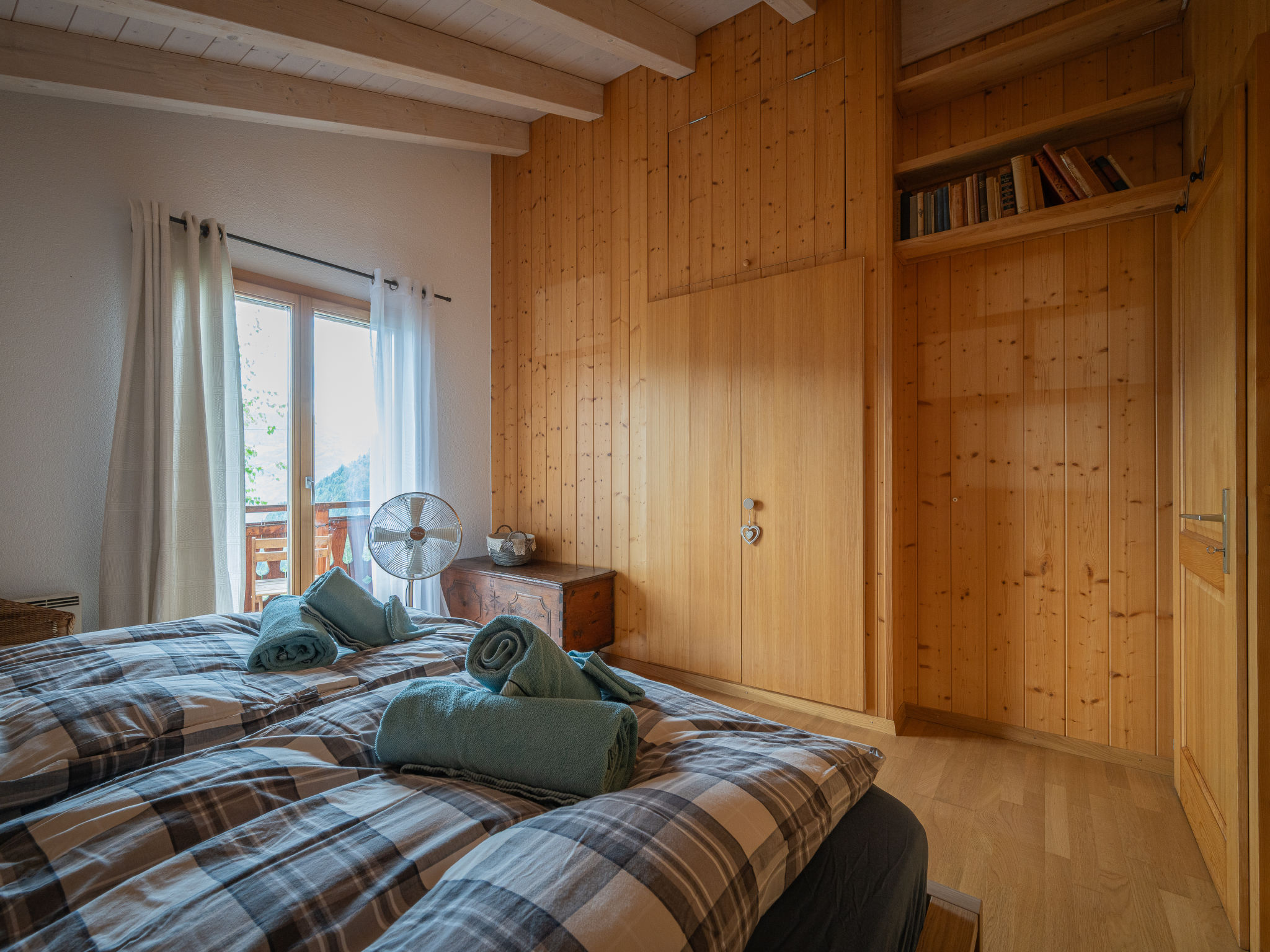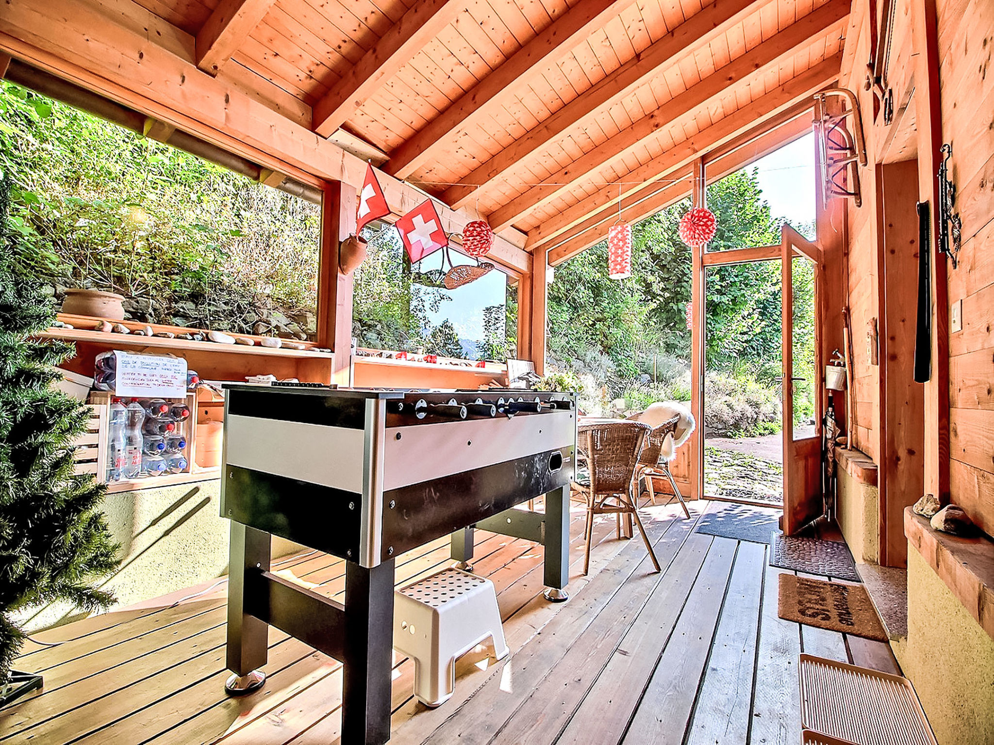"Dendron", 4-Zimmer-Chalet 120 m2 auf 2 Stockwerken, Südlage. Hell, teilweise abgeschrägt, komfortabel und gemütlich eingerichtet: Eingang mit Wintergarten Richtung Westen. Wohn-/Esszimmer mit offenem Kamin, Kabel-TV, Radio und DVD. Ausgang zum Garten. Offene Küche (Backofen, Geschirrspüler, 4 Induktionskochplatten, Toaster, Wasserkocher, Mikrowelle, Tiefkühler, elektrische Kaffeemaschine, Kapseln für die Kaffeemaschine (Nespresso) extra, Dampfgarer, Racletteofen, Fondue Set (Käse)). Dusche/WC. Obergeschoss: 1 abgeschrägtes Zimmer mit 1 franz. Bett (2 x 80 cm, Länge 200 cm). 1 abgeschrägtes Zimmer mit 1 franz. Bett (2 x 90 cm, Länge 200 cm). Ausgang zum Balkon. 1 abgeschrägtes Zimmer mit 1 franz. Bett (2 x 90 cm, Länge 200 cm). Ausgang zum Balkon. Bad/WC, Doppelwaschbecken. Balkon, Südlage, Garten 50 m2, Südlage und Ostlage. Terrassenmöbel, Gartengrill (mobil), Liegestühle (2). Sehr schöne Sicht auf die Berge, das Tal und die Landschaft. Zur Verfügung: Waschmaschine, Wäschetrockner, Bügeleisen, Kinderhochstuhl, Babybett bis 2 Jahre, Haartrockner, Wickelkommode. Internet (Wireless LAN, gratis). Parkplatz (3 Autos). Bitte beachten: geeignet für Familien. Nichtraucher-Haus. Maximal 1 Haustier/Hund erlaubt.