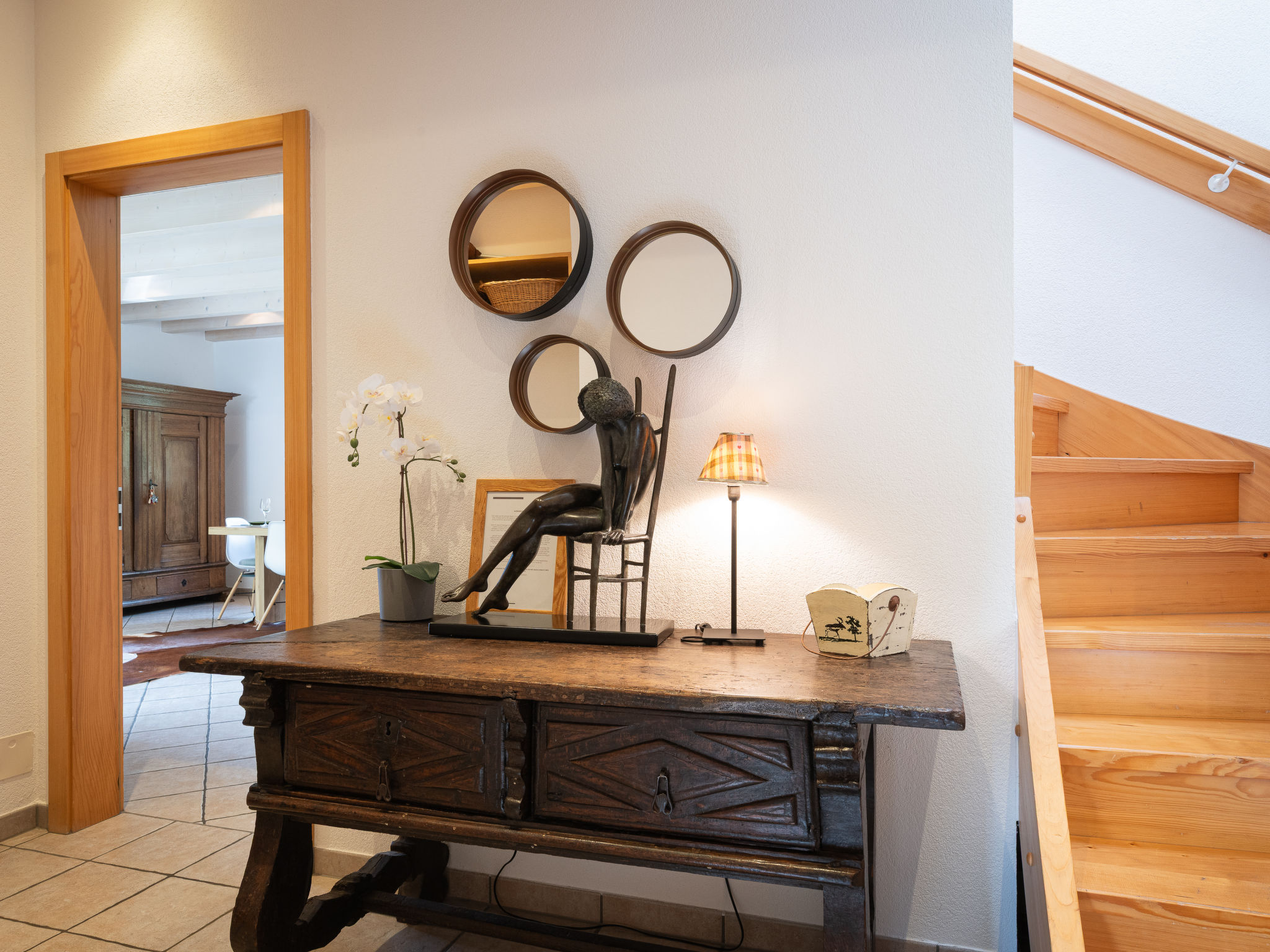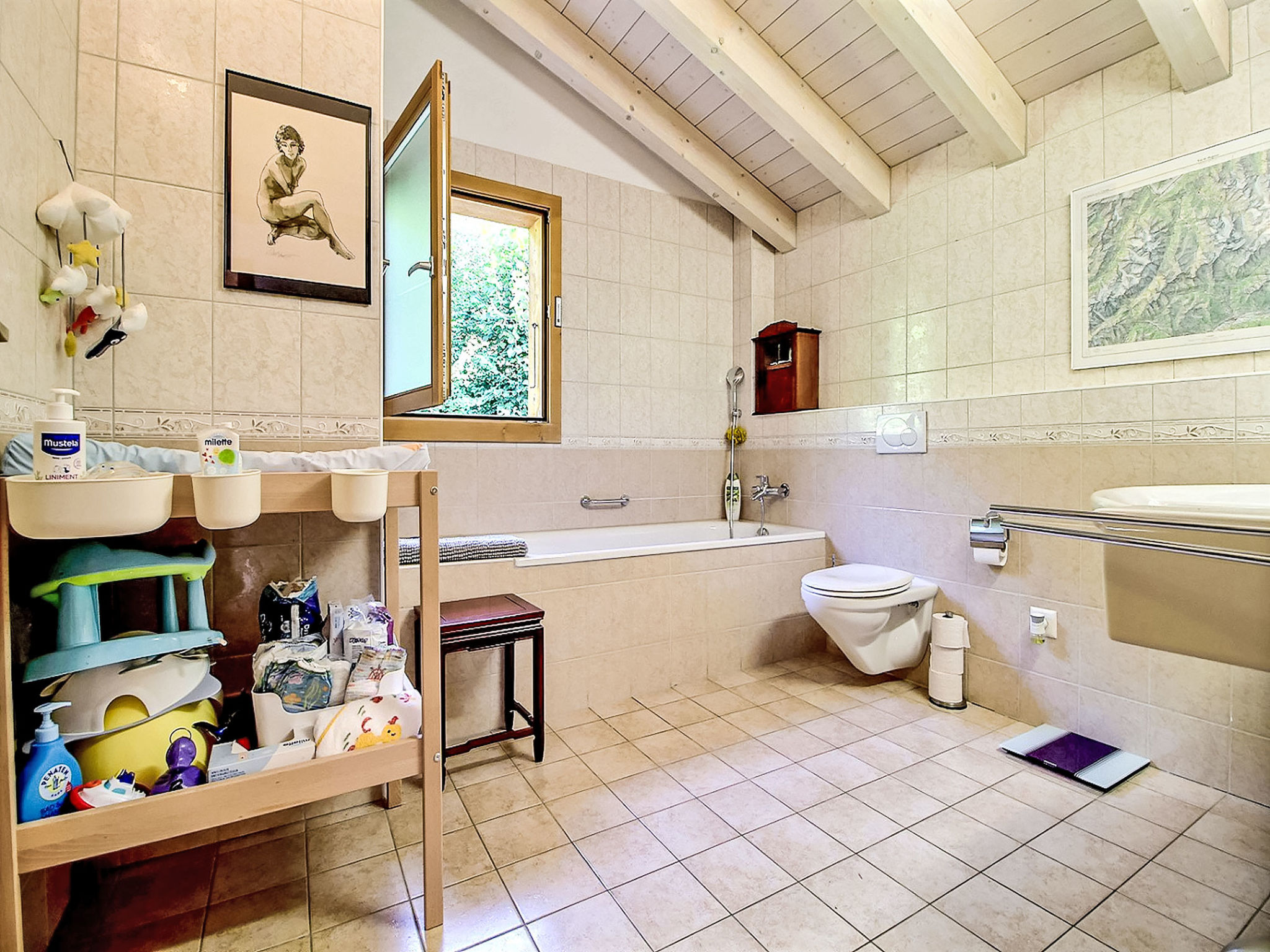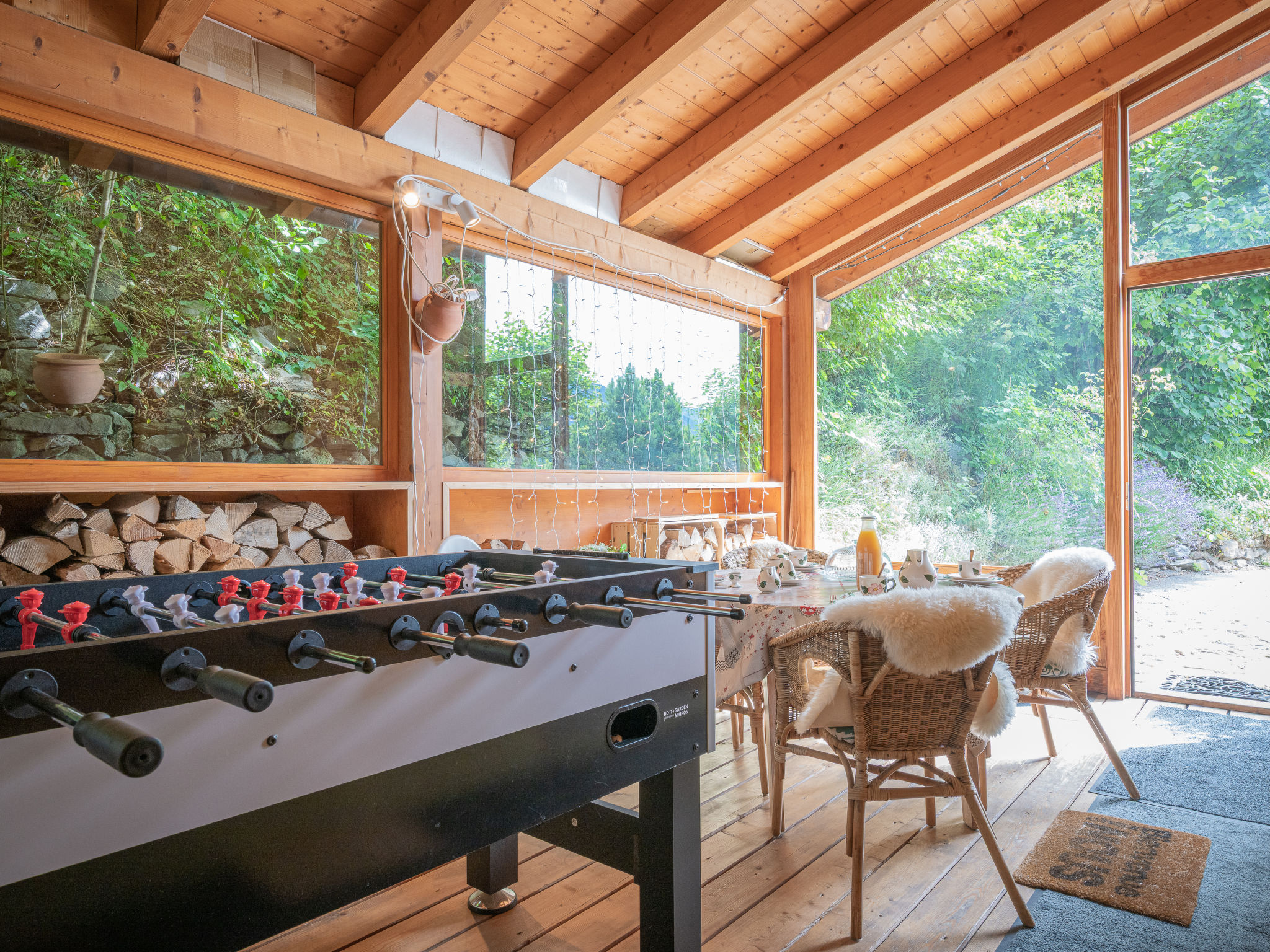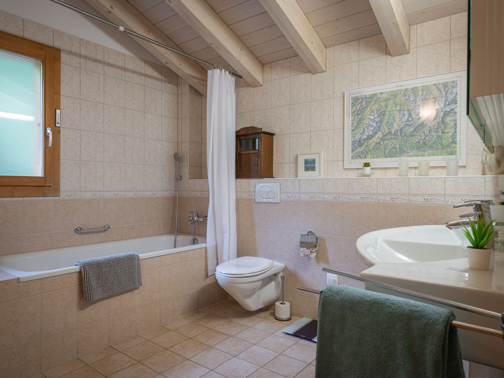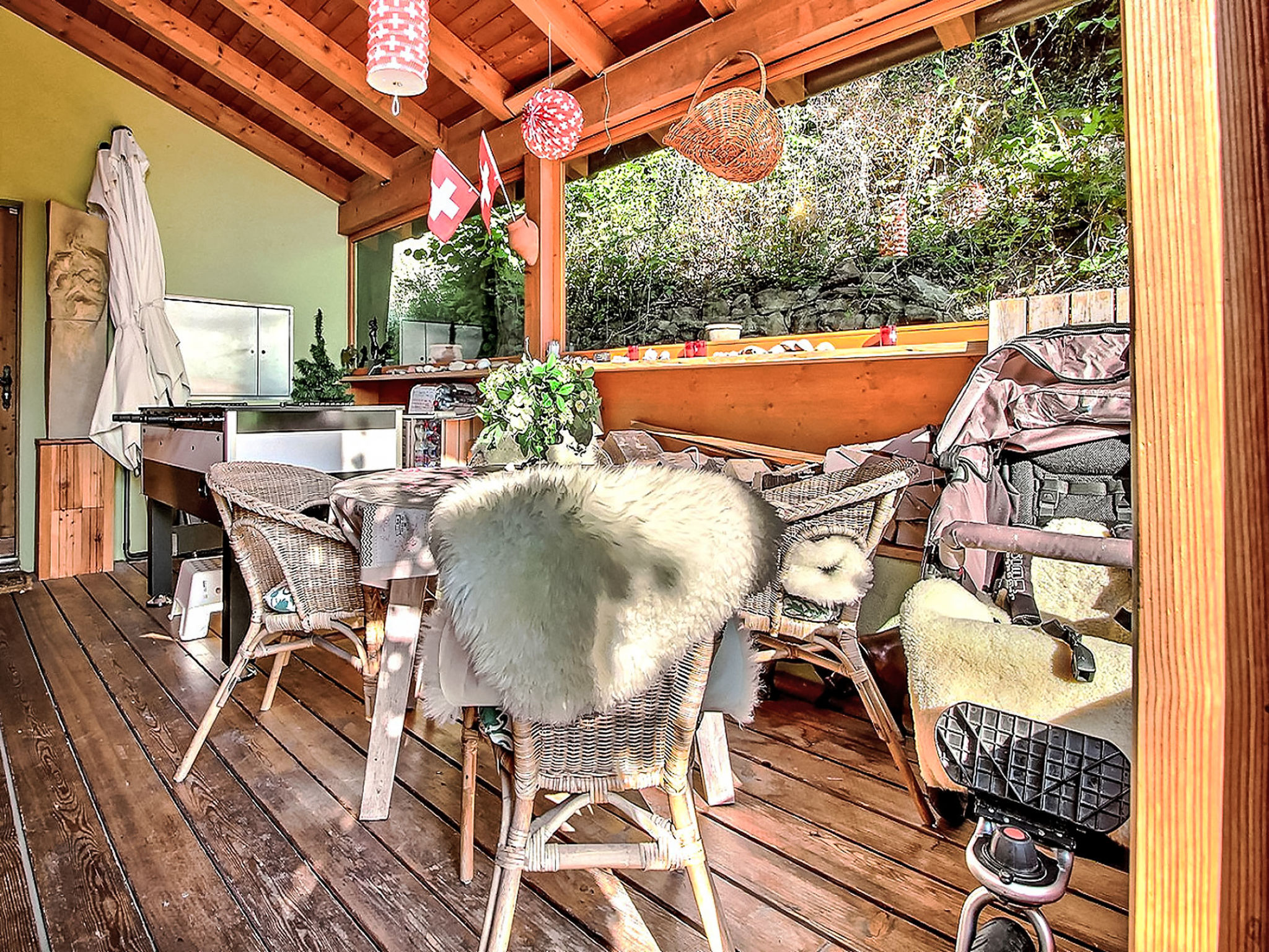 "Dendron", 4-Zimmer-Chalet 120 m2 auf 2 Stockwerken, Südlage. Hell, teilweise abgeschrägt, komfortabel und gemütlich eingerichtet: Eingang mit Wintergarten Richtung Westen. Wohn-/Esszimmer mit offenem Kamin, Kabel-TV, Radio und DVD. Ausgang zum Garten. Offene Küche (Backofen, Geschirrspüler, 4 Induktionskochplatten, Toaster, Wasserkocher, Mikrowelle, Tiefkühler, elektrische Kaffeemaschine, Kapseln für die Kaffeemaschine (Nespresso) extra, Dampfgarer, Racletteofen, Fondue Set (Käse)). Dusche/WC. Obergeschoss: 1 abgeschrägtes Zimmer mit 1 franz. Bett (2 x 80 cm, Länge 200 cm). 1 abgeschrägtes Zimmer mit 1 franz. Bett (2 x 90 cm, Länge 200 cm). Ausgang zum Balkon. 1 abgeschrägtes Zimmer mit 1 franz. Bett (2 x 90 cm, Länge 200 cm). Ausgang zum Balkon. Bad/WC, Doppelwaschbecken. Balkon, Südlage, Garten 50 m2, Südlage und Ostlage. Terrassenmöbel, Gartengrill (mobil), Liegestühle (2). Sehr schöne Sicht auf die Berge, das Tal und die Landschaft. Zur Verfügung: Waschmaschine, Wäschetrockner, Bügeleisen, Kinderhochstuhl, Babybett bis 2 Jahre, Haartrockner, Wickelkommode. Internet (Wireless LAN, gratis). Parkplatz (3 Autos). Bitte beachten: geeignet für Familien. Nichtraucher-Haus. Maximal 1 Haustier/Hund erlaubt.