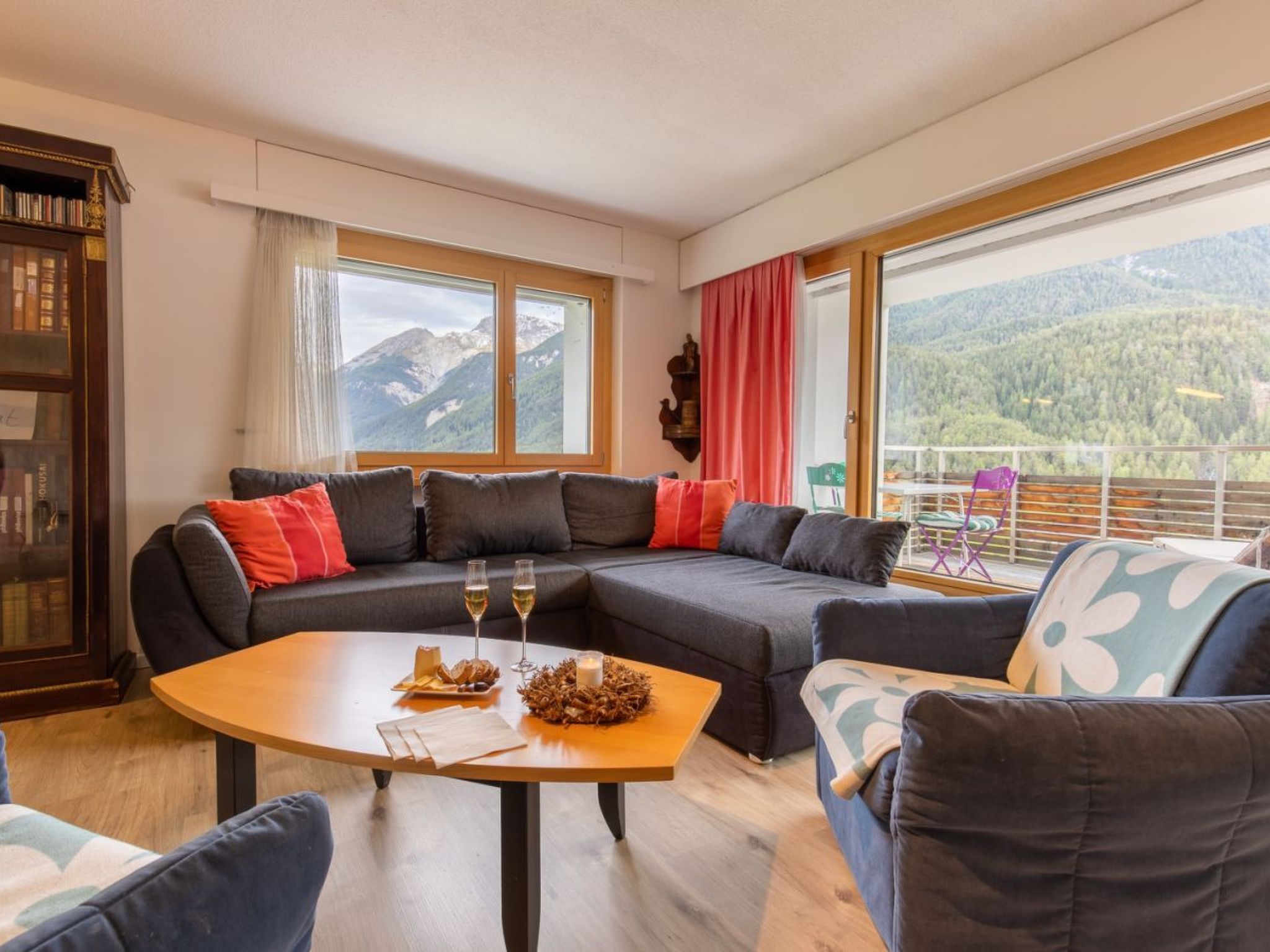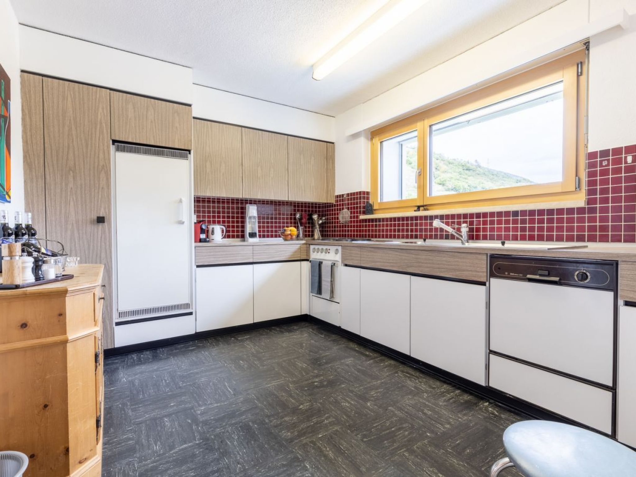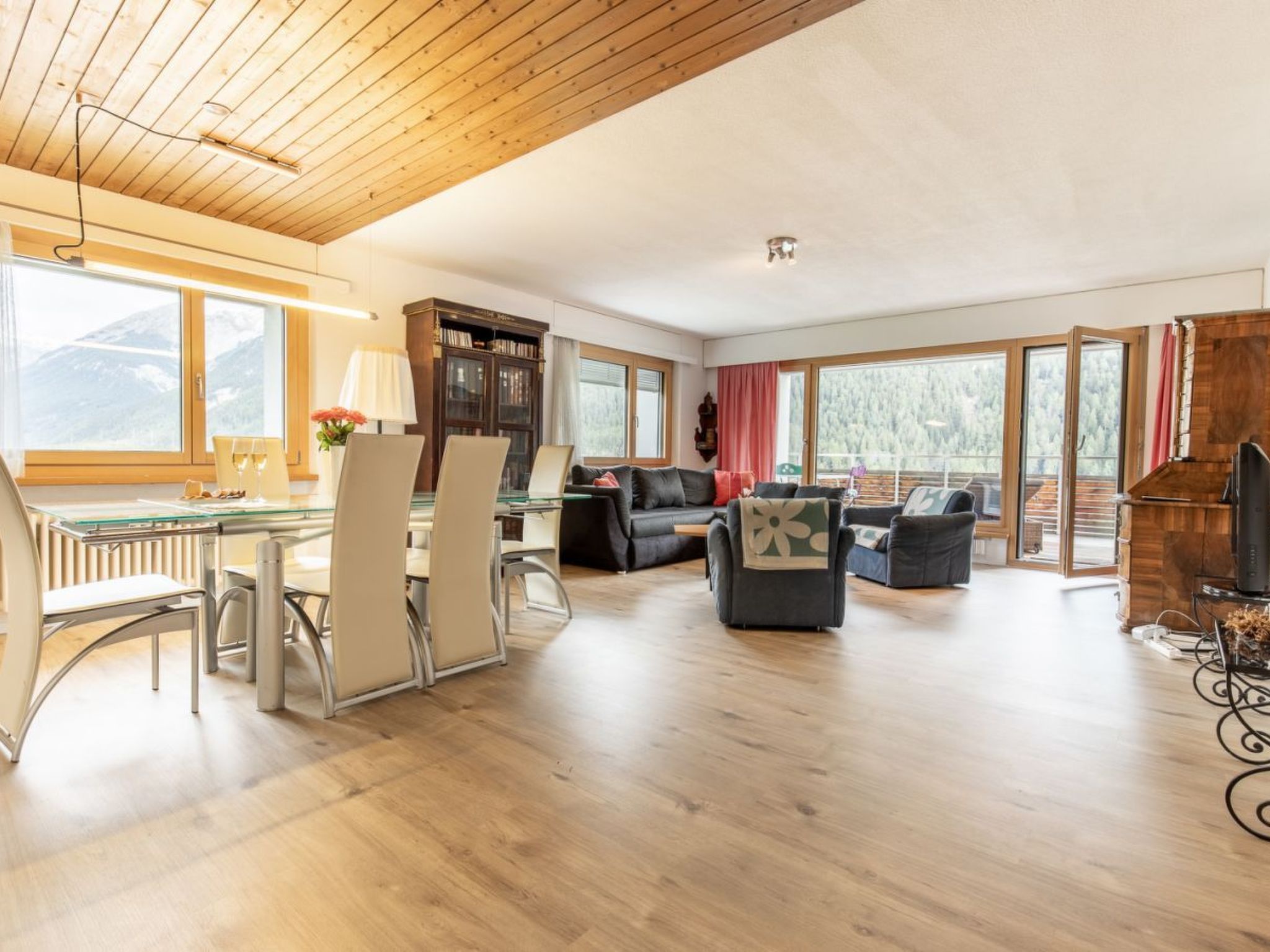 In der hellen und grosszügigen Wohnung (94m2) kann man die Ferien rundum geniessen. Vom geräumigen Wohnzimmer mit grossem Esstisch und Fenstern Richtung Osten und Süden hat man eine tolle Aussicht auf den Piz Lischana und das Tal. Die ältere aber zweckmässige Küche ist mit neuem Geschirrspüler, älterem Backofen, Kochherd und grossem Kühlschrank mit Gefrierfach ausgestattet. Die ganze Wohnung verfügt über einen neuen Laminatboden.