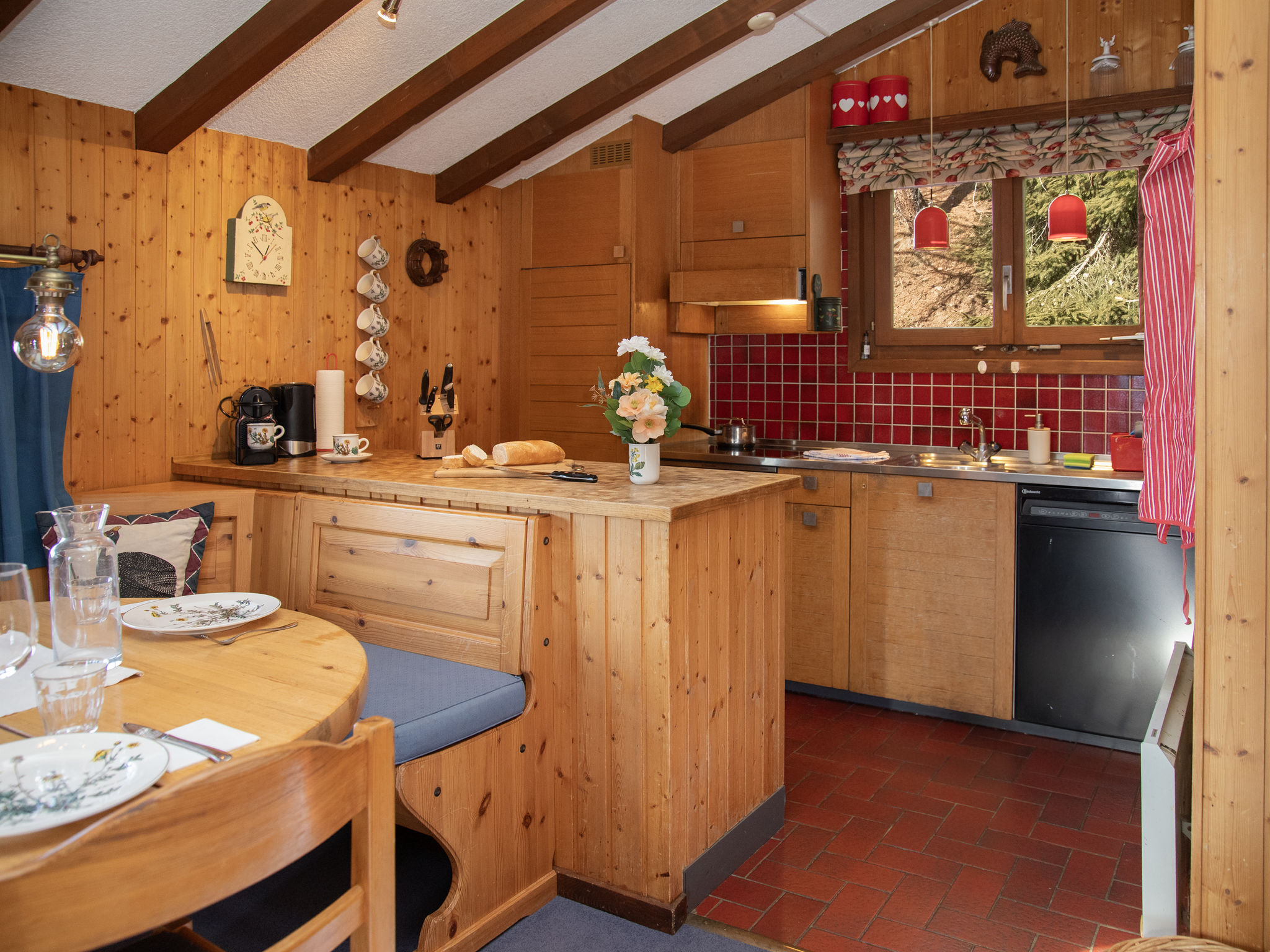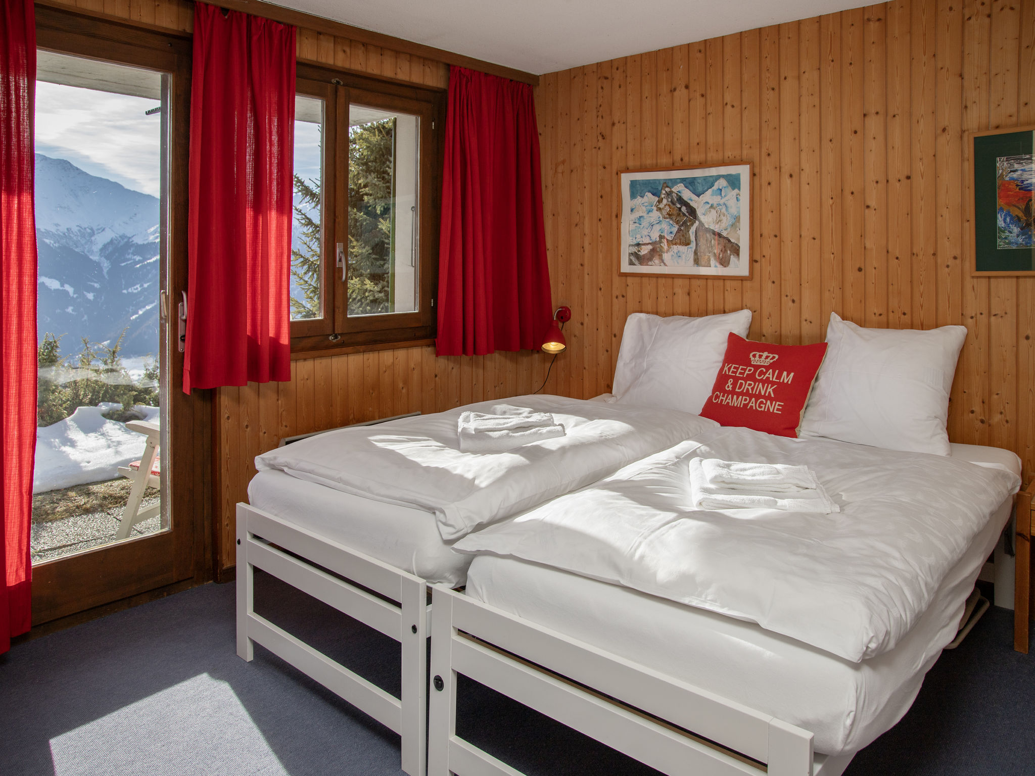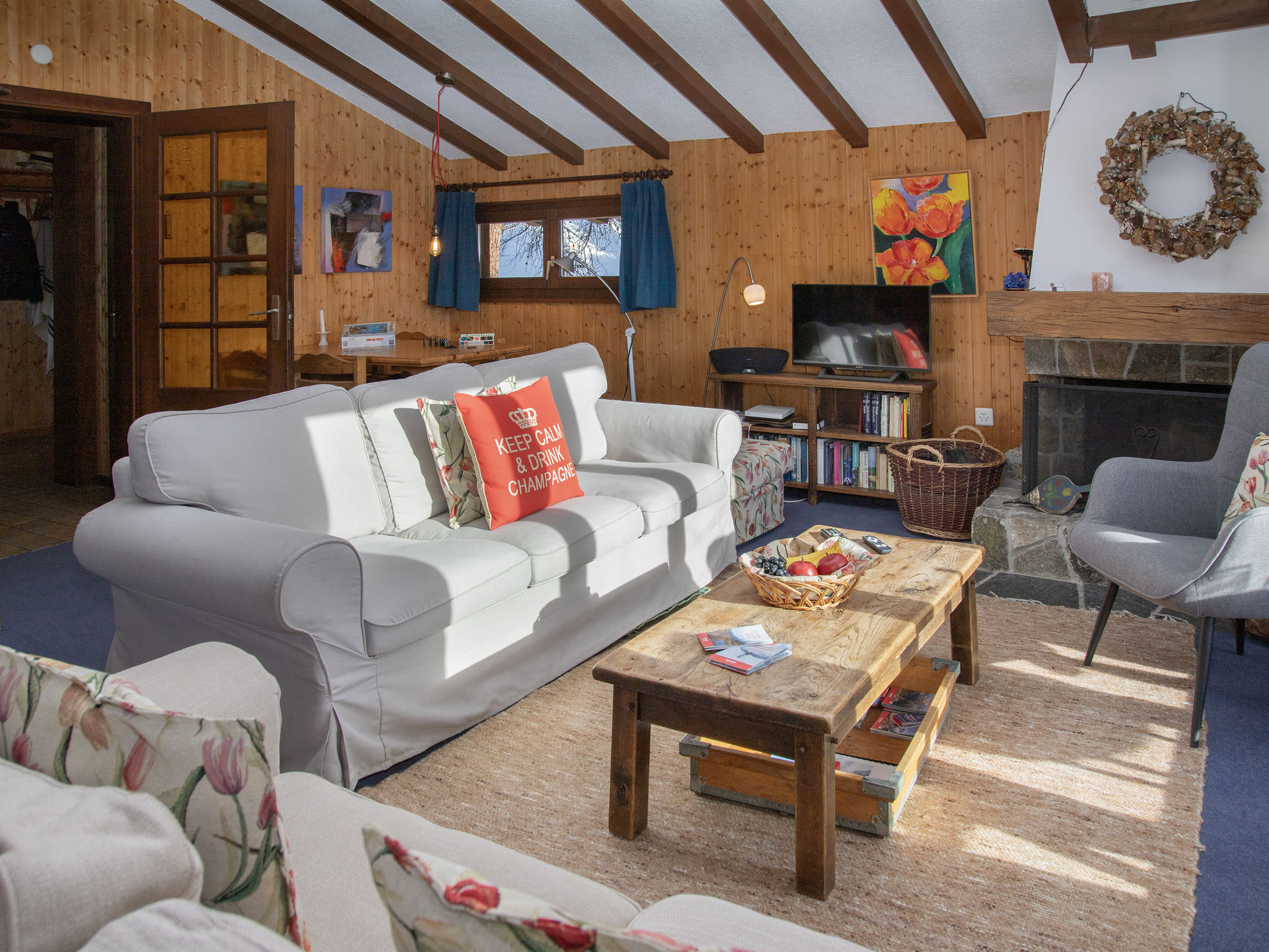 "5 Ecorces", 5-Zimmer-Chalet auf 3 Stockwerken, Südlage. Komfortabel und gemütlich eingerichtet: Wohn-/Esszimmer mit offenem Kamin und Kabel-TV. Ausgang zum Balkon. Offene Küche (4 Kochplatten, Backofen, Geschirrspüler, Wasserkocher, elektrische Kaffeemaschine, Kapseln für die Kaffeemaschine (Nespresso) extra, Fondue Set (Käse)). 2 Duschen/WC, sep. WC. E-Heizung. Unteres Geschoss: 2 Zimmer, jedes Zimmer mit 2 Betten (90 cm, Länge 200 cm), Waschbecken. Ausgang zur Terrasse. 1 Zimmer mit 1 Bett (90 cm, Länge 200 cm). 1 Zimmer mit 2 Betten (90 cm, Länge 200 cm). Teppichboden. Balkon, Südlage, Terrasse. Balkonmöbel. Sehr schöne Sicht auf die Berge, die Landschaft und die Ortschaft. Zur Verfügung: Waschmaschine. Internet (WLAN, gratis). Parkplatz (1 Auto) in 50 m. Bitte beachten: Nichtraucher-Unterkunft.