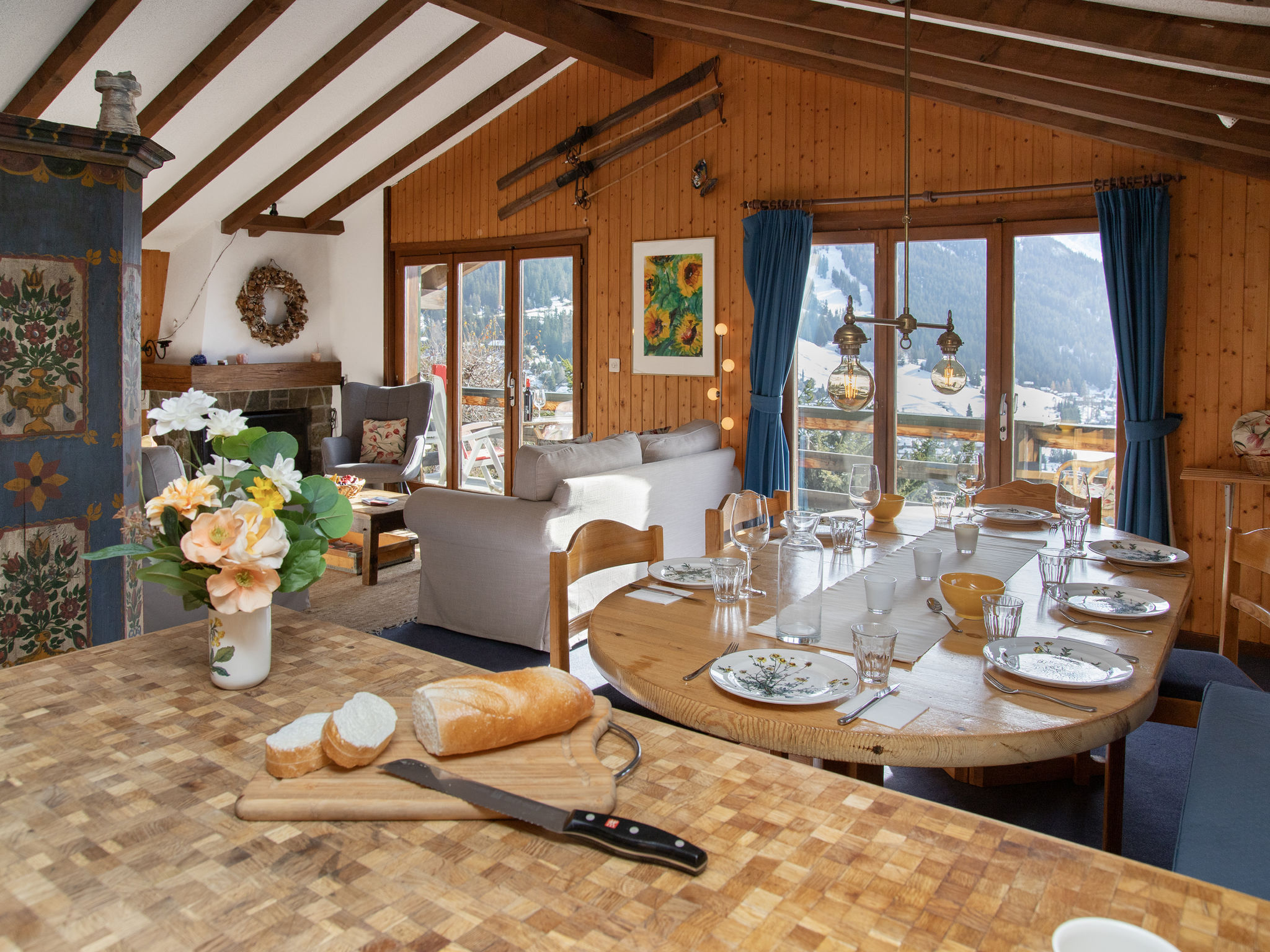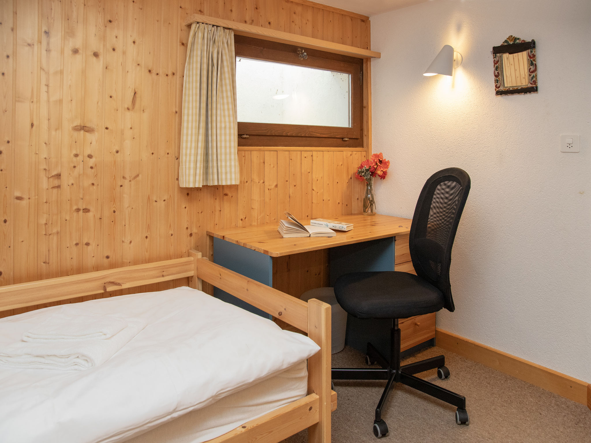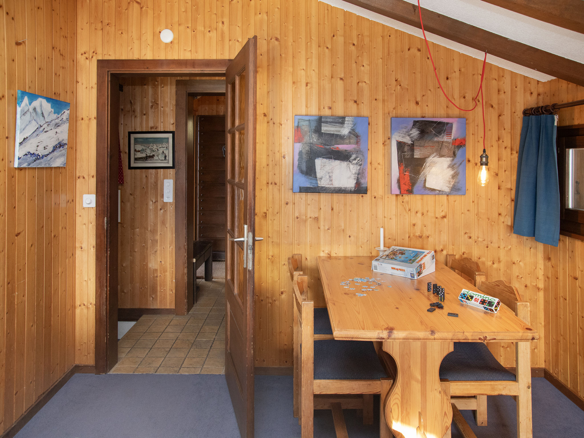 "5 Ecorces", 5-Zimmer-Chalet auf 3 Stockwerken, Südlage. Komfortabel und gemütlich eingerichtet: Wohn-/Esszimmer mit offenem Kamin und Kabel-TV. Ausgang zum Balkon. Offene Küche (4 Kochplatten, Backofen, Geschirrspüler, Wasserkocher, elektrische Kaffeemaschine, Kapseln für die Kaffeemaschine (Nespresso) extra, Fondue Set (Käse)). 2 Duschen/WC, sep. WC. E-Heizung. Unteres Geschoss: 2 Zimmer, jedes Zimmer mit 2 Betten (90 cm, Länge 200 cm), Waschbecken. Ausgang zur Terrasse. 1 Zimmer mit 1 Bett (90 cm, Länge 200 cm). 1 Zimmer mit 2 Betten (90 cm, Länge 200 cm). Teppichboden. Balkon, Südlage, Terrasse. Balkonmöbel. Sehr schöne Sicht auf die Berge, die Landschaft und die Ortschaft. Zur Verfügung: Waschmaschine. Internet (WLAN, gratis). Parkplatz (1 Auto) in 50 m. Bitte beachten: Nichtraucher-Unterkunft.