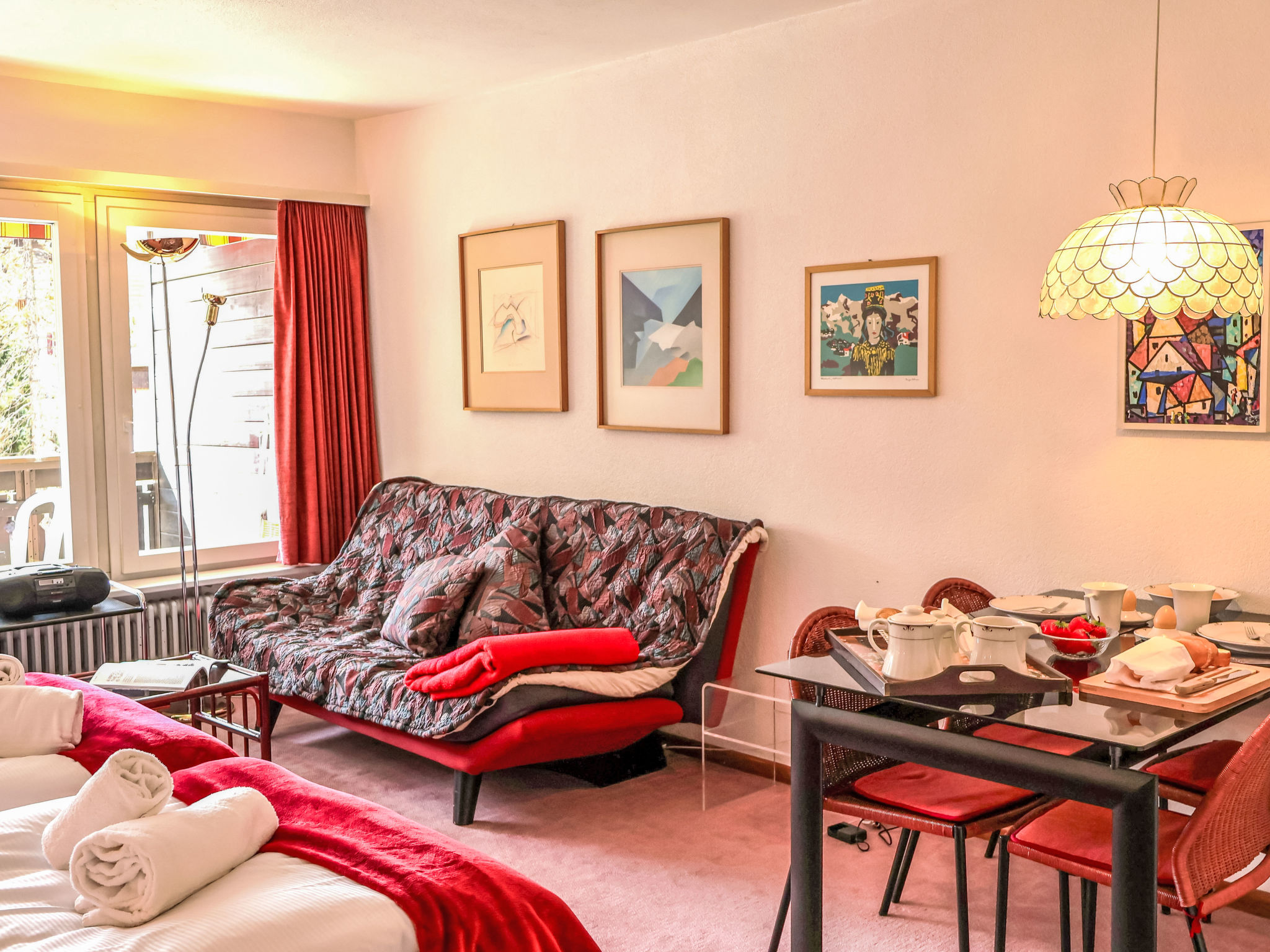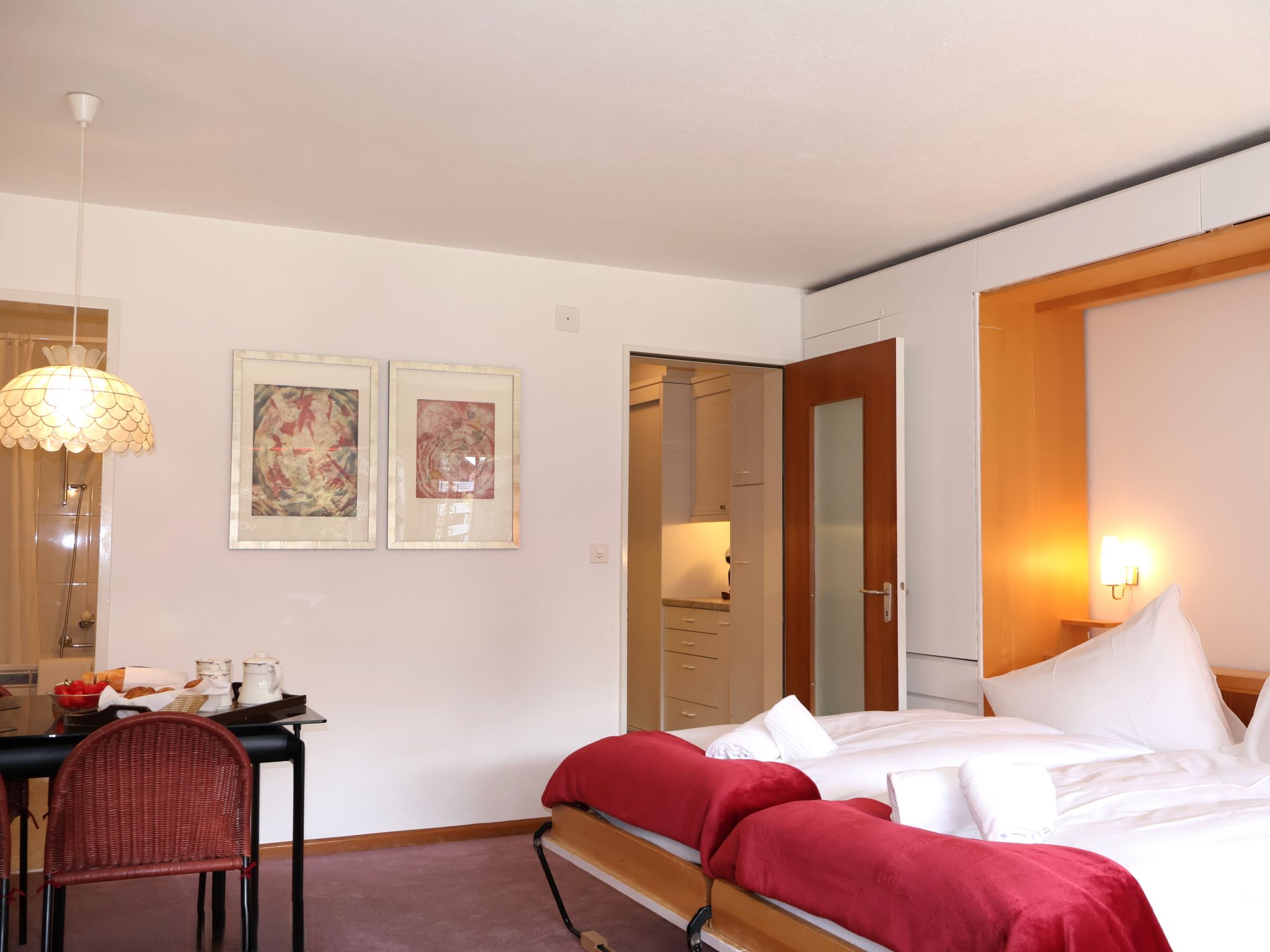 1-Zimmer-Wohnung 33 m2, Südlage. Hell, einfach und gemütlich eingerichtet: Wohn-/Schlafzimmer mit 2 Wandschrankbetten (90 cm, Länge 200 cm), Esstisch und Digital-TV. Ausgang zum Balkon, Richtung Süden. Küche (2 Kochplatten, Backofen, Geschirrspüler, Mikrowelle, Tiefkühler, elektrische Kaffeemaschine). Bad/WC. Heizung. Balkon, Südlage. Balkonmöbel. Schöne Sicht auf das Matterhorn. Bitte beachten: Nichtraucher-Unterkunft.