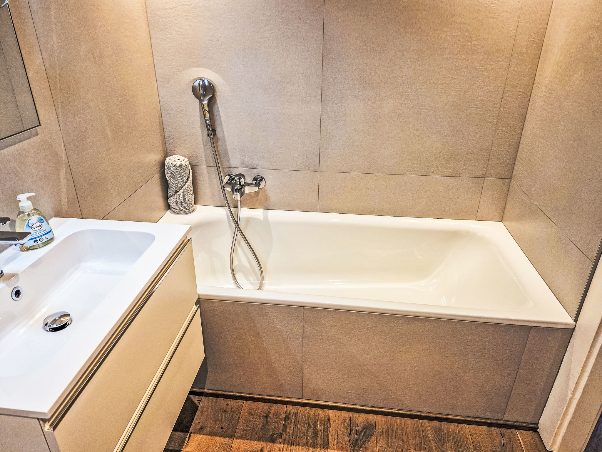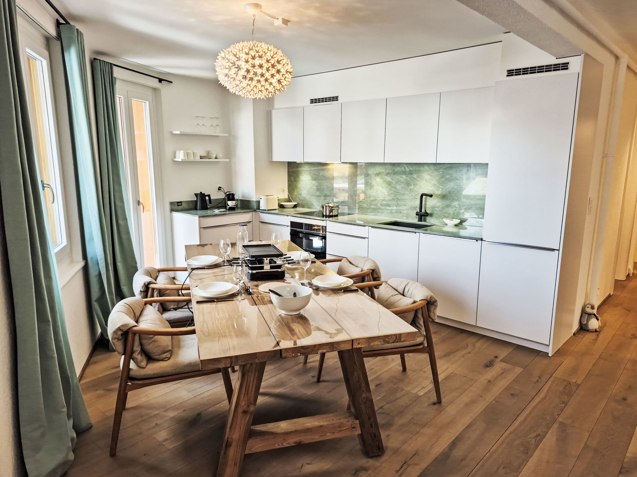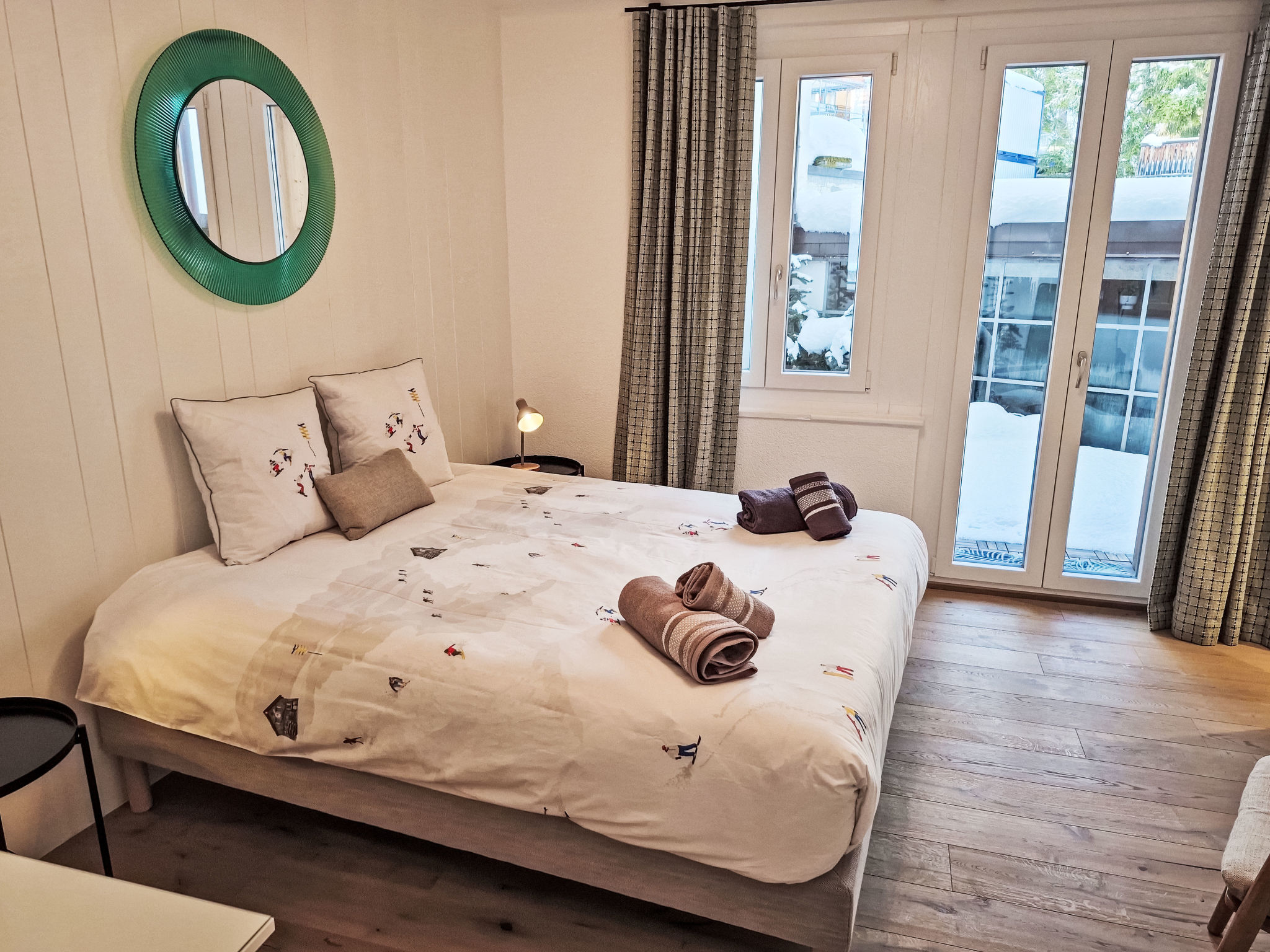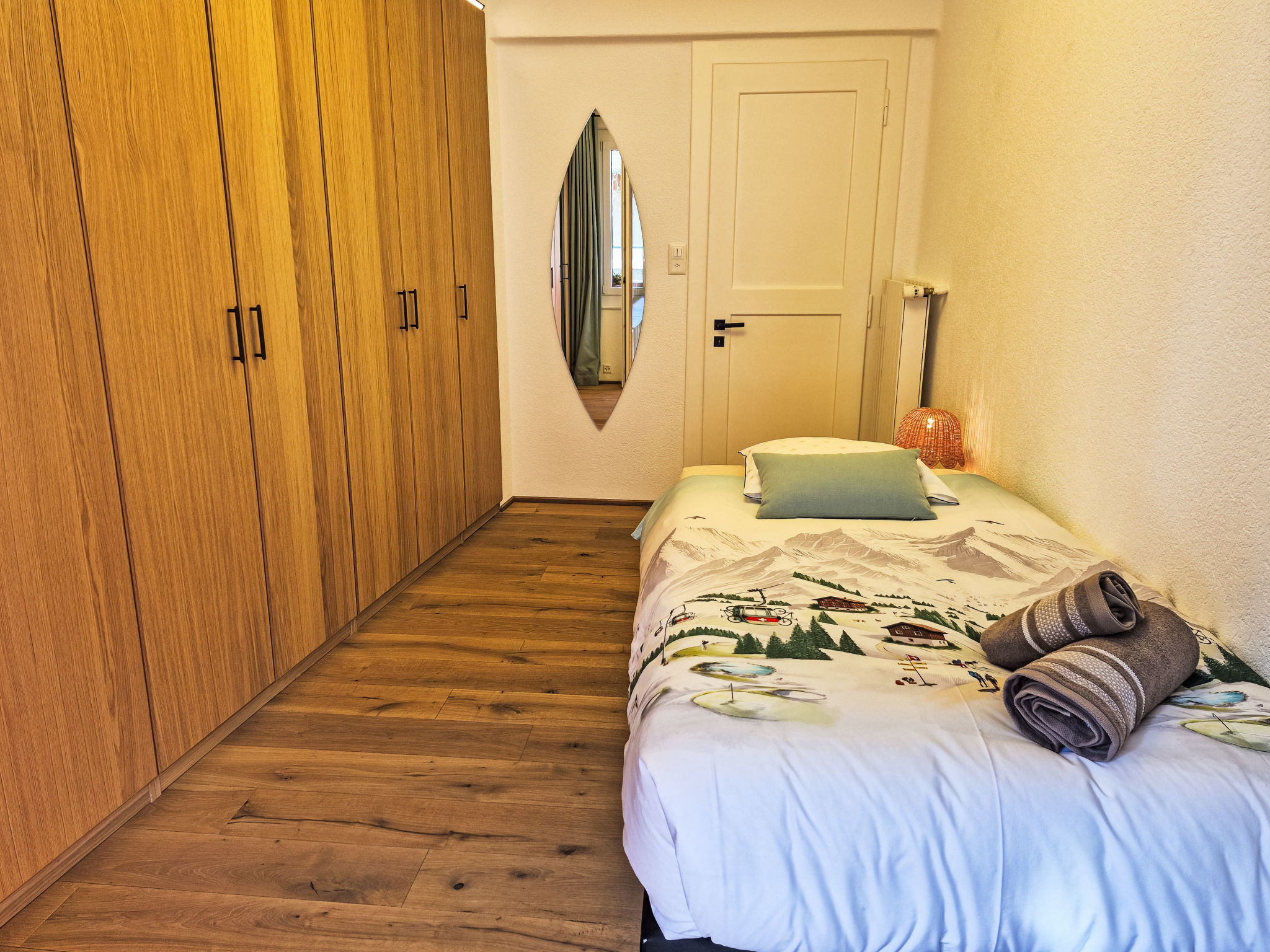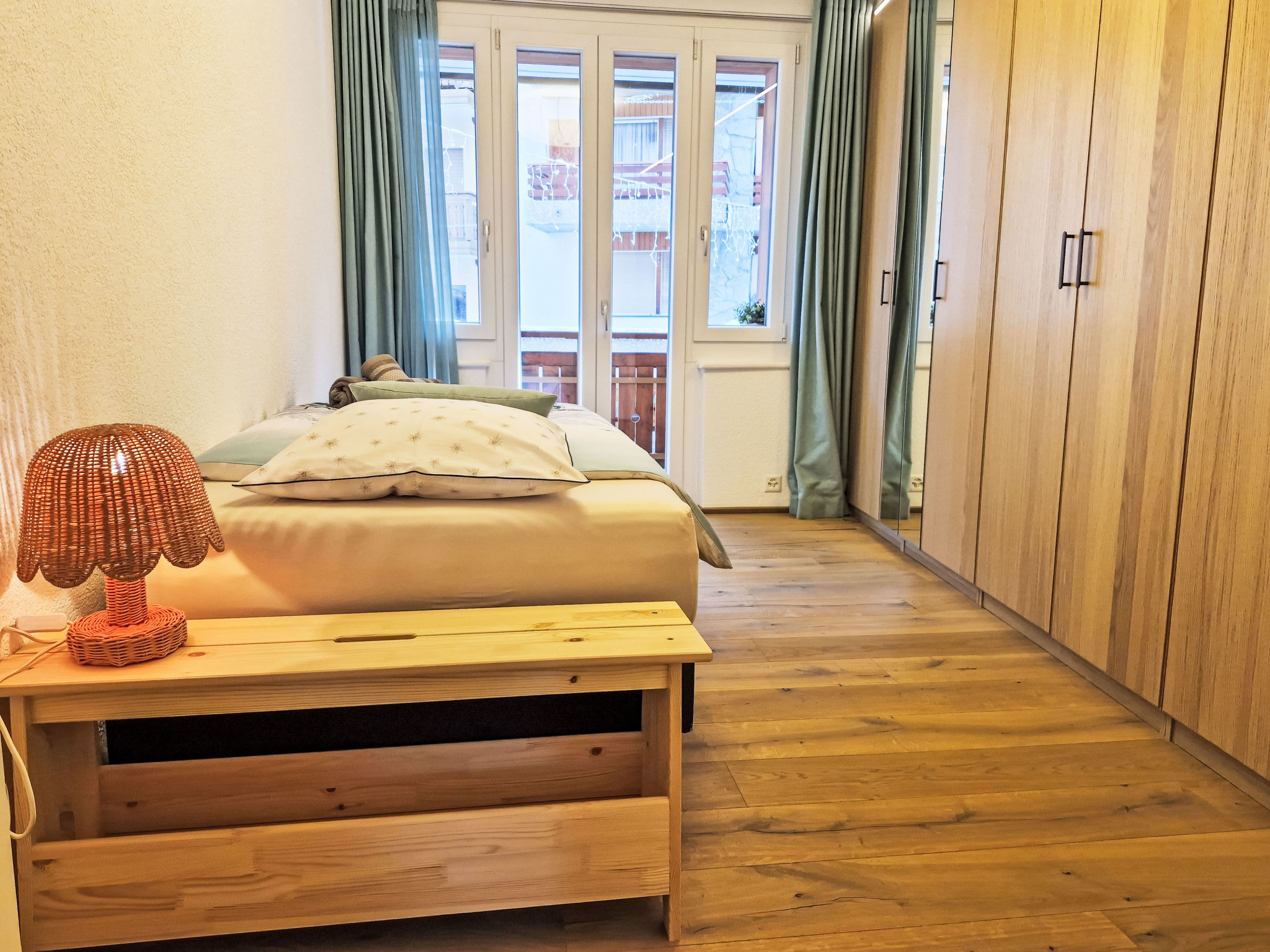 "Résidence Terrazza 1", 4-Zimmer-Wohnung 80 m2 im 1. Stock. Geräumig, teilweise renoviert, sehr komfortabel und geschmackvoll eingerichtet: grosses Wohn-/Esszimmer mit Kabel-TV. Ausgang zum Balkon. 1 Zimmer mit 1 Bett (100 cm, Länge 200 cm). Ausgang zum Balkon. 1 Zimmer mit 1 Bett (100 cm, Länge 200 cm). Ausgang zum Balkon. 1 grosses Zimmer mit 1 franz. Bett (160 cm, Länge 200 cm), Dusche/WC. Ausgang zur Terrasse, Richtung Norden. Grosse, offene Küche (Backofen, Geschirrspüler, 4 Induktionskochplatten, Wasserkocher, Tiefkühler, elektrische Kaffeemaschine, Kapseln für die Kaffeemaschine (Nespresso) extra, Racletteofen, Fondue Set (Käse)). Bad/WC. Grosser Balkon, Südostlage, kleine Terrasse, Nordlage. Balkonmöbel. Sicht auf die Landschaft. Zur Verfügung: Bügeleisen, Haartrockner. Internet (WLAN, gratis). Garage Nr. 2 (1 Auto), Höhe 230 cm, Breite 260 cm. Bitte beachten: Nichtraucher-Unterkunft. Die Wohnung verfügt außerdem über einen Keller, in dem sich ein Heimtrainer befindet.