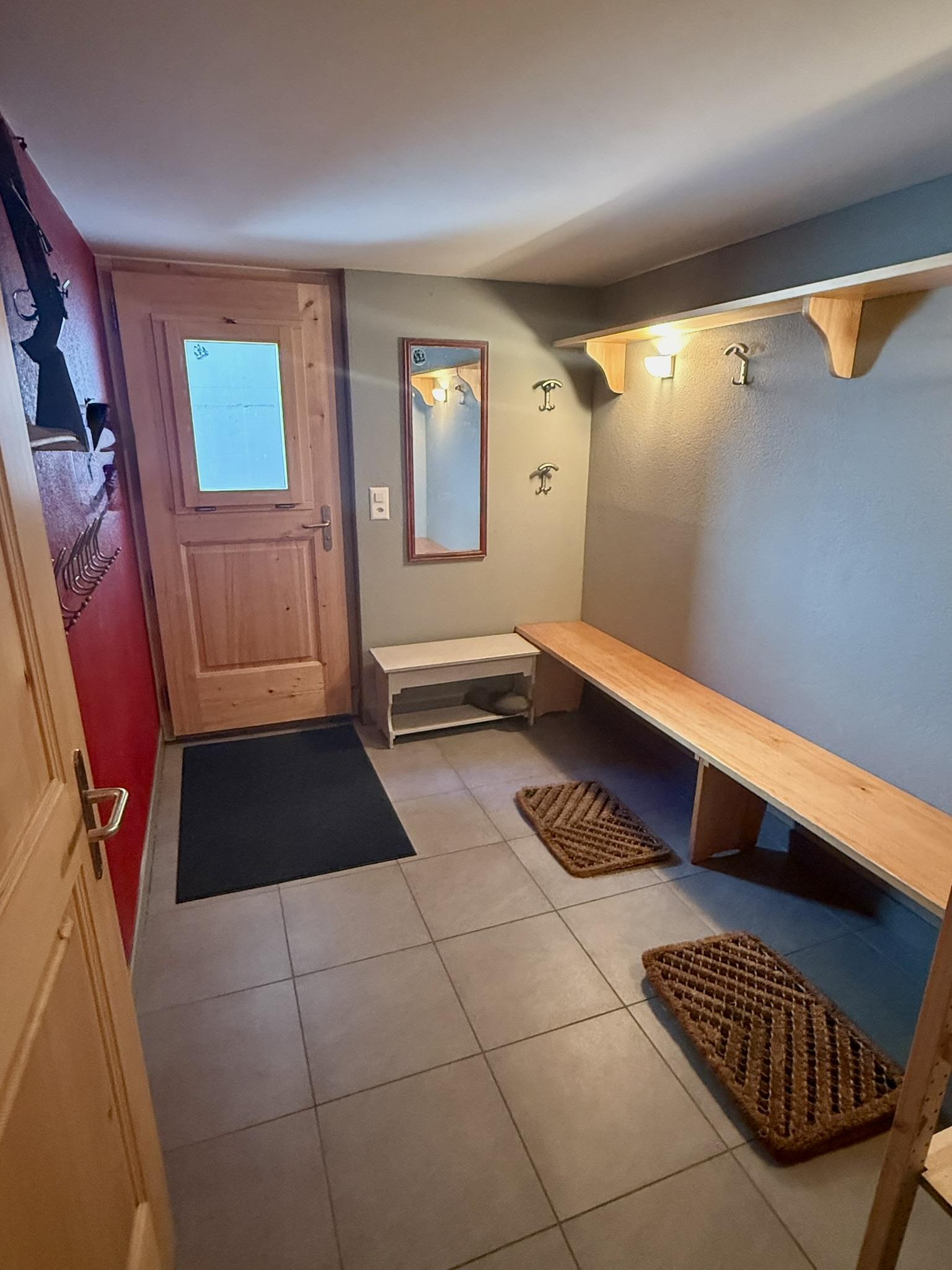 Innen erwartet Sie eine freundliche, warme Einrichtung mit Holz- und Naturtönen, vermutlich mit gemütlichem Wohnbereich, offenem Ess-/Küchenbereich und mehreren Schlafzimmern – sodass Familien und kleinere Gruppen sich wohlfühlen können. Ein Balkon oder Sitzplatz im Freien lädt ein, den Sonnenuntergang und die Bergwelt zu genießen.