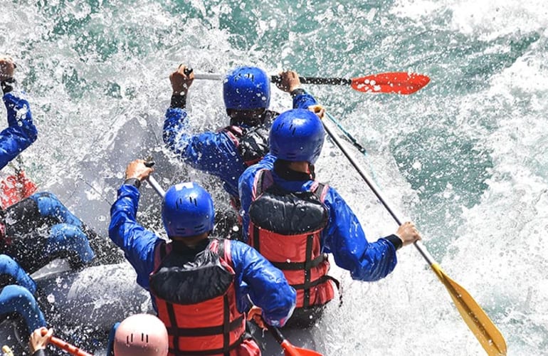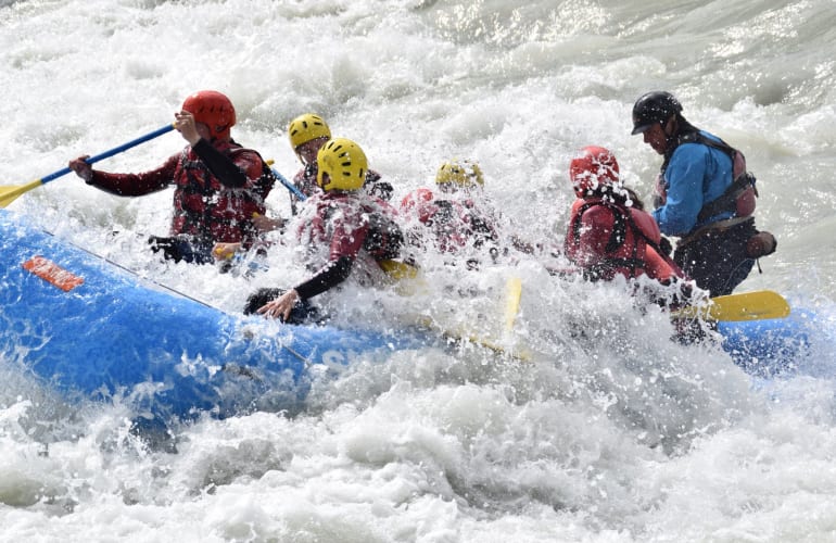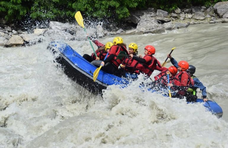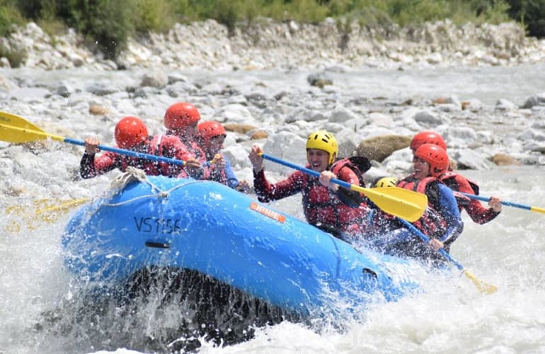 For your safety, the guide will accompany you in the raft and will be present throughout the adventure to advise and assist you. This rafting trip on the Rhône takes you along the section of the river between Susten and Sierre (approx. 10 km). For 1h to 1h15, you'll glide along the currents of the Rhône with your loved ones. Paddling together, you'll be more united than ever, sharing a fun and refreshing time on class II to III rapids! All around you, the magnificent scenery of the Rhône valley will unfold, providing a magical backdrop to this rafting excursion near Sierre.