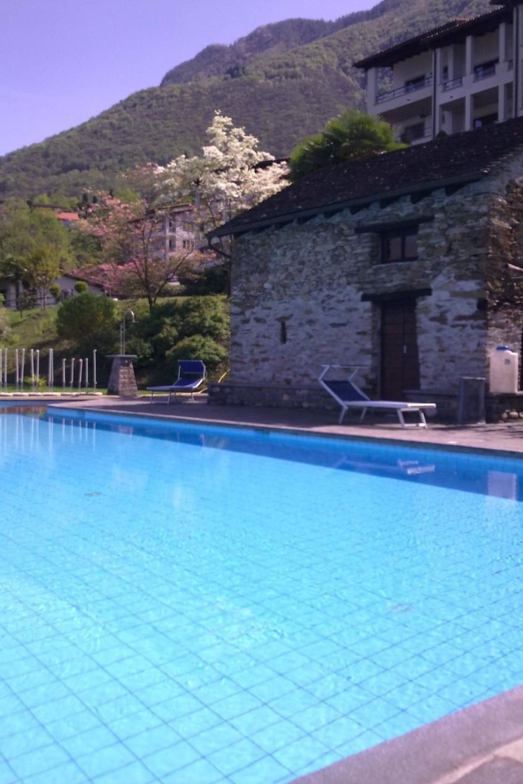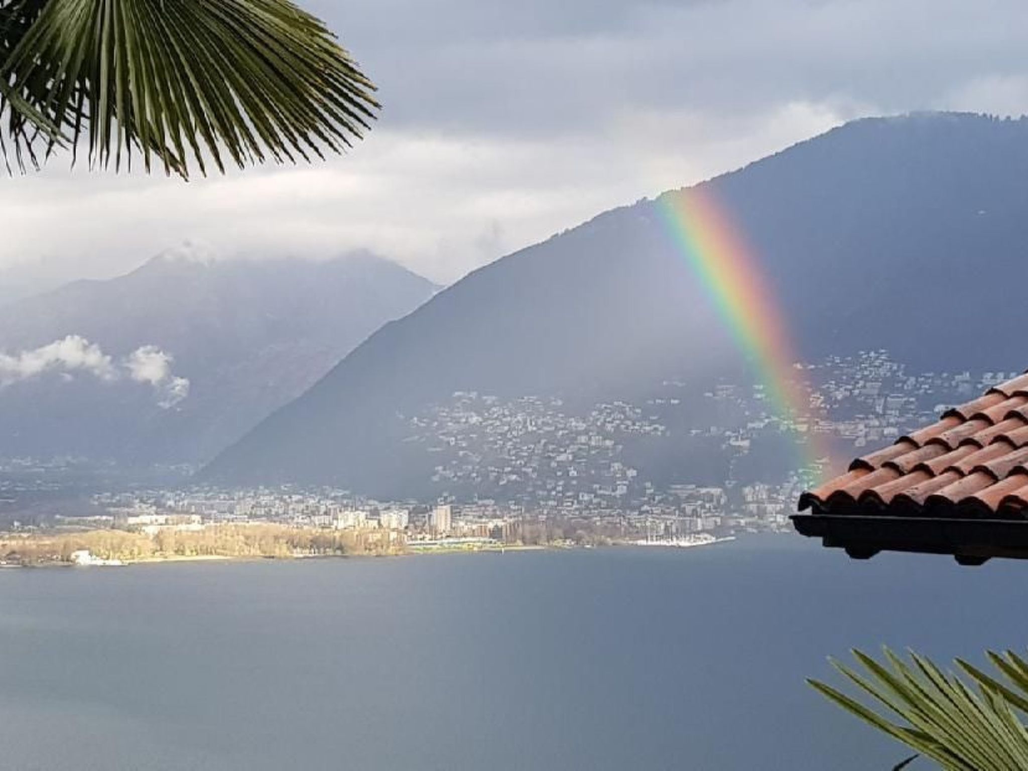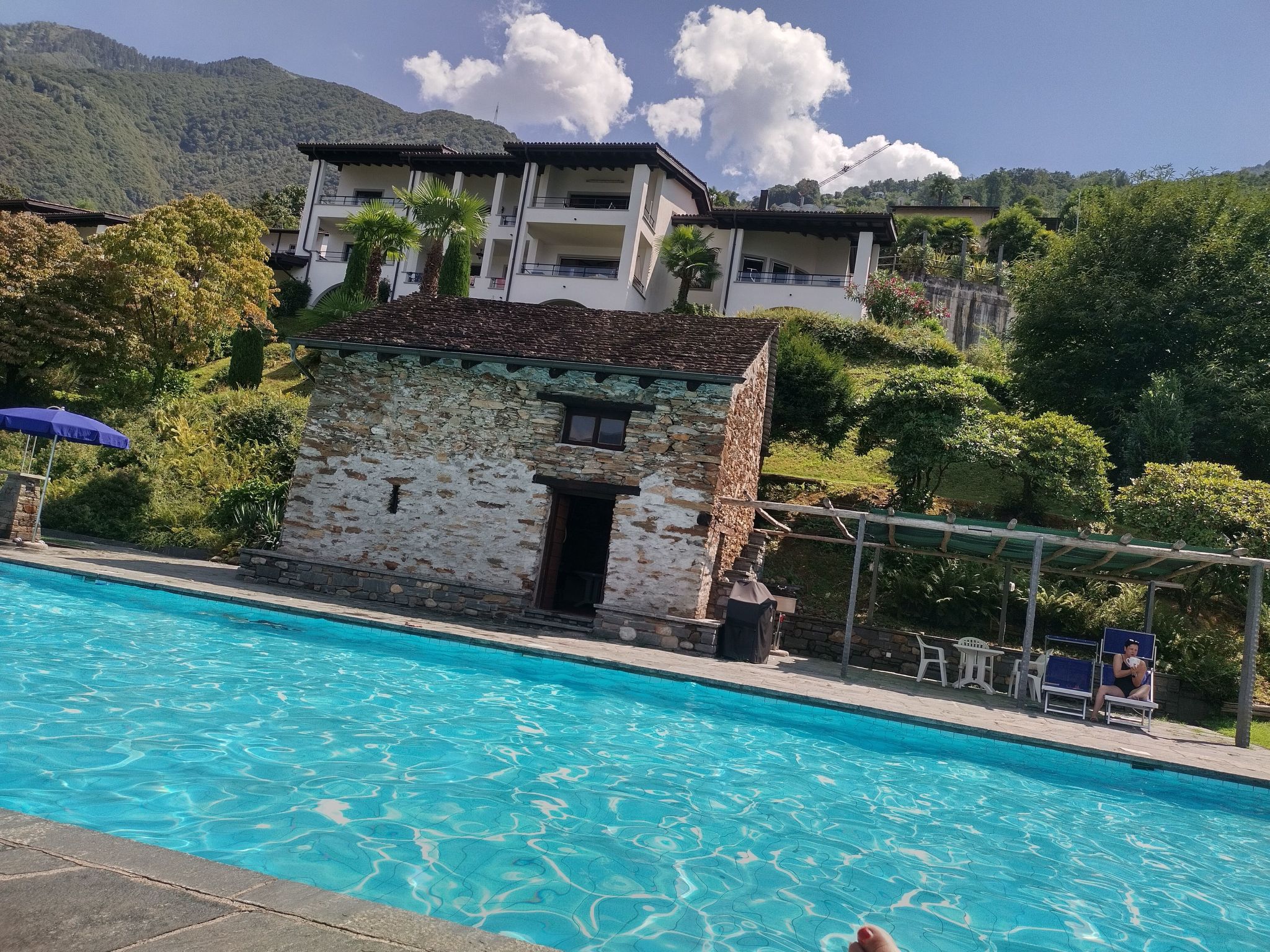 Beautiful holiday flat with TOP view in a small paradise with pool. The one-room flat is located in a park-like, secluded property above Vira with its own swimming pool, rustico, spacious sunbathing lawn and panoramic views of Lake Maggiore and Locarno, fitness room, chess board and playground. The perfect place for rest and relaxation. With its old churches and narrow streets, Gambarogno has largely retained the character of the past. The covered balcony offers a magnificent view of Lake Maggiore and Locarno at any time of day. The fully furnished flat is located on the 2nd floor, without lift, in Casa Fiona of the very well-maintained Residenza Viramonte. The Residenza Viramonte consists of 6 houses on a well-kept hillside plot of approx. 16000 m2. Each house has a heat pump for hot water and heating. The flat itself is 46 m2 and has new windows with triple glazing. The beds are made and the bathroom and kitchen linen are laid out. Please bring your own large towels for the pool and beach.