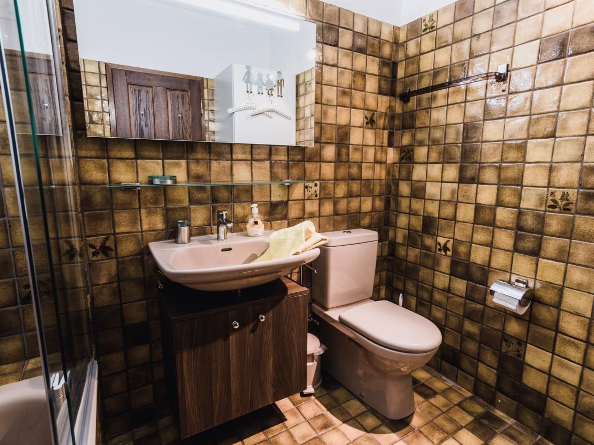Bathroom with bathtub and shower curtain, hairdryer, cleaning cupboard with hoover and damp mop, toilet paper, broom, small broom and shovel, shoe polish brushes, cleaning products.
